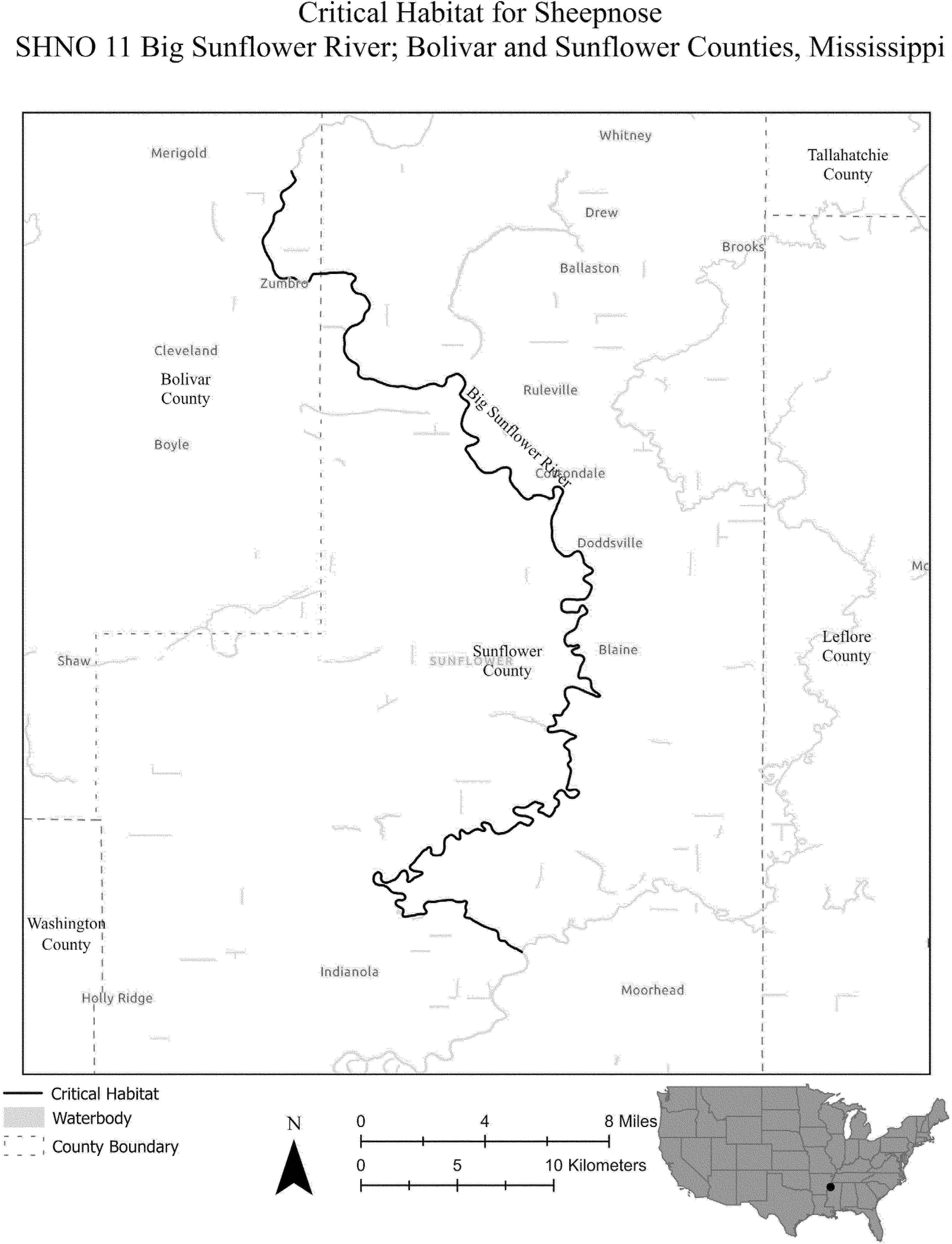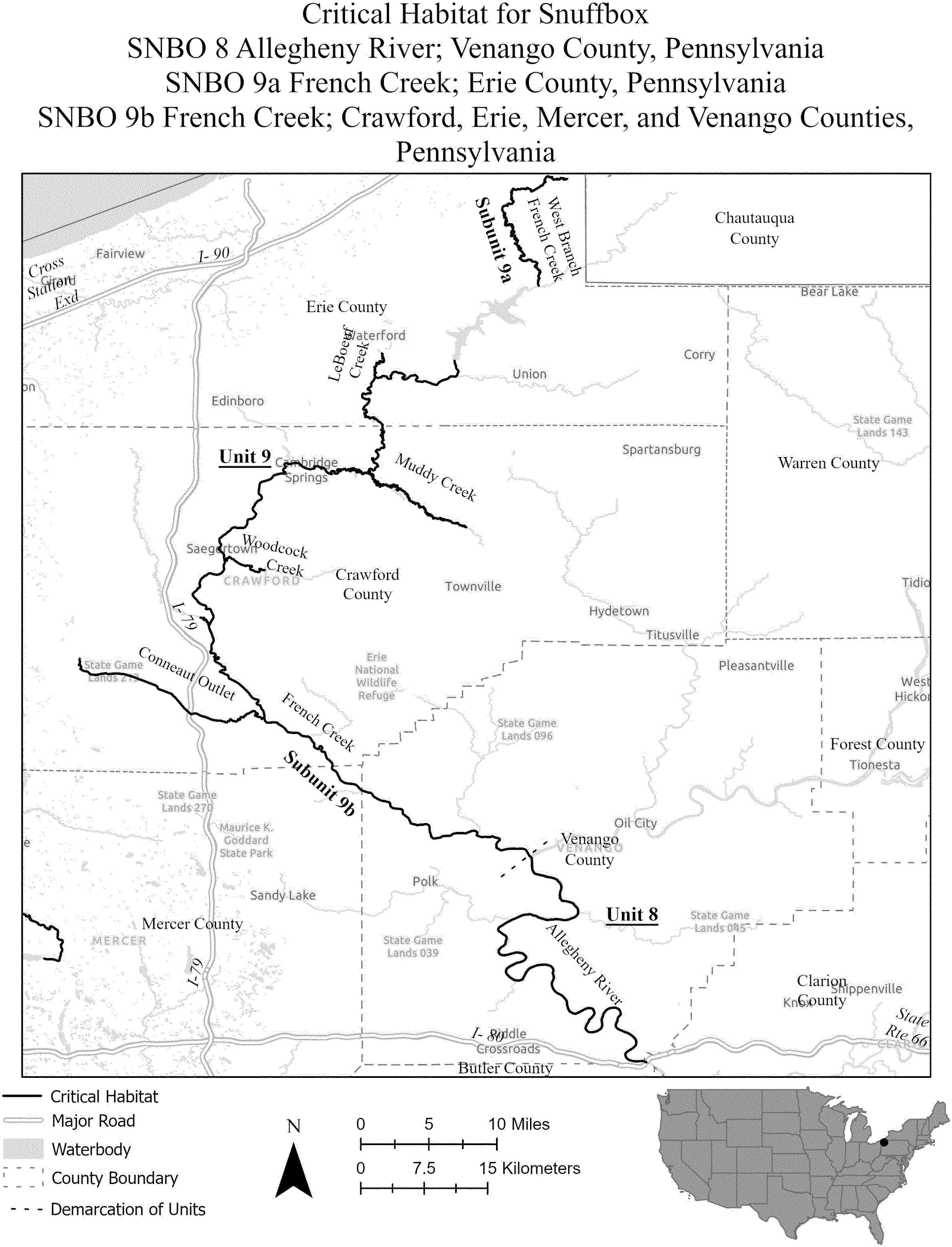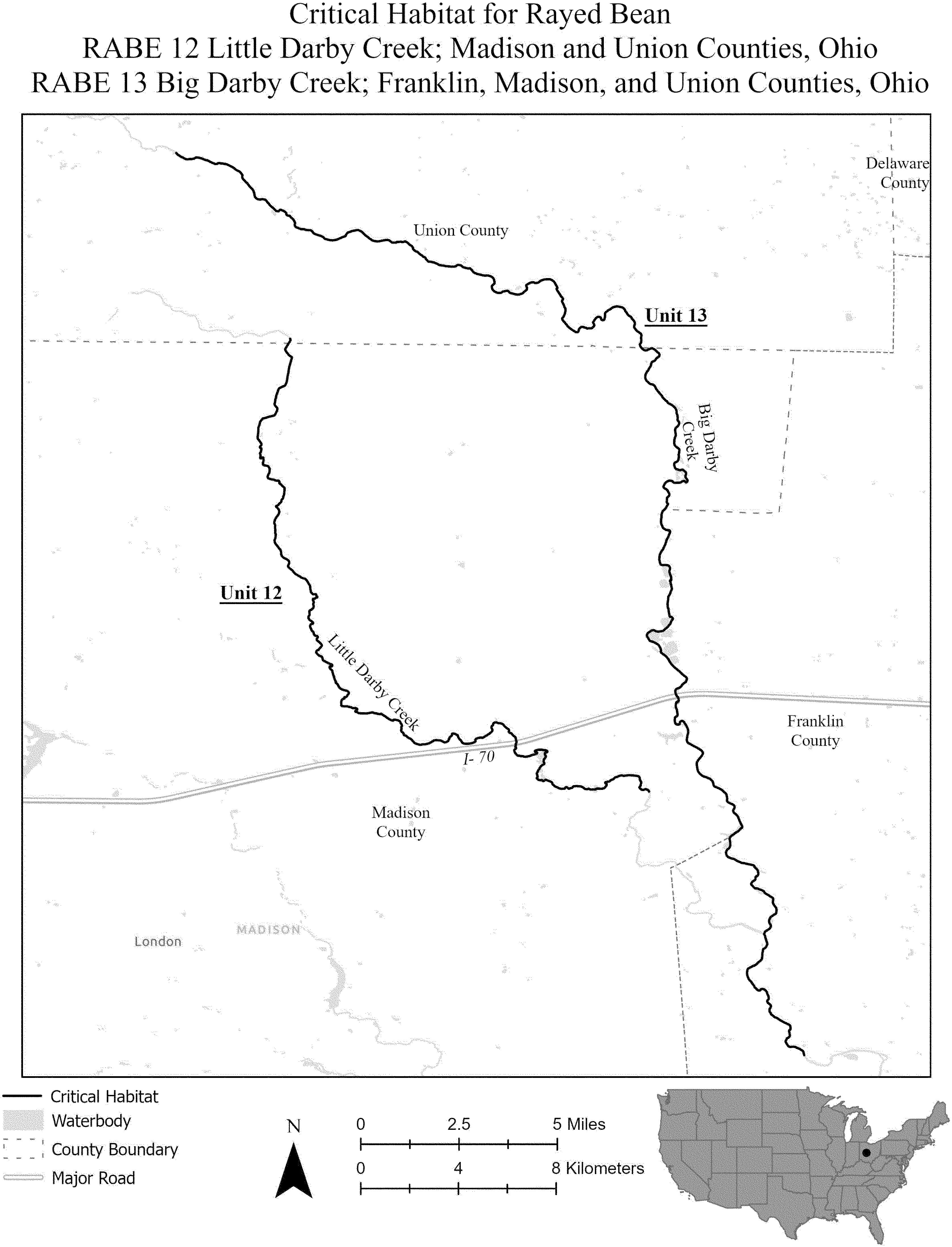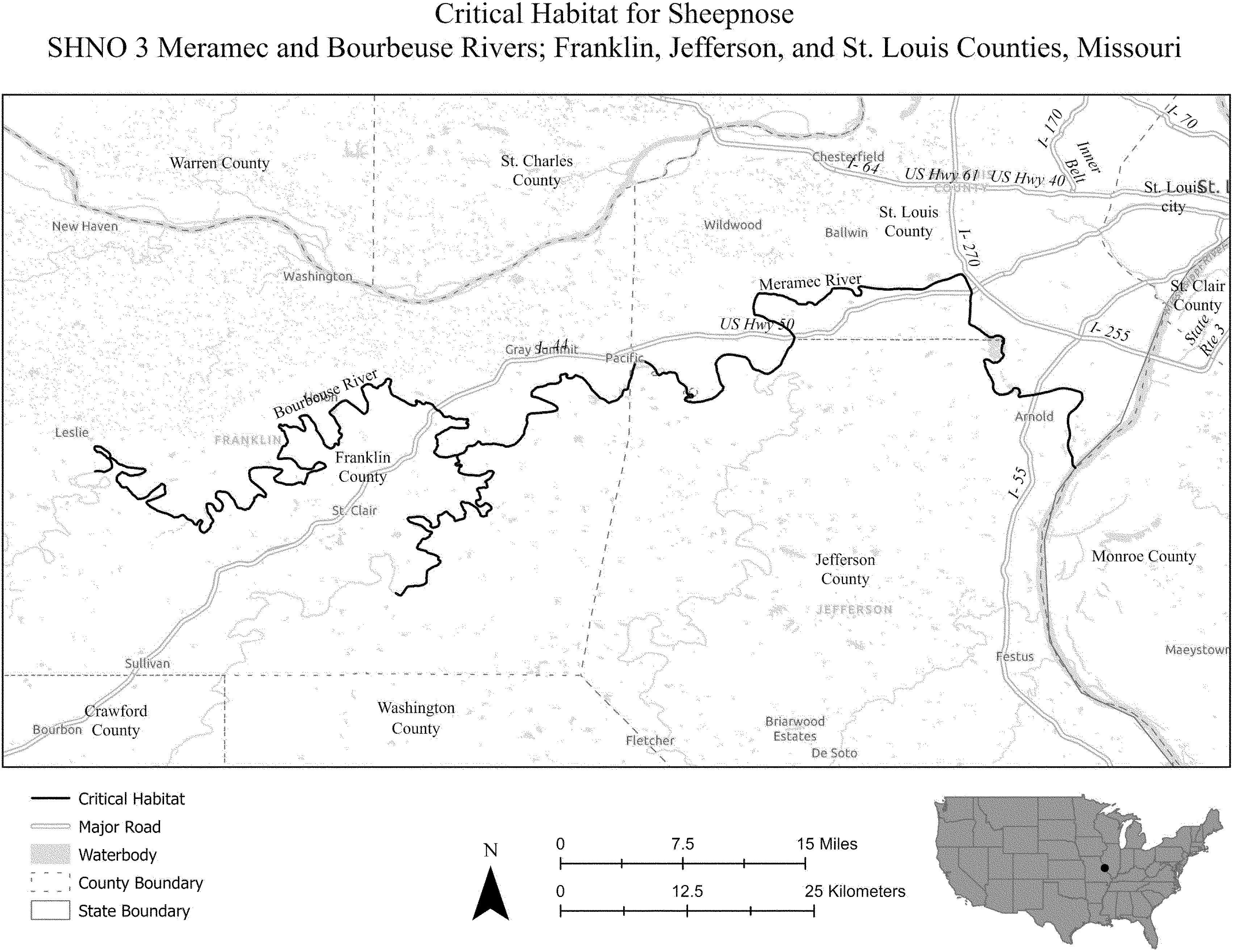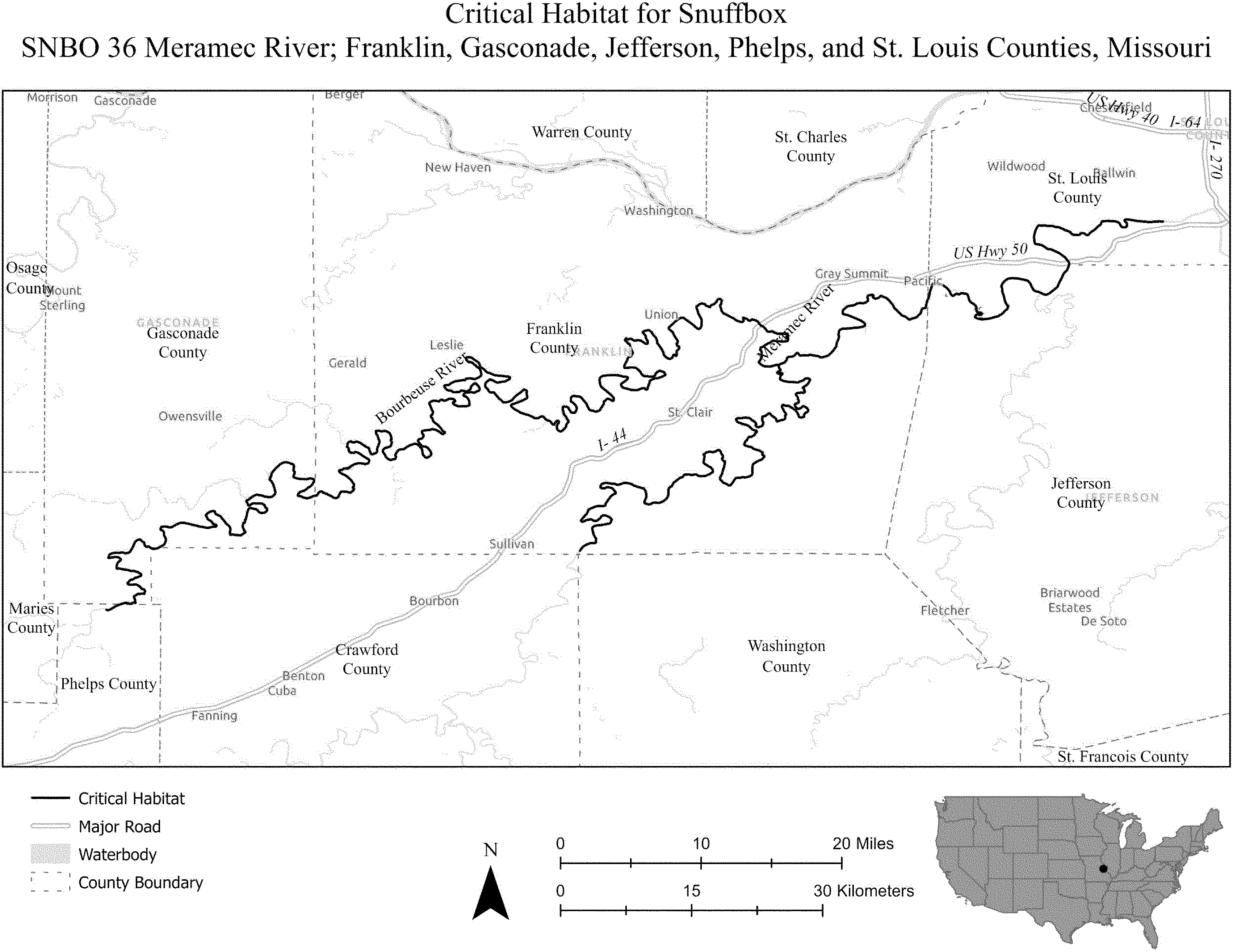 (i) SNBO 36 consists of 227 rmi (365 rkm) of the Meramec River and the Bourbeuse River in Saint Louis, Jefferson, Phelps, Gasconade, and Franklin Counties, Missouri. The unit includes the river channel up to the ordinary high-water mark.