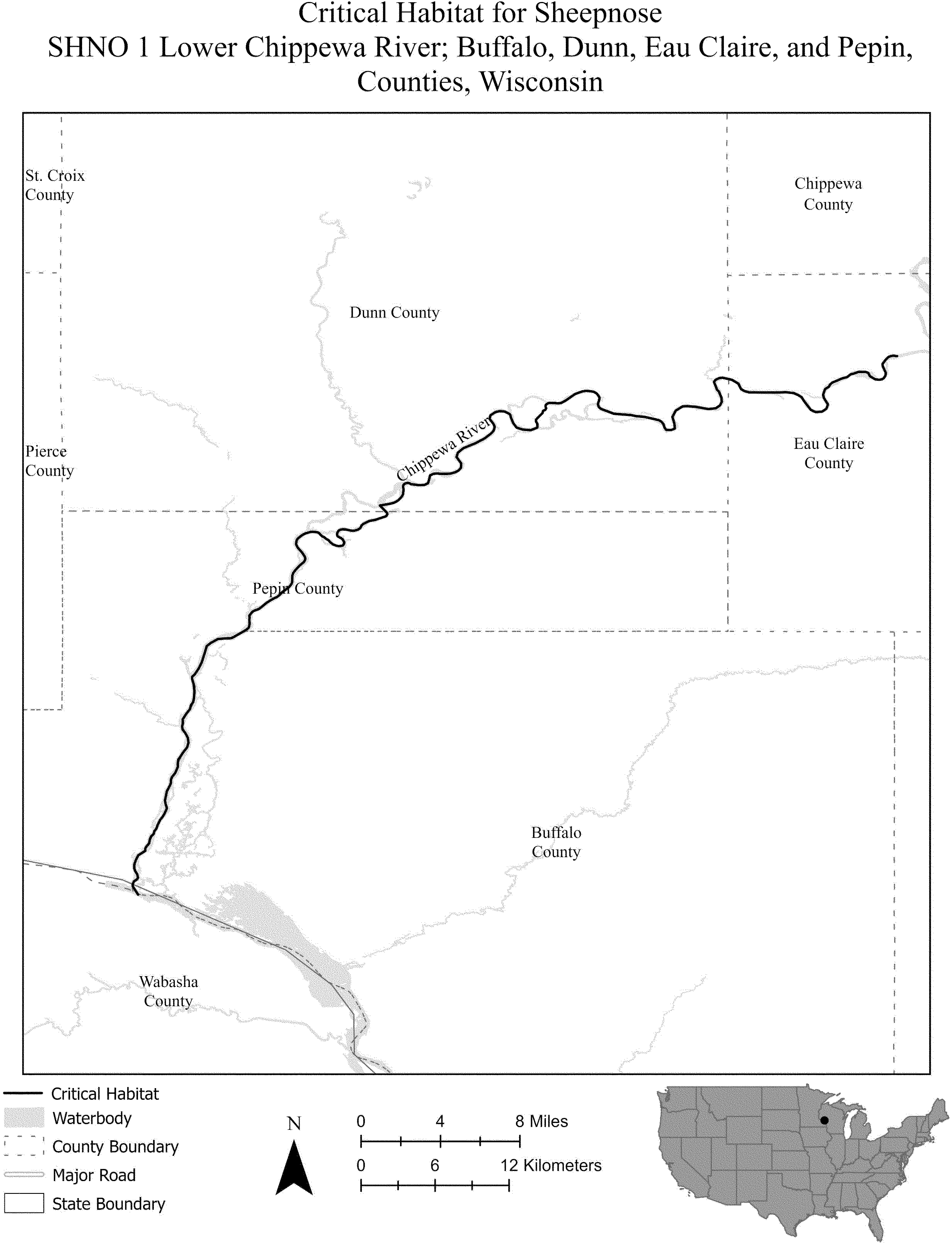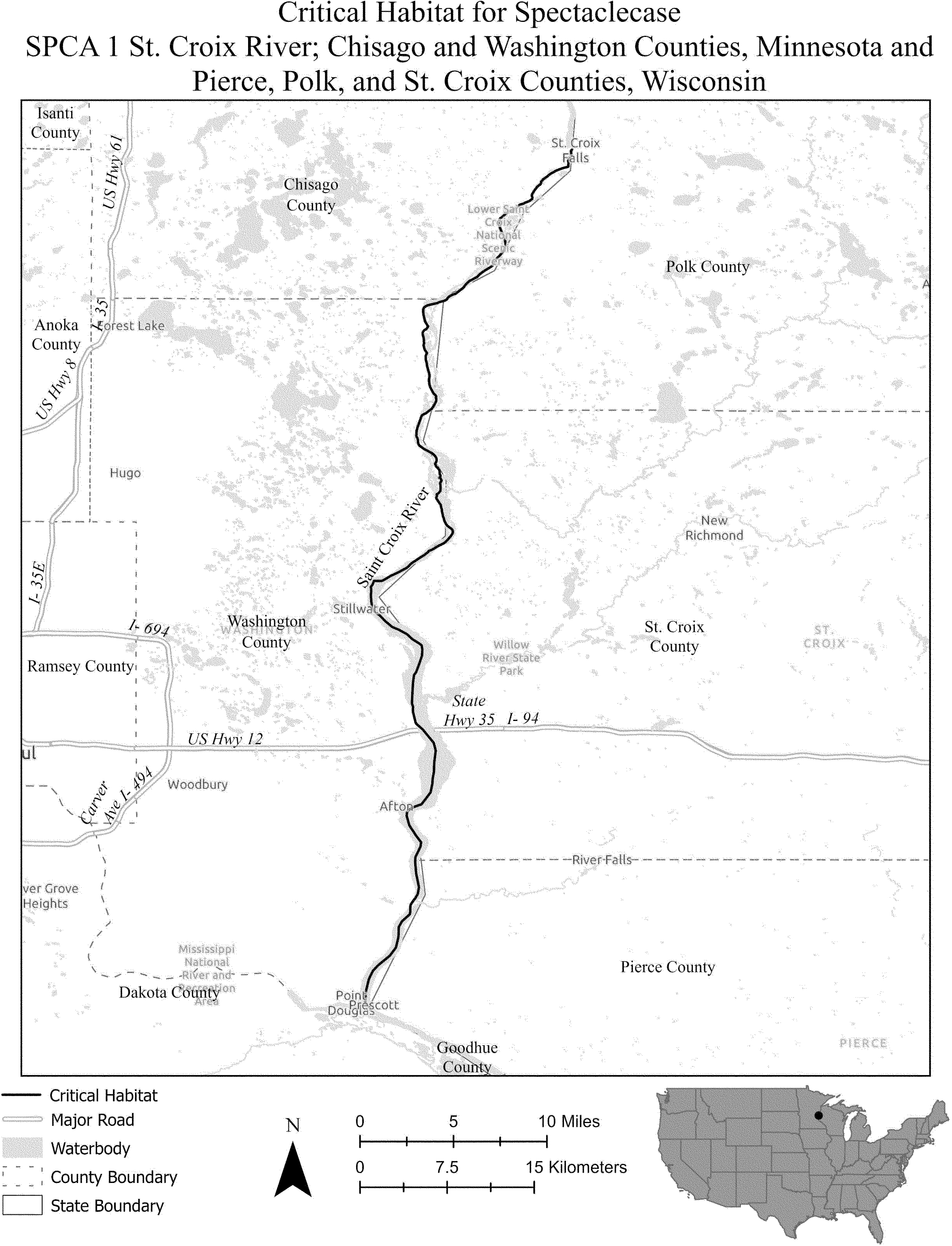 (i) SPCA 1 is on the border between the States of Minnesota and Wisconsin and consists of 53 river miles (rmi) (86 river kilometers (rkm)) of the St. Croix River in Chisago and Washington Counties, Minnesota, and Polk, St. Croix, and Pierce Counties, Wisconsin. This unit extends from the downstream side of St. Croix Falls dam at the city of St. Croix Falls (Polk County, Wisconsin) downstream to its confluence with the Mississippi River at the city of Prescott (Pierce County, Wisconsin). The unit includes the river channel up to the ordinary high-water mark.