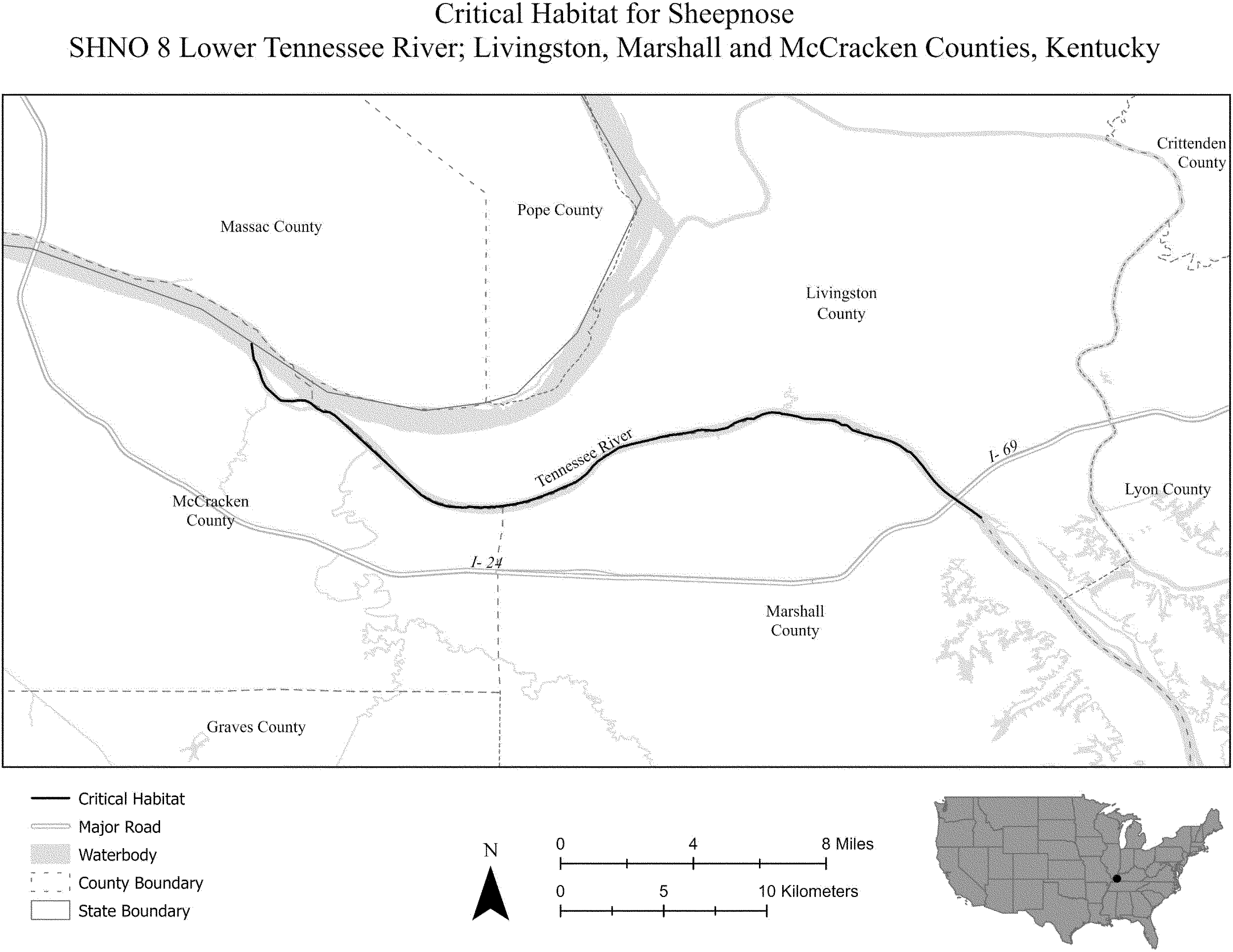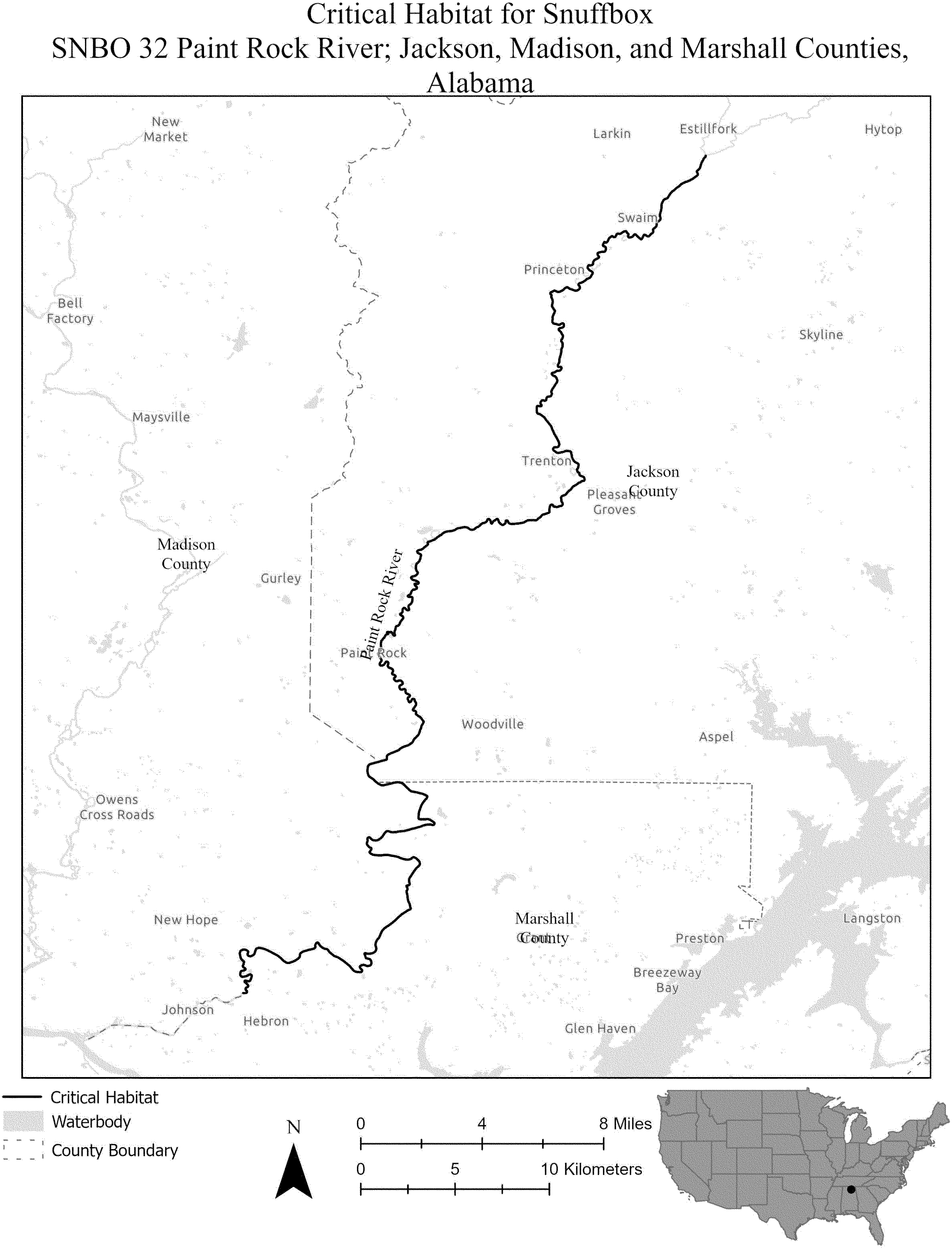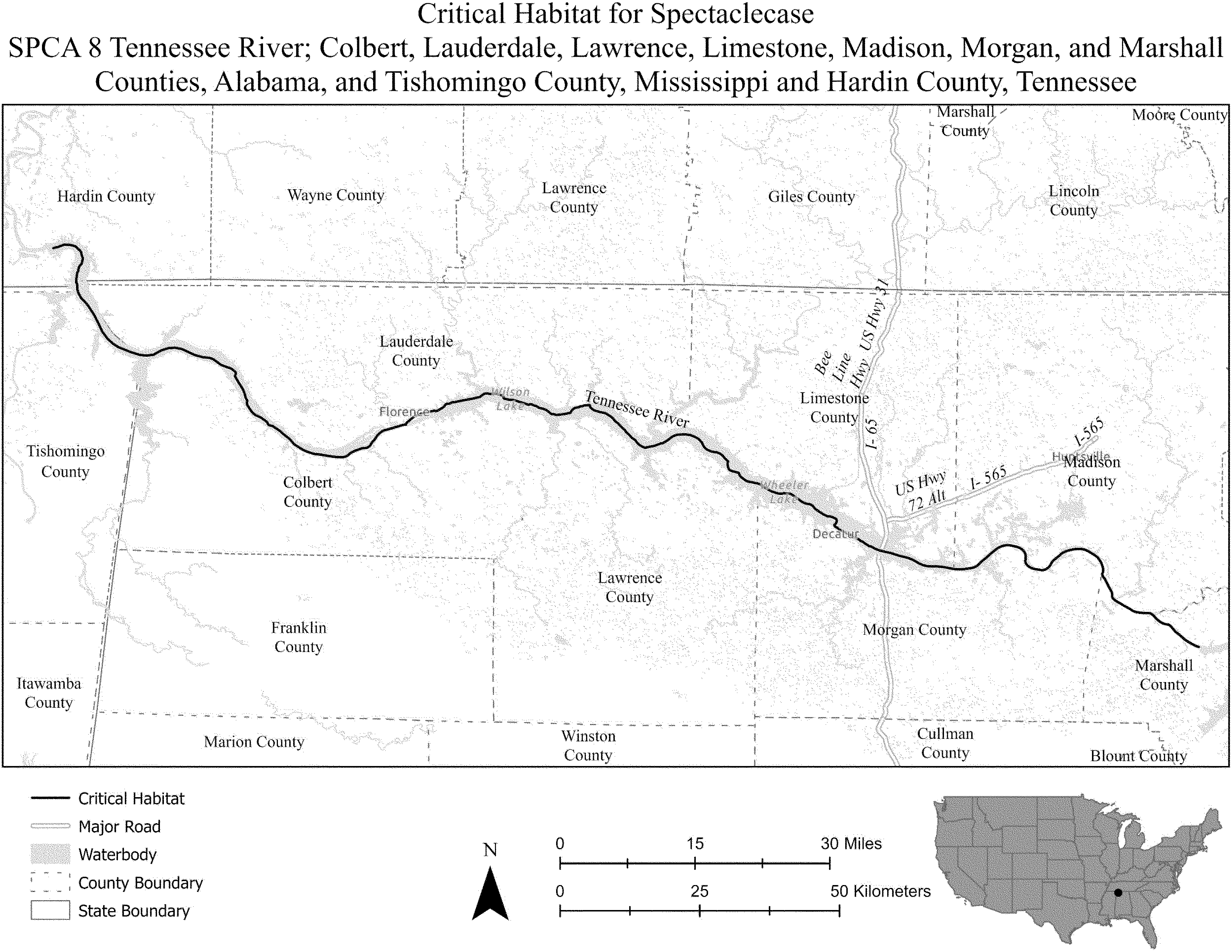 (i) SPCA 8 consists of 142 rmi (228 rkm) of the Tennessee River in Marshall, Madison, Morgan, Lawrence, Lauderdale, Limestone, and Colbert Counties, Alabama; Tishomingo County, Mississippi; and Hardin County, Tennessee. The unit extends from the downstream side of Guntersville Dam at the city of Guntersville (Marshall County, Alabama) downstream to Pickwick Landing Dam at the unincorporated community of Counce (Hardin County, Tennessee). The unit includes the river channel up to the ordinary high-water mark.