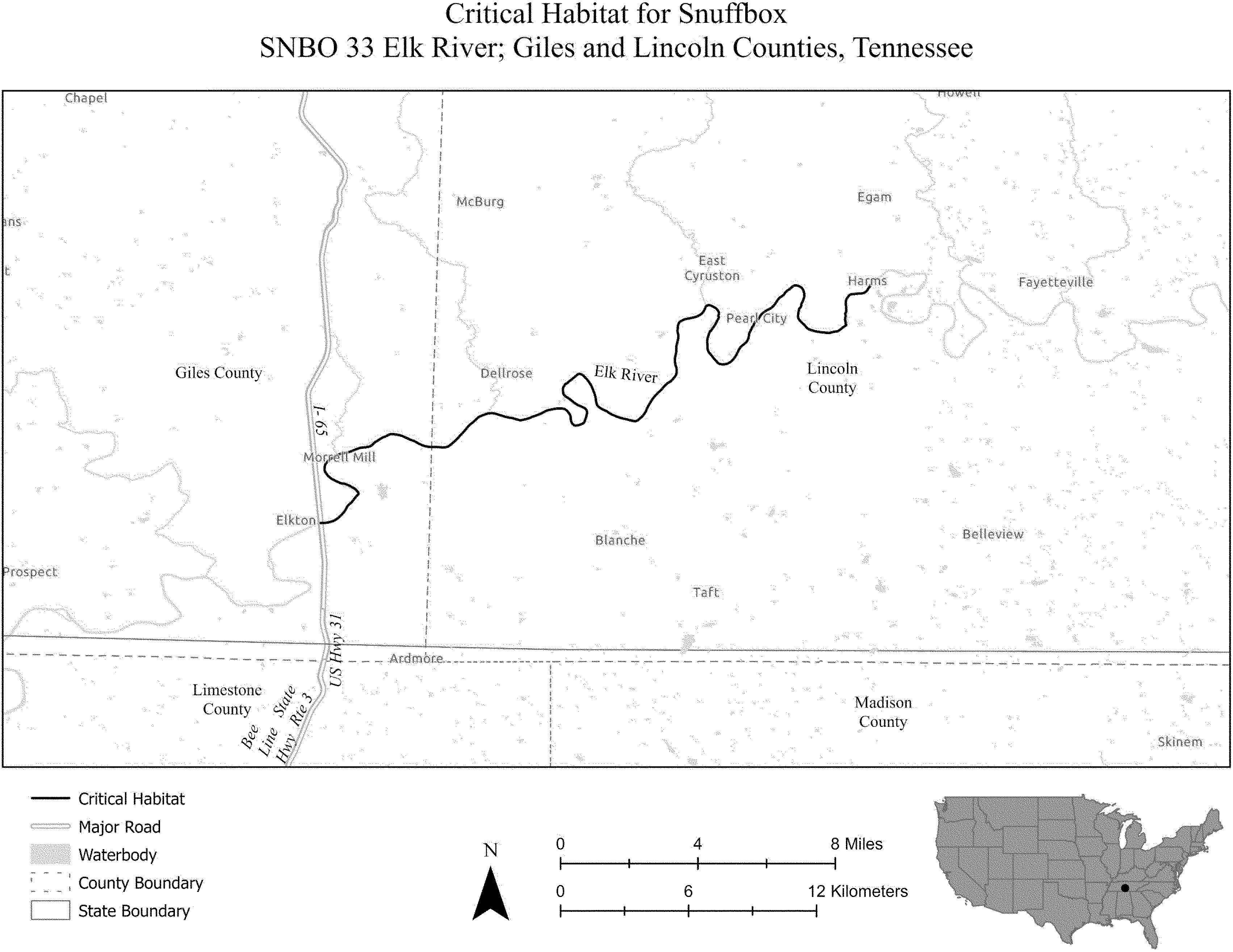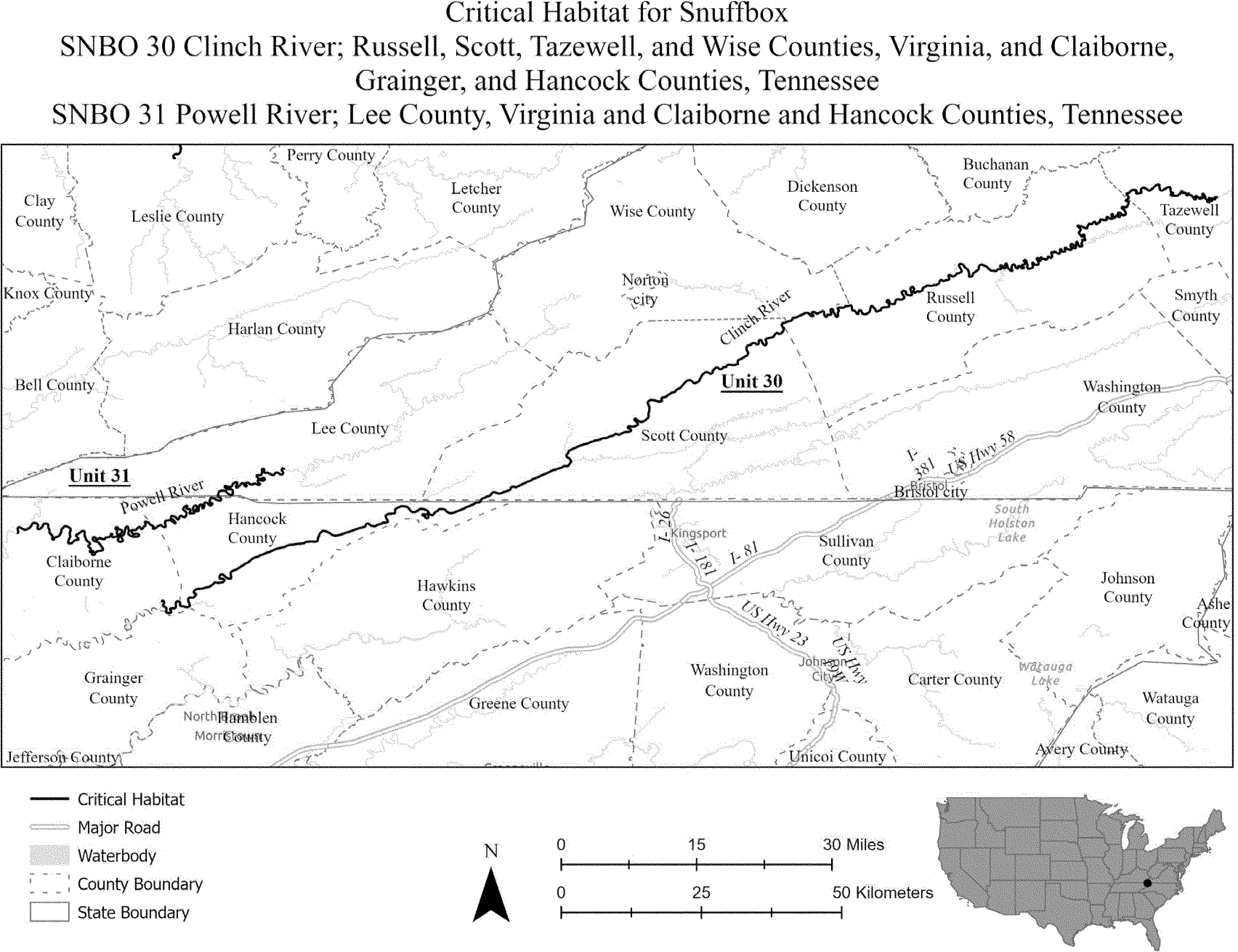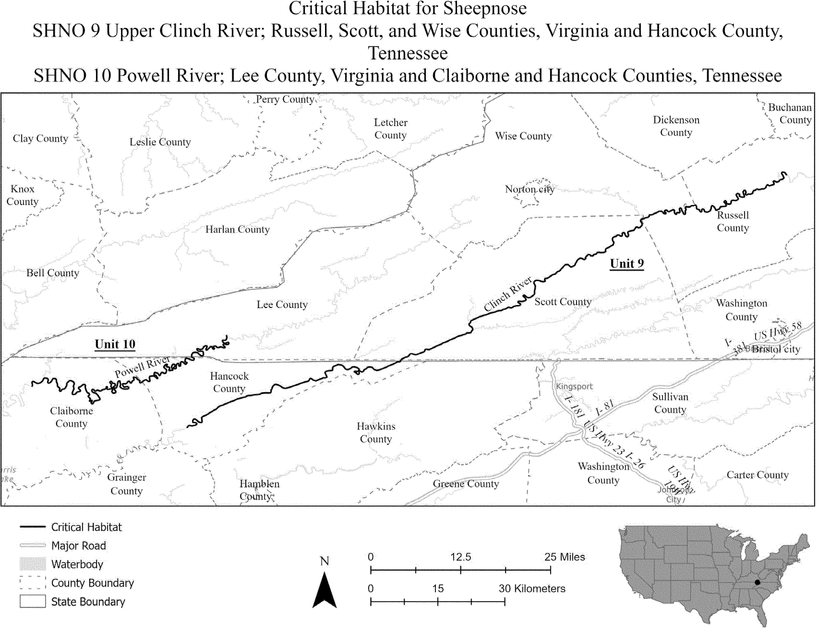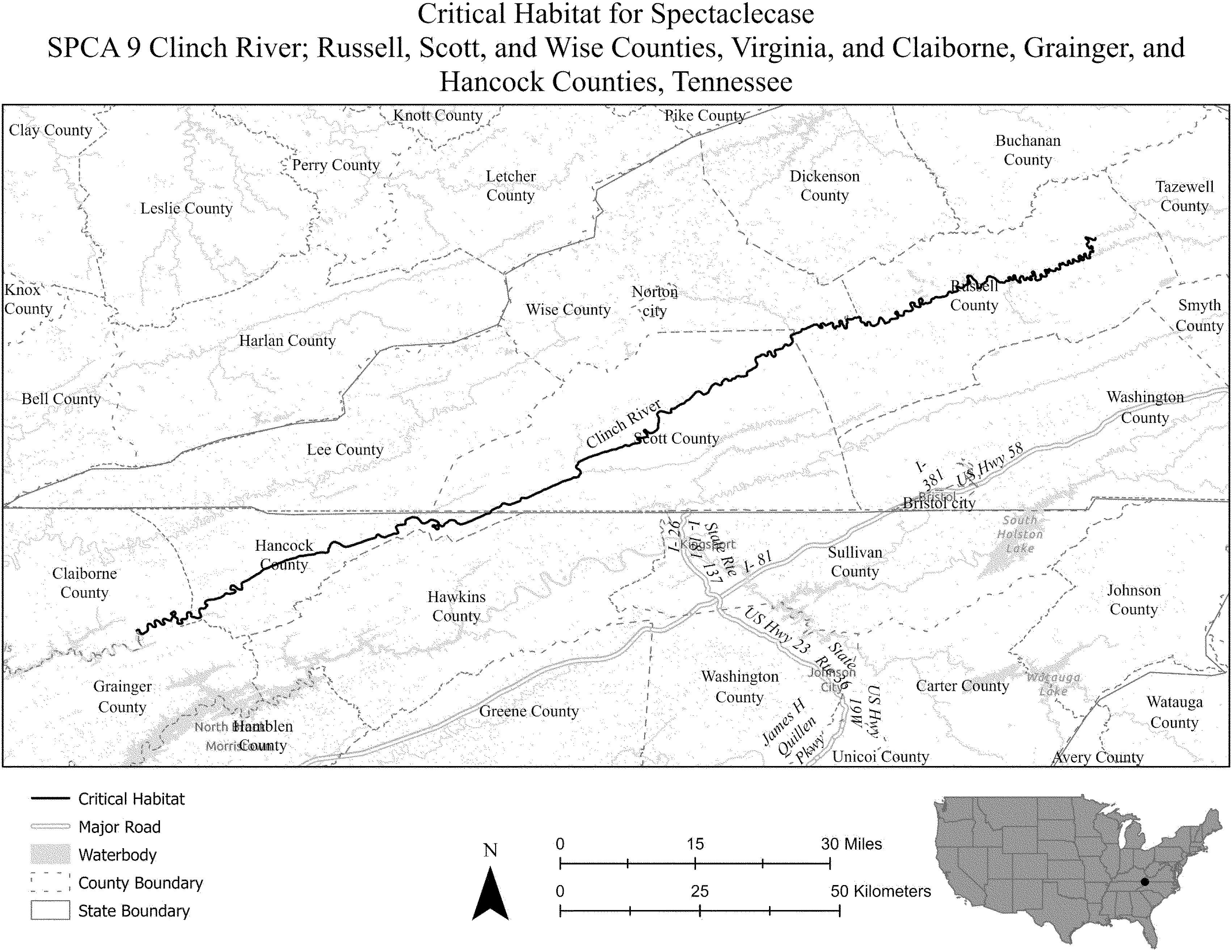(i) SPCA 9 consists of 160 rmi (257 rkm) of the Clinch River in Russell, Wise, and Scott Counties, Virginia, and Hancock, Claiborne, and Grainger Counties, Tennessee. Critical habitat is located on the downstream side of the bridge at Kents Ridge Road at the unincorporated community of Swords Creek (Russell County, Virginia) and extends downstream to the Highway 25E bridge near the town of Tazewell (Claiborne County, Tennessee). The unit includes the river channel up to the ordinary high-water mark.