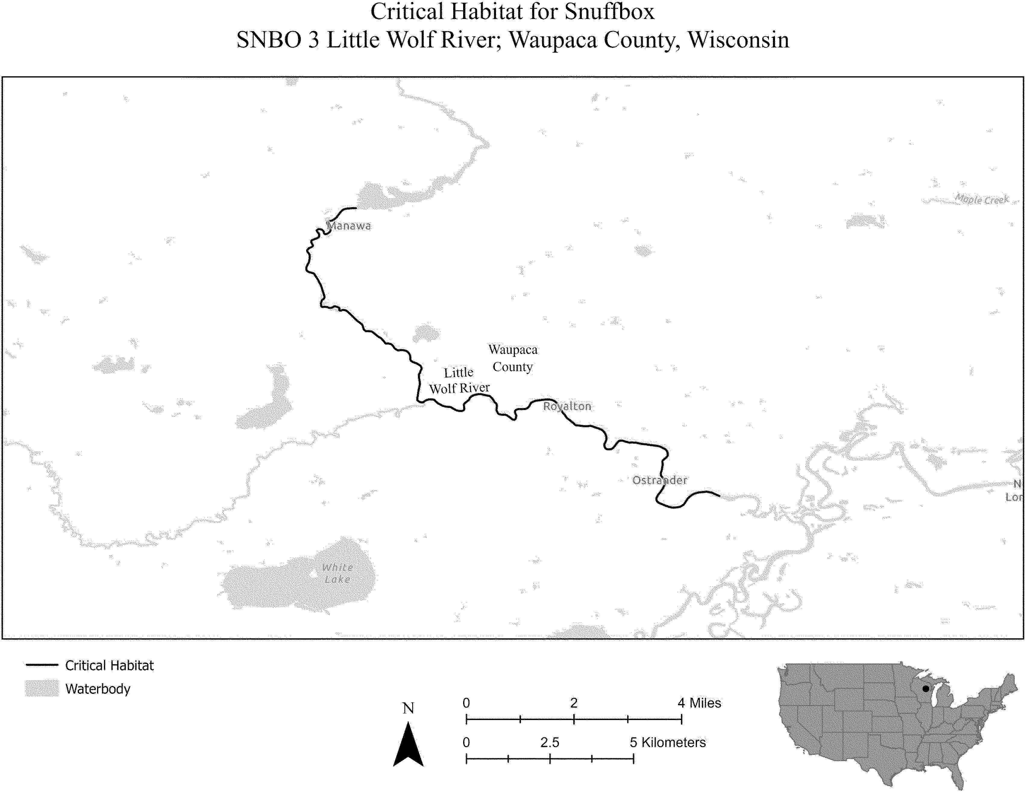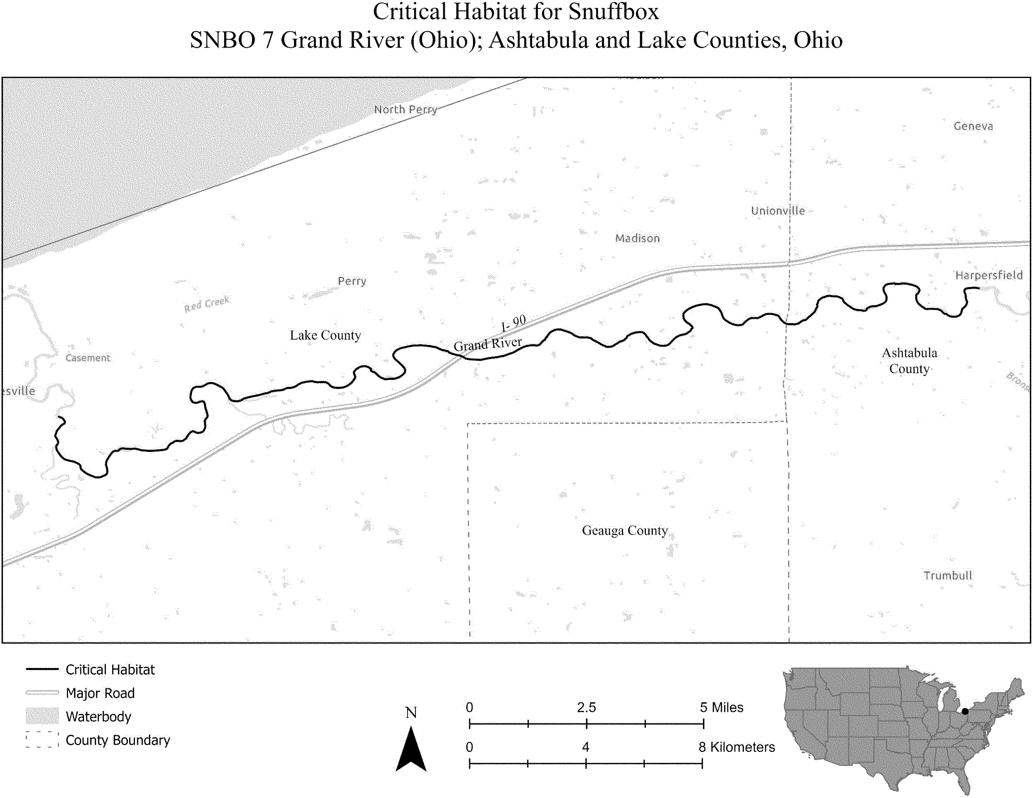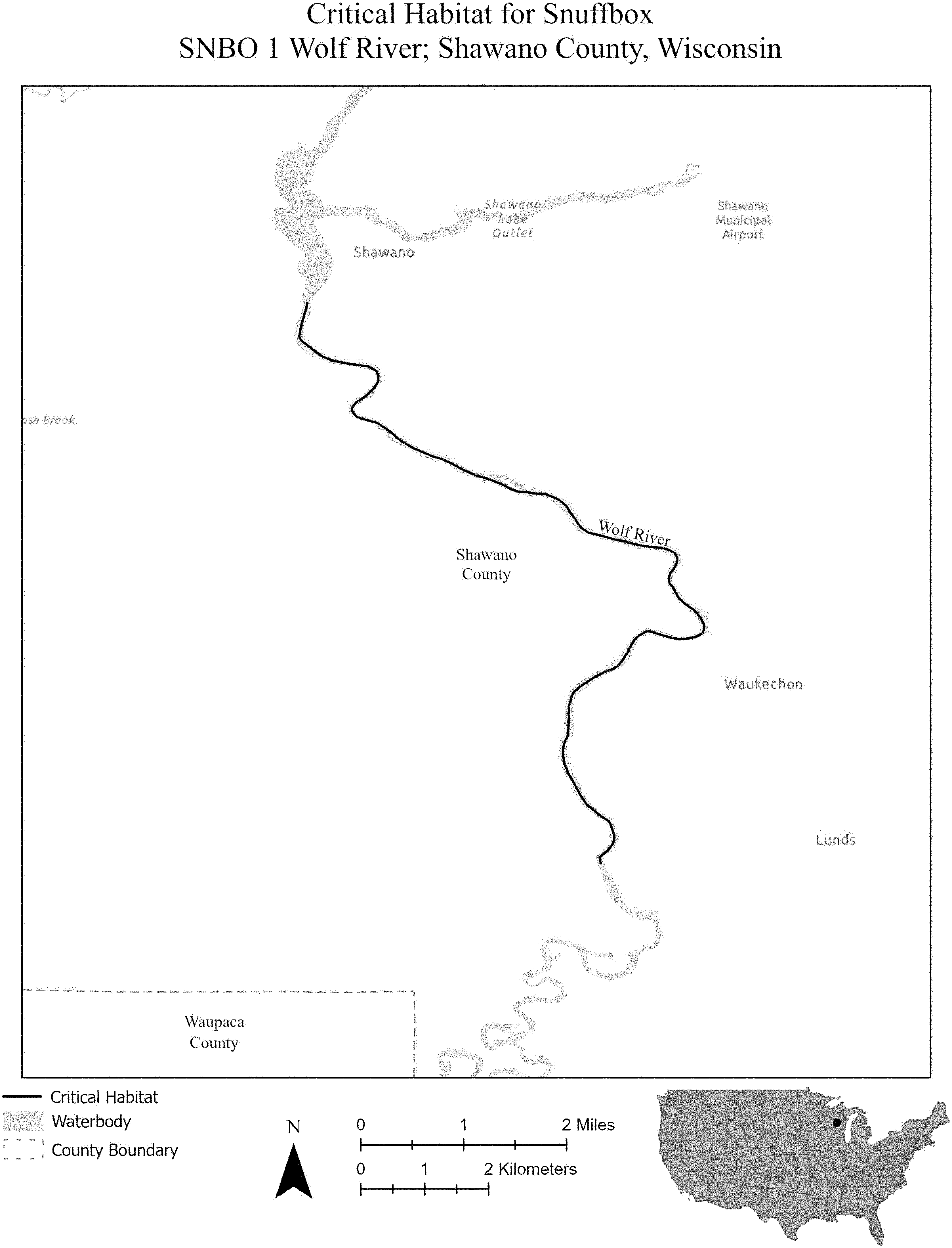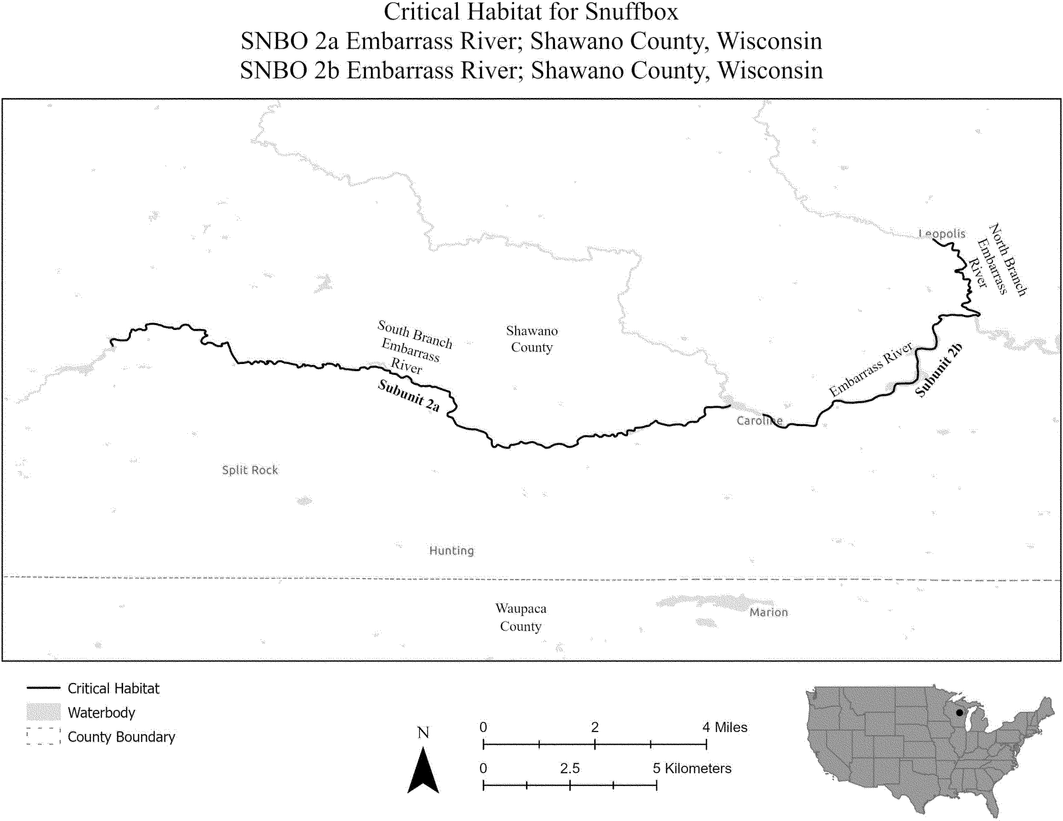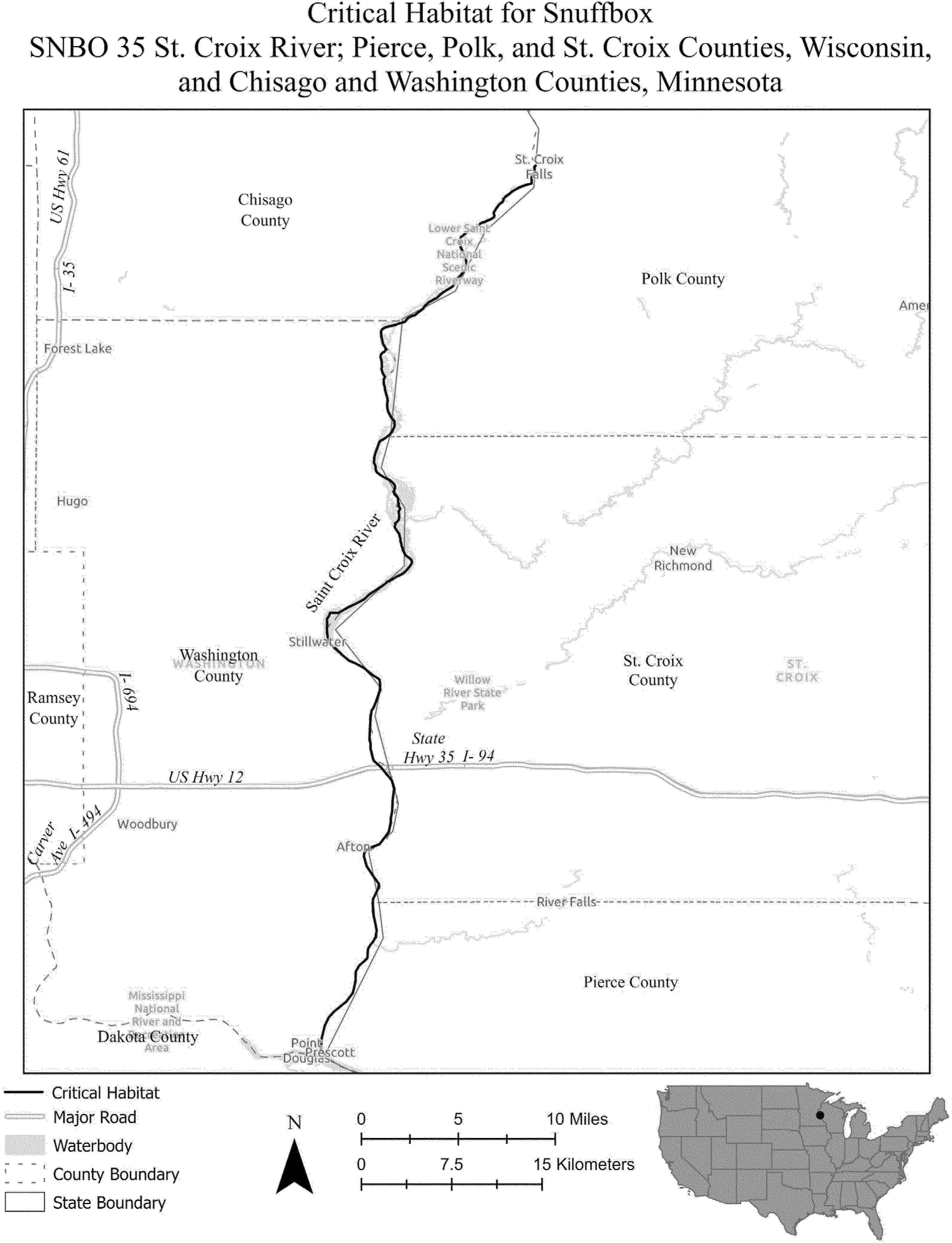 (i) SNBO 35 consists of 53 rmi (85 rkm) of the St. Croix River in Polk, St. Croix, and Pierce Counties, Wisconsin, and Chisago and Washington Counties, Minnesota. This unit extends from the base of the dam at the city of St. Croix Falls (Polk County, Wisconsin) and the city of Taylors Falls (Chisago County, Minnesota) downstream to its confluences with the Mississippi River at the city of Prescott (Pierce County, Wisconsin) and Point Douglas Park (Washington County, Minnesota). The unit includes the river channel up to the ordinary high-water mark.