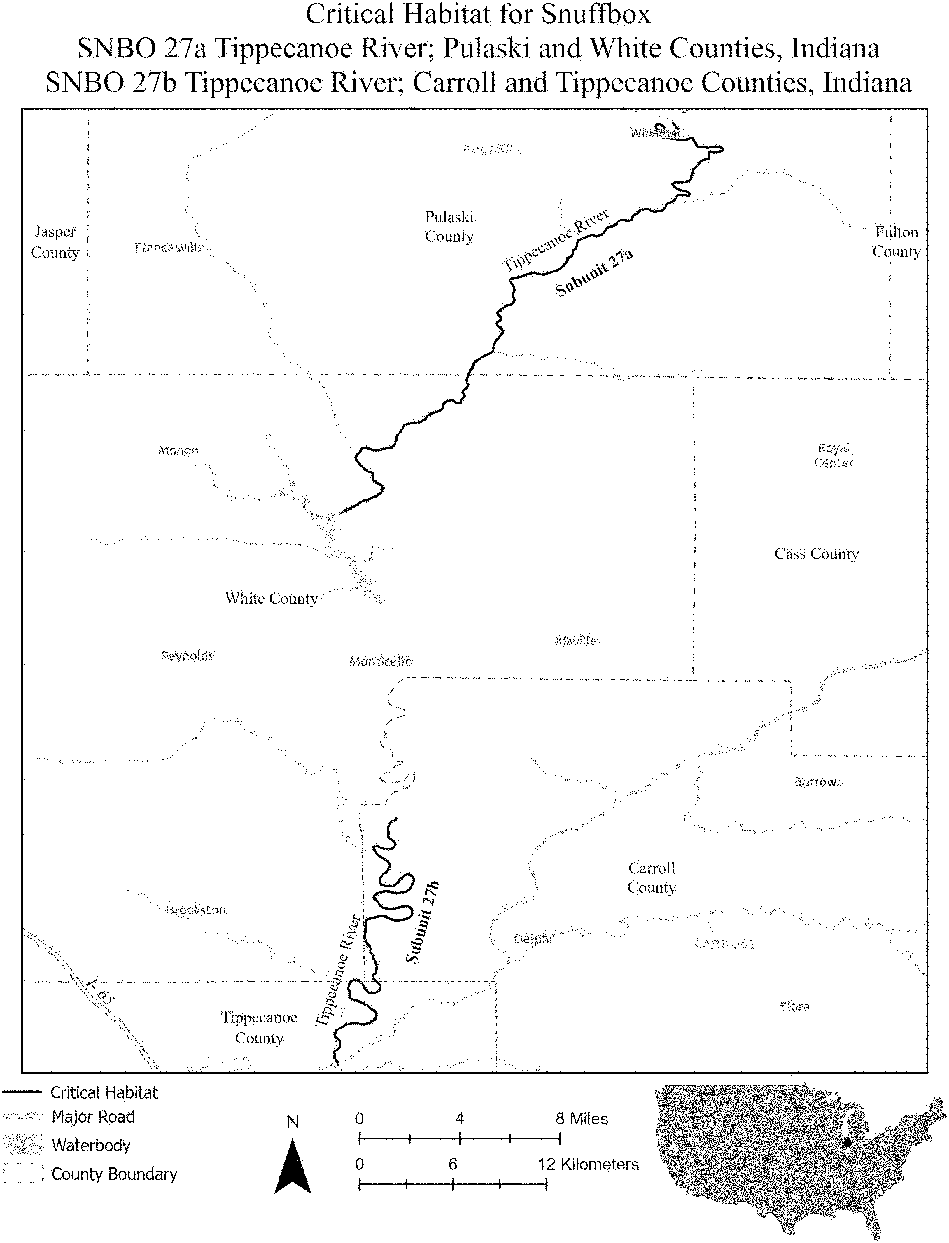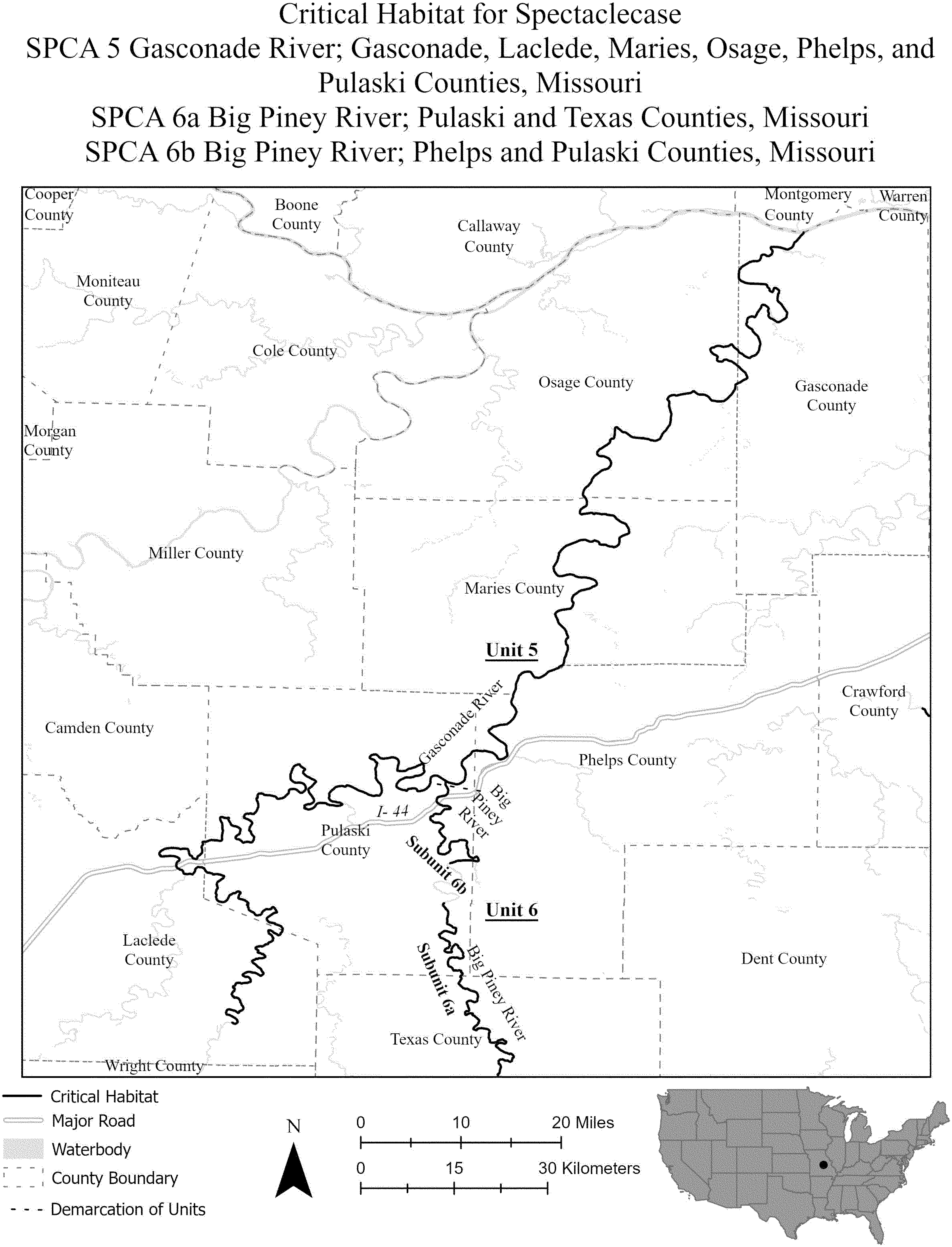 (B) Subunit SPCA 6b extends from the downstream end of Fort Leonard Wood Military Training Facility (Pulaski County, Missouri) to the Big Piney River's confluence with the Gasconade River, near the unincorporated community of Hooker (Pulaski County, Missouri).