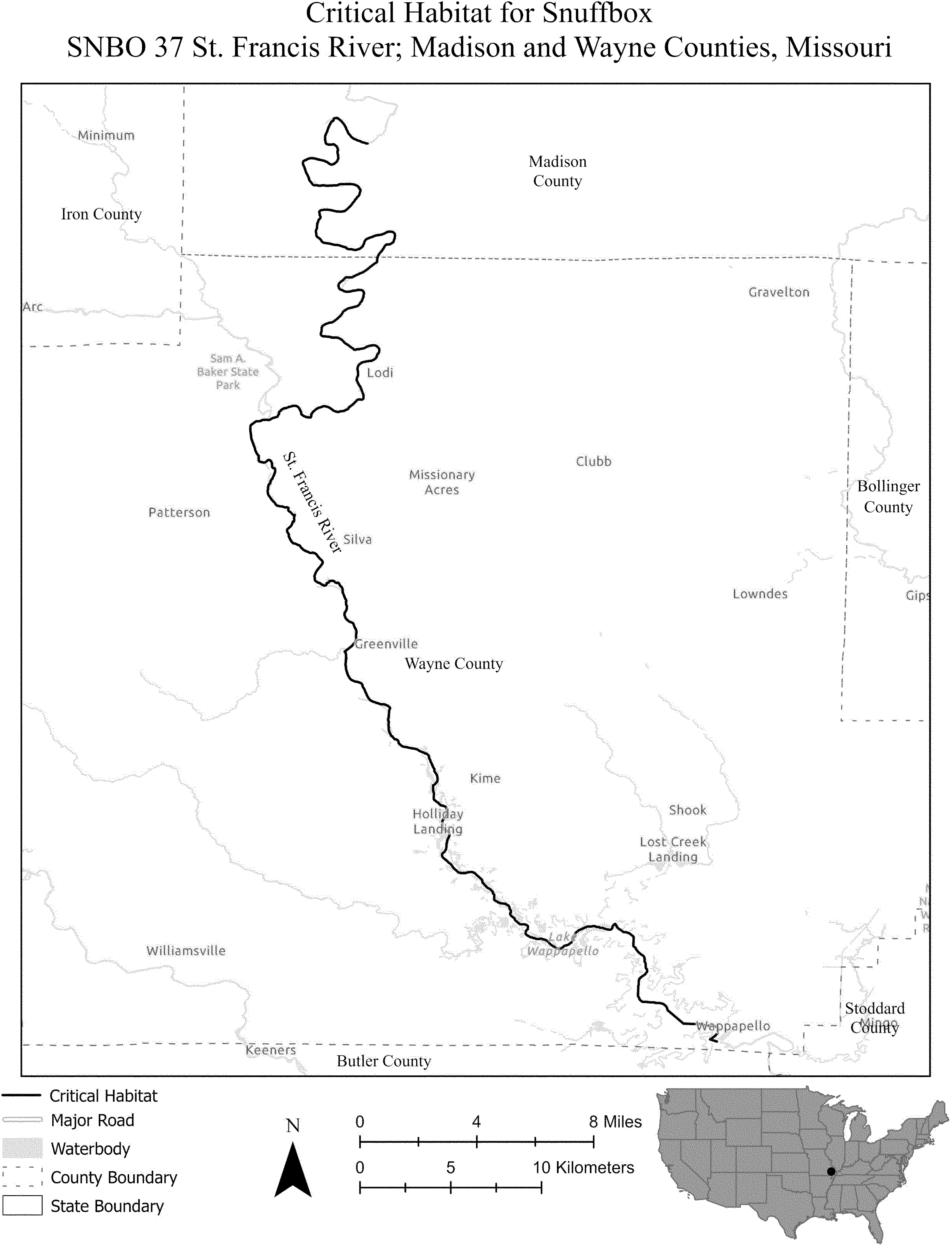 (i) SNBO 37 consists of 58 rmi (93 rkm) of the St. Francis River in Madison and Wayne Counties, Missouri. This unit extends from the St. Francis River's confluence with Twelvemile Creek west of the unincorporated community of Saco (Madison County, Missouri) downstream to where inundation begins at Lake Wappepello (Wayne County, Missouri). The unit includes the river channel up to the ordinary high-water mark.