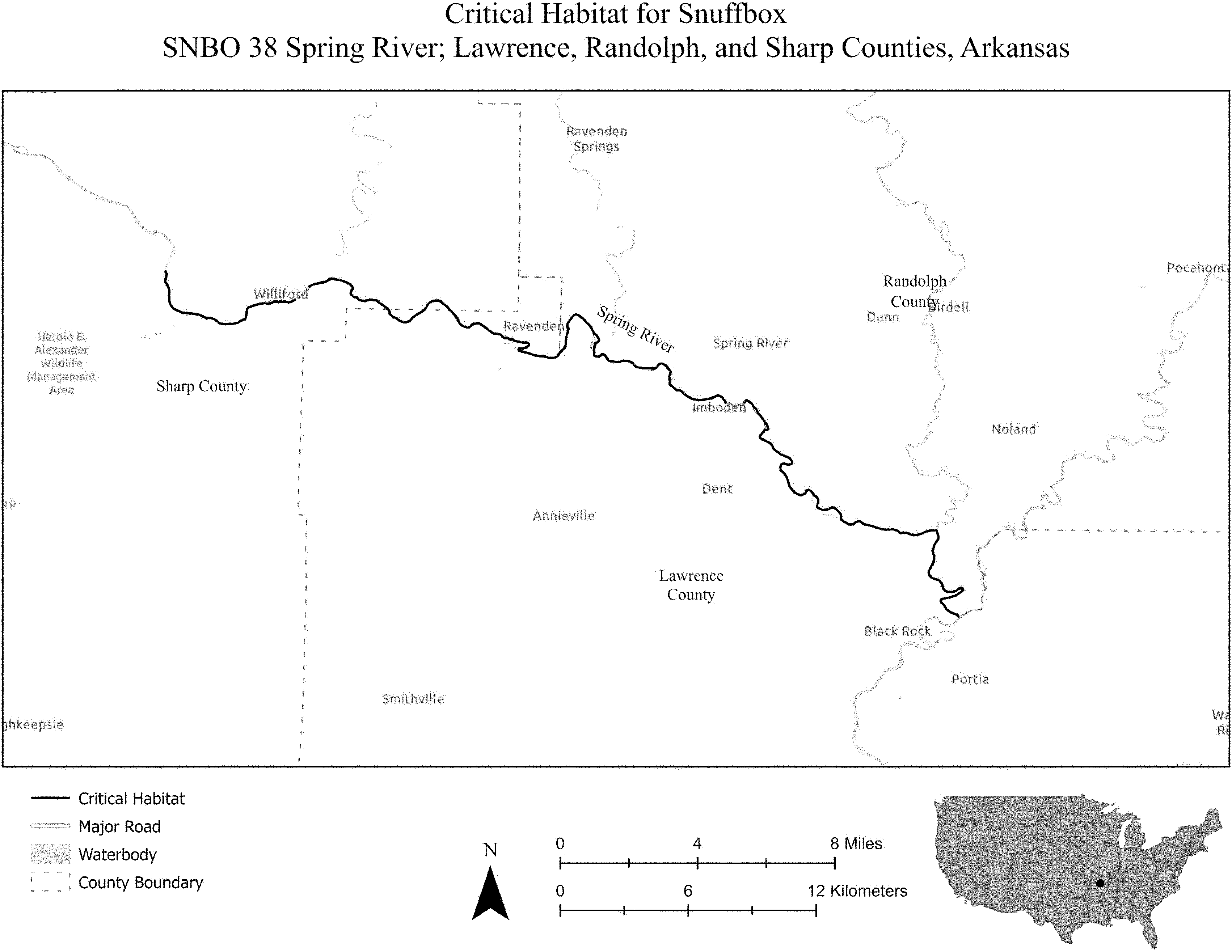 (i) SNBO 38 consists of 33 rmi (53 rkm) of the Spring River in Sharp, Lawrence, and Randolph Counties, Arkansas. This unit extends from the Spring River's confluence with Ott Creek southeast of the city of Hardy in Sharp County, Arkansas, downstream to its confluence with the Black River east of the city of Black Rock (Lawrence and Randolph Counties, Arkansas). The unit includes the river channel up to the ordinary high-water mark.