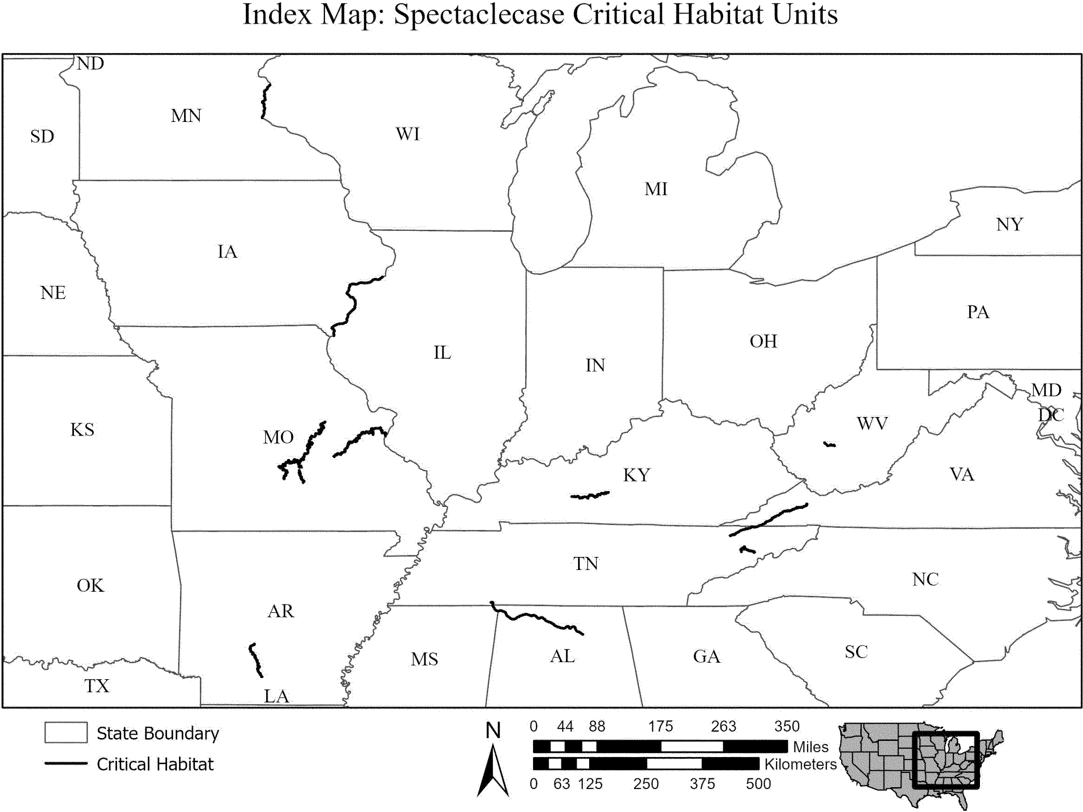 (1) Critical habitat units for spectaclecase are depicted on the maps in this entry for Colbert, Lauderdale, Lawrence, Limestone, Madison, Marshall, and Morgan Counties, Alabama; Clark, Dallas, Hot Spring, and Ouachita Counties, Arkansas; Hancock, Henderson, Mercer, and Rock Island Counties, Illinois; Des Moines, Lee, Louisa, Muscatine, and Scott Counties, Iowa; Butler, Edmonson, Hart, and Warren Counties, Kentucky; Chisago and Washington Counties, Minnesota; Tishomingo County, Mississippi; Crawford, Franklin, Gasconade, Jefferson, Laclede, Maries, Osage, Phelps, Pulaski, Saint Louis, Texas, and Washington Counties, Missouri; Claiborne, Cocke, Grainger, Greene, Hamblen, Hancock, Hardin, and Jefferson Counties, Tennessee; Russell, Scott, and Wise Counties, Virginia; Kanawha County, West Virginia; and Pierce, Polk, and St. Croix Counties, Wisconsin.