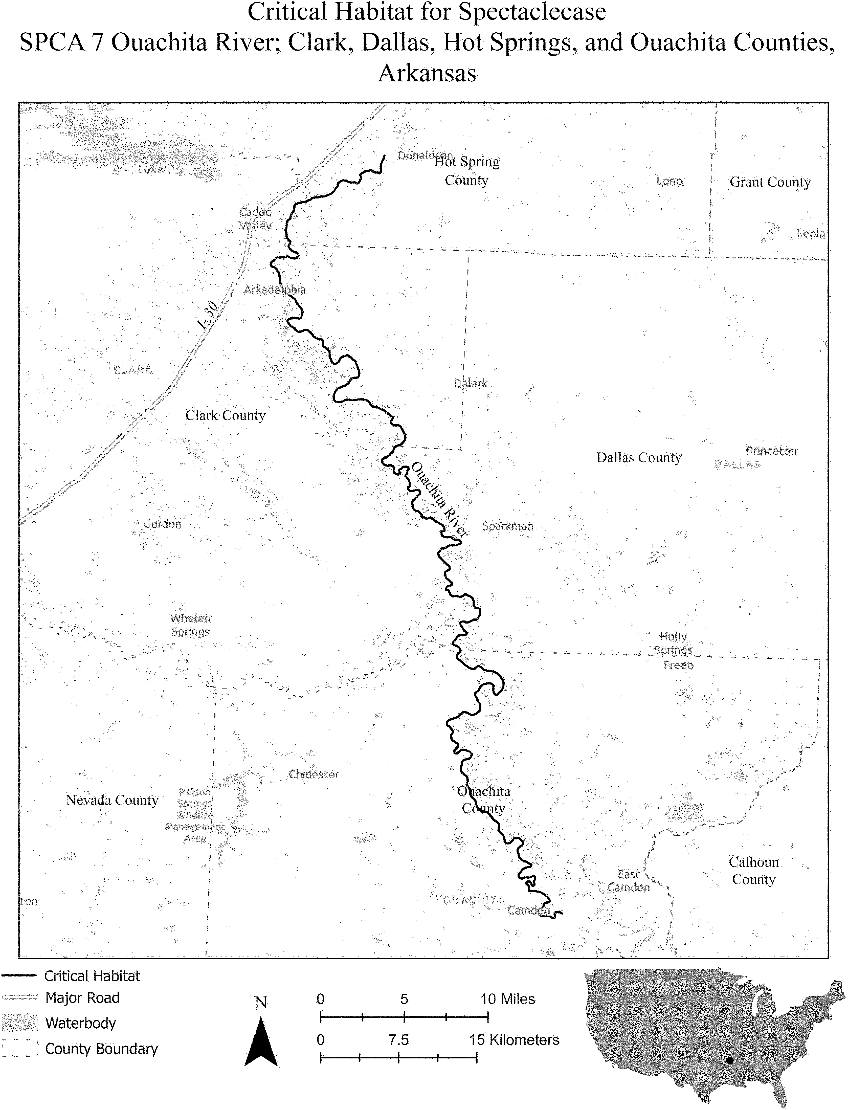 (i) SPCA 7 consists of 83 rmi (133 rkm) of the Ouachita River in Hot Springs, Clark, Dallas, and Ouachita Counties, Arkansas. This unit extends from the downstream side of Highway 67 bridge at the town of Donaldson (Hot Springs County, Arkansas) downstream to the Highway 79N bridge at city of Camden (Ouachita County, Arkansas). ( printed page 22697) The unit includes the river channel up to the ordinary high-water mark.