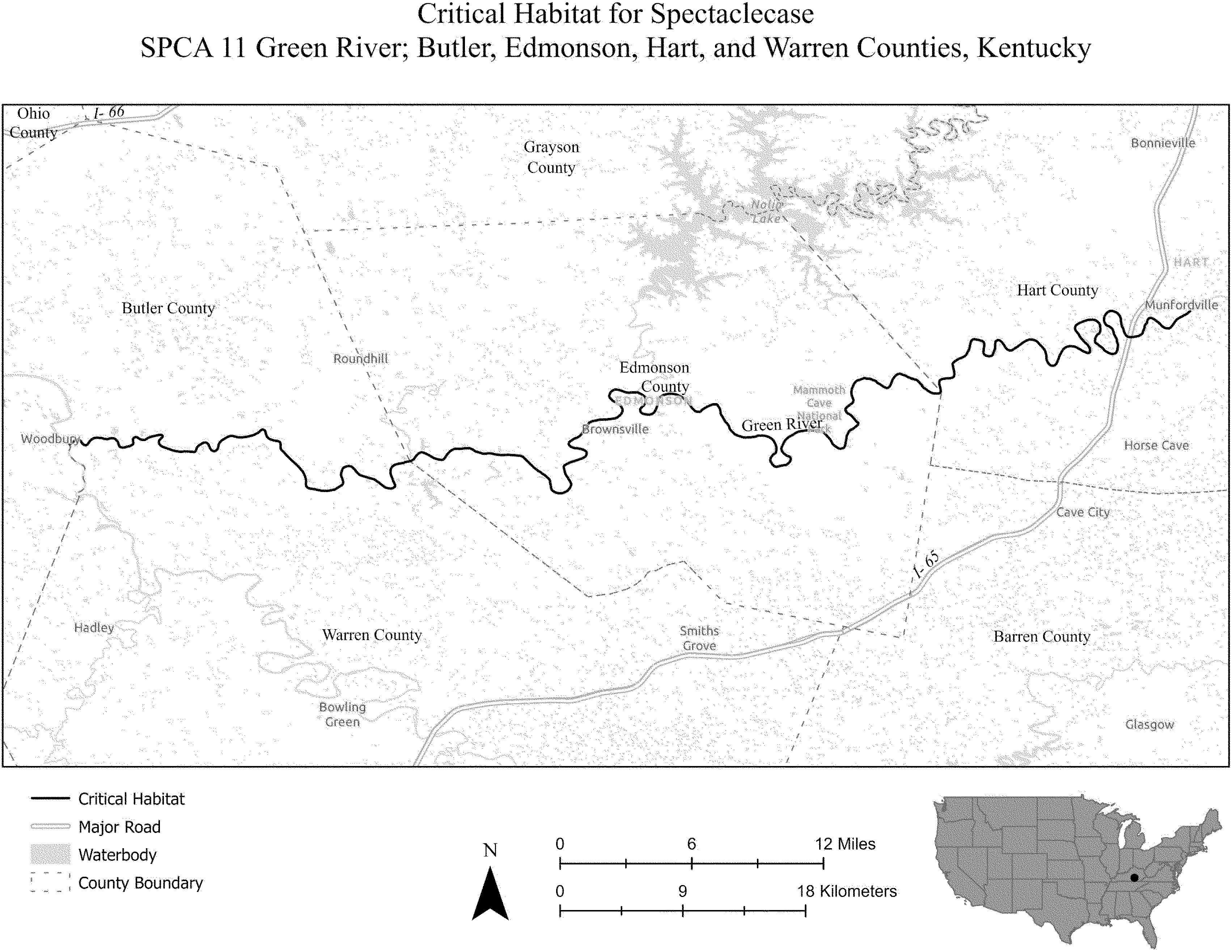 (i) SPCA 11 consists of 77 rmi (125 rkm) of the Green River in Hart, Edmonson, Warren, and Butler Counties, Kentucky. The unit extends from the downstream side of the bridge at Highway 31W at the city of Munfordville (Hart County, Kentucky) downstream to its confluence with the Barren River near the city of Woodbury (Warren County, Kentucky). The unit includes the river channel up to the ordinary high-water mark.