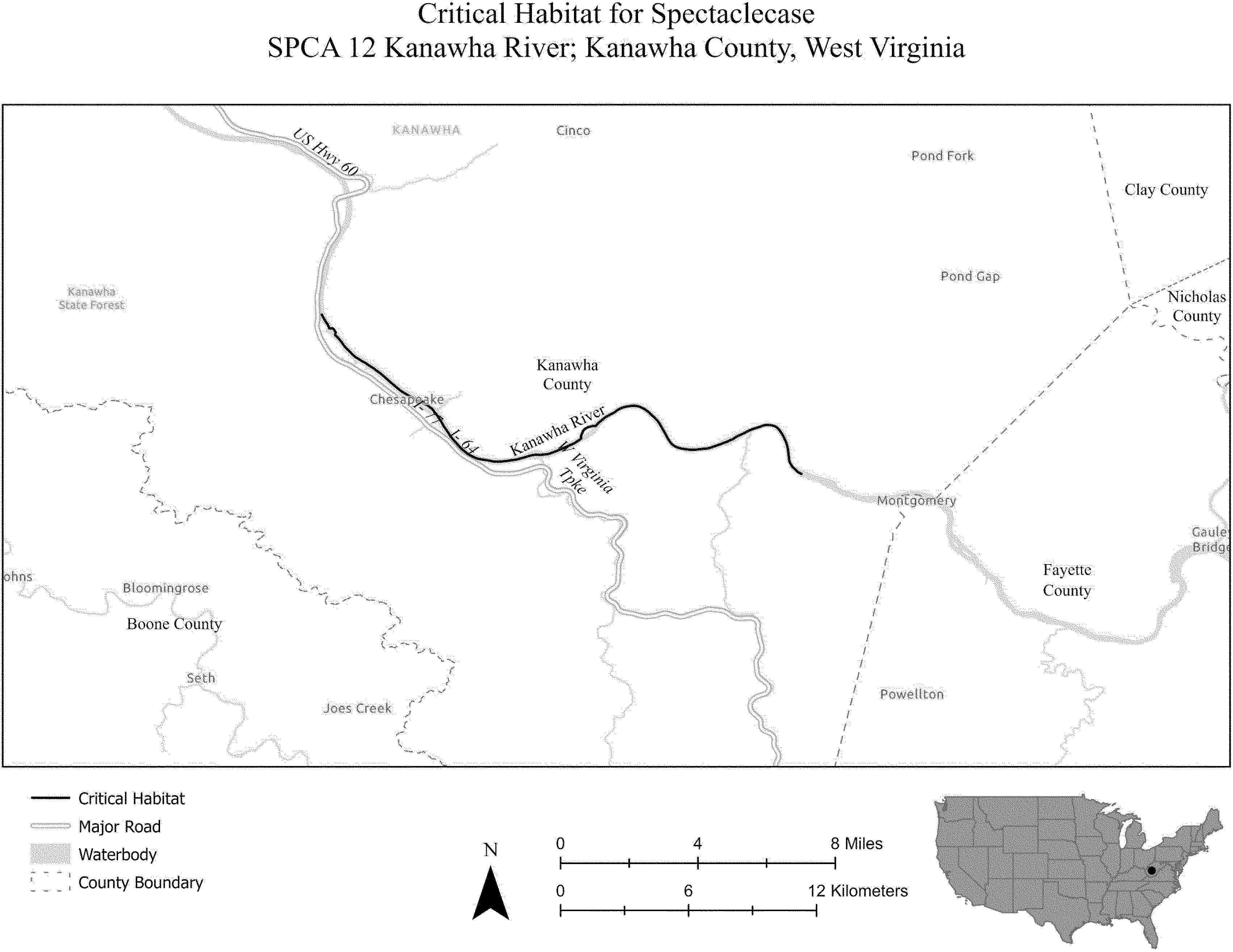 (i) SPCA 12 consists of 16 rmi (25 rkm) of the Kanawha River in Kanawha County, West Virginia. This unit extends from the downstream side of the Lock and Dam located at the unincorporated community of London downstream to the Lock and Dam at city of Marmet, in Kanawha County, West Virginia. The unit includes the river channel up to the ordinary high-water mark.