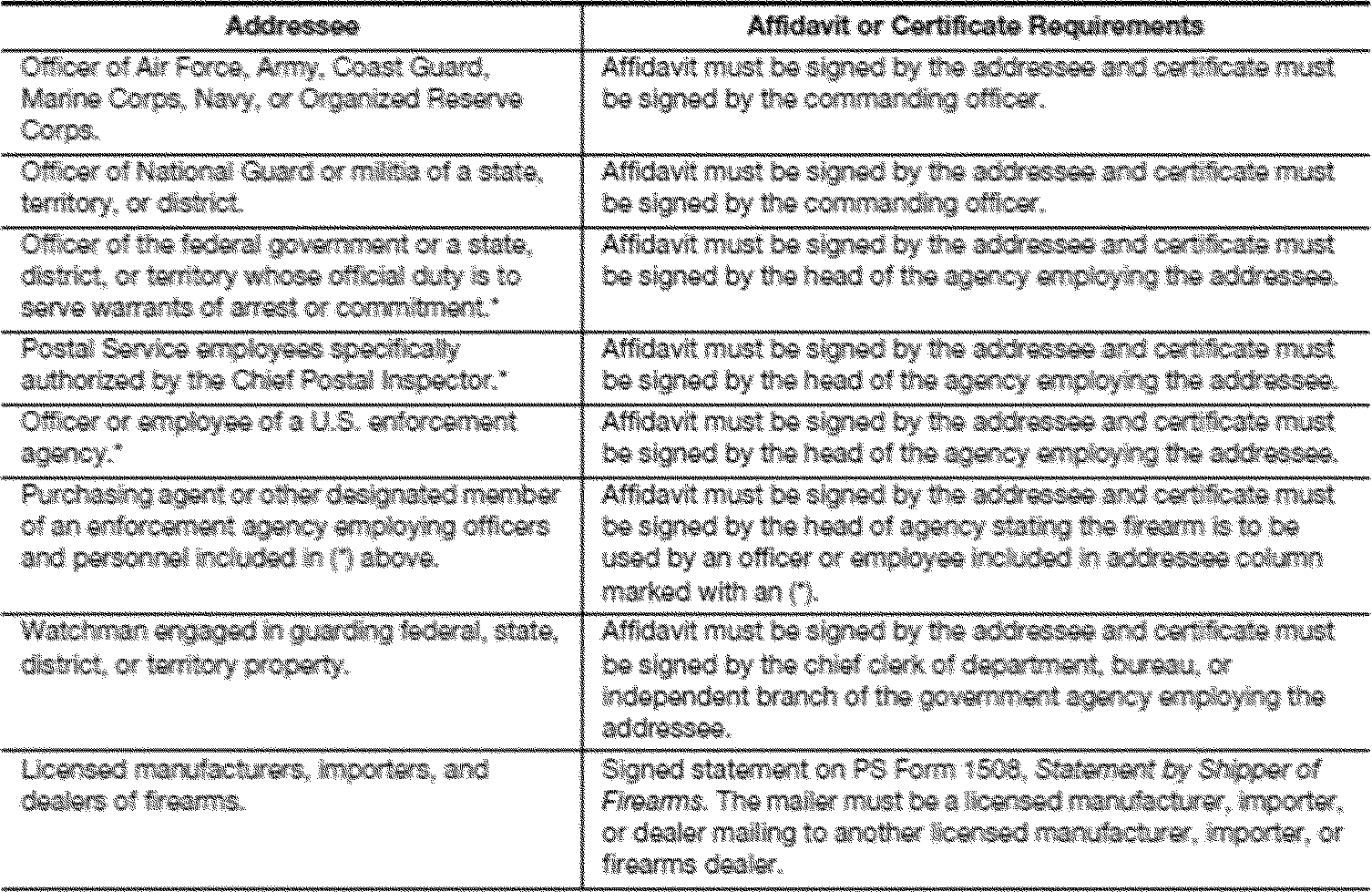 Authorized persons must submit, at the time of mailing, an affidavit signed by the addressee certifying that the addressee is qualified to receive the firearm under a particular category of 432.21(a-g), and that the firearm is intended for the addressee's official use. The affidavit must also bear a certificate stating that the firearm is for the official duty use of the addressee, signed by the appropriate official, as follows: