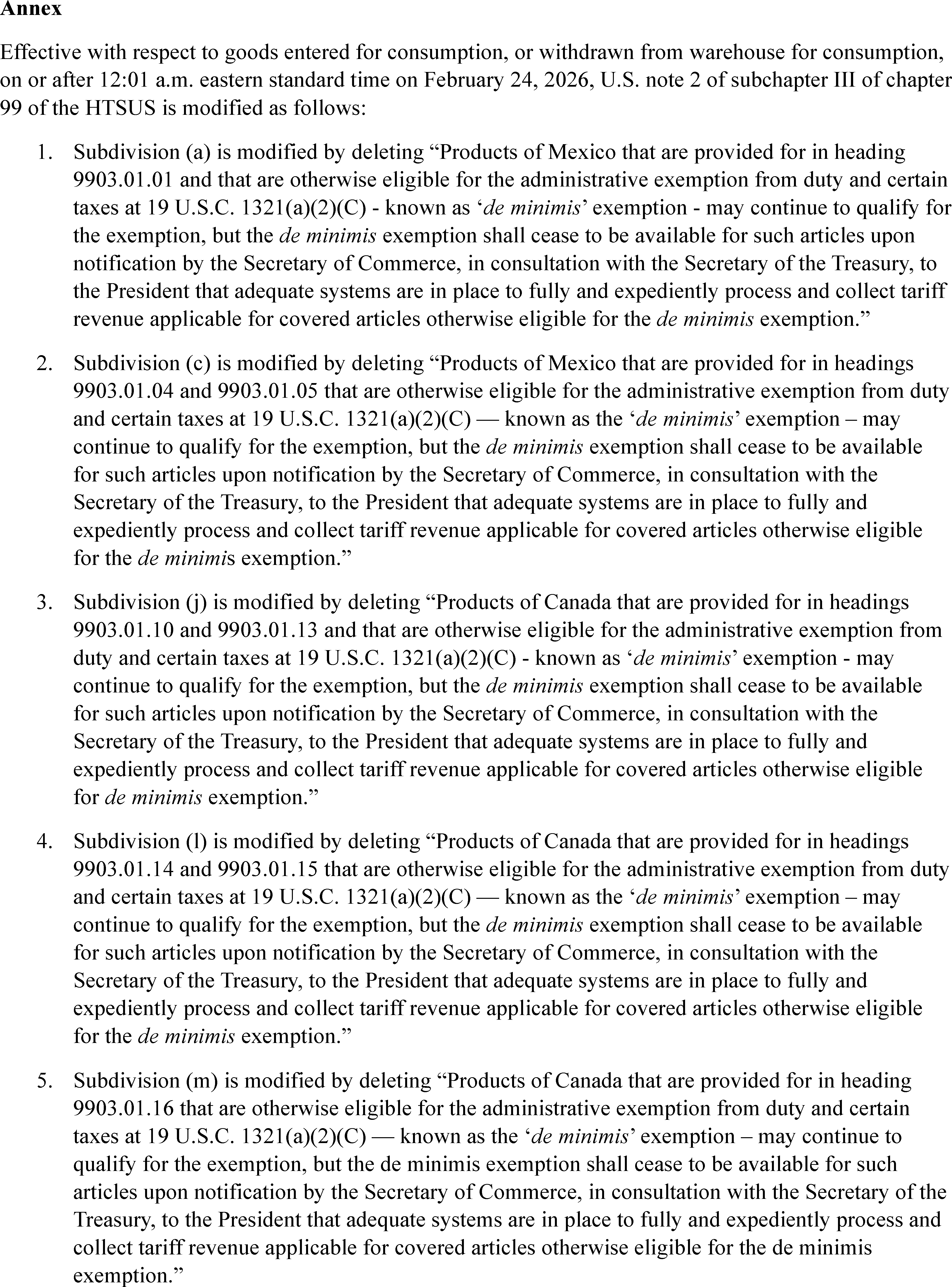 Section 1. Background. In several Executive Orders, including Executive Order 14193 of February 1, 2025 (Imposing Duties To Address the Flow of Illicit Drugs Across Our Northern Border), as amended; Executive Order 14194 of February 1, 2025 (Imposing Duties To Address the Situation at Our Southern Border), as amended; Executive Order 14195 of February 1, 2025 (Imposing Duties To Address the Synthetic Opioid Supply Chain in the People's Republic of China), as amended; Executive Order 14257 of April 2, 2025 (Regulating Imports With a Reciprocal Tariff To Rectify Trade Practices That Contribute to Large and Persistent Annual United States Goods Trade Deficits), as amended; and Executive Order 14324 of July 30, 2025 (Suspending Duty-Free De Minimis Treatment for All Countries), I declared or described national emergencies with respect to unusual and extraordinary threats to the national security, foreign policy, or economy of the United States and took action to deal with those threats, including suspending duty-free de minimis treatment under 19 U.S.C. 1321(a)(2)(C) for certain imports.