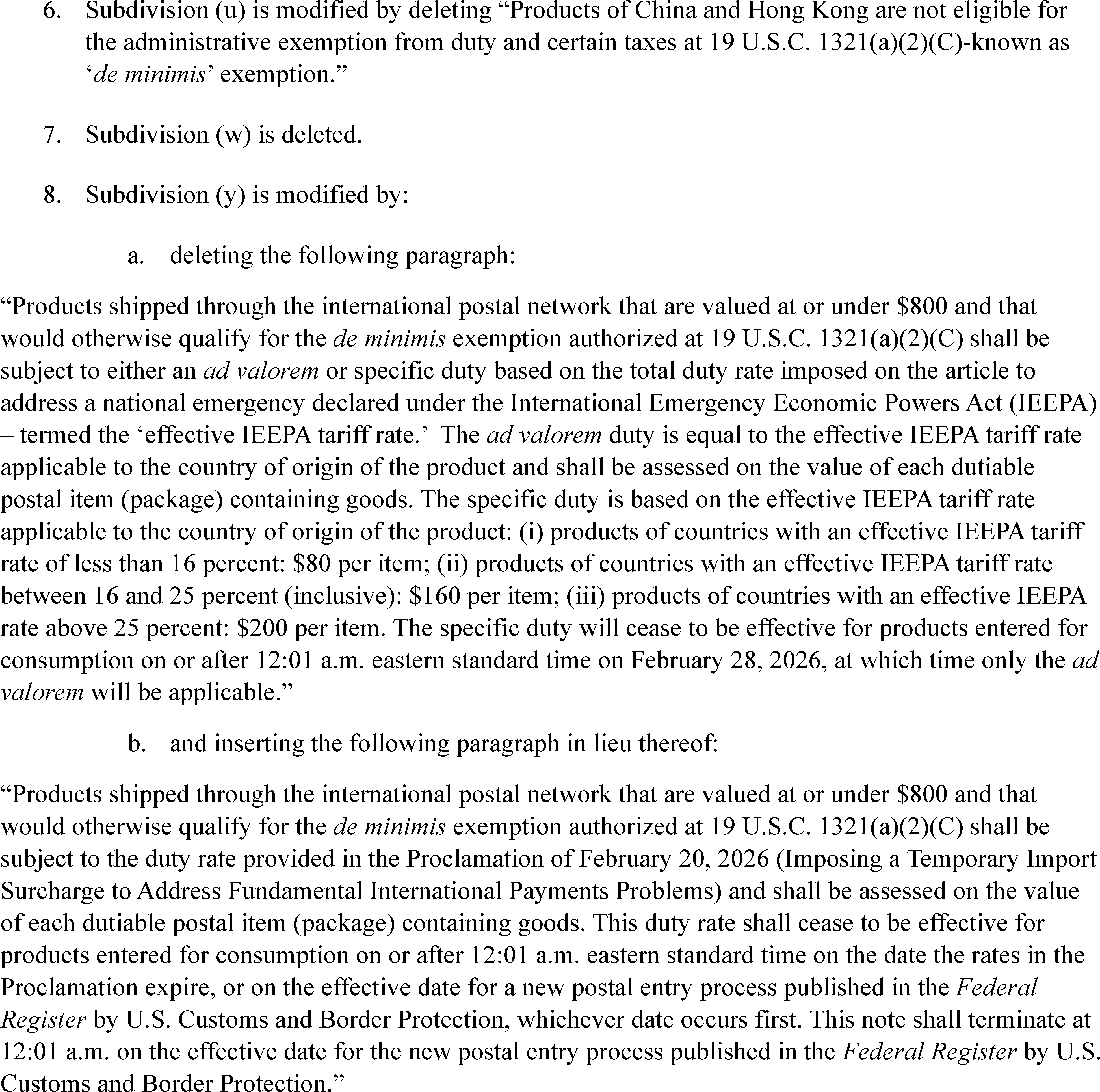 (b) A duty equal to the rate provided in the Proclamation of February 20, 2026 (Imposing a Temporary Import Surcharge to Address Fundamental International Payments Problems), shall be assessed on the value of each dutiable postal item containing goods entered for consumption. This duty rate shall be assessed until the expiration date of the temporary import surcharge established by the Proclamation of February 20, 2026, or until ( printed page 17841) the effective date of the new entry process for postal shipments established by CBP, whichever date occurs first.