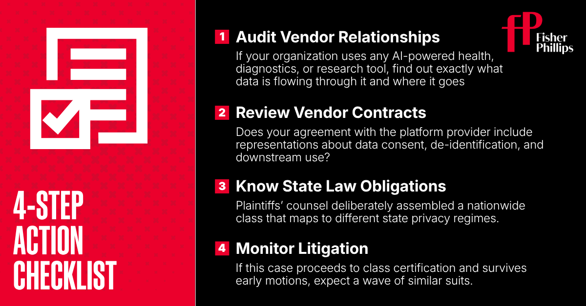 Healthcare organizations and employers that have licensed AI-powered diagnostic, research, or clinical decision-support tools should proactively review their vendor agreements for data consent, de-identification, and downstream use representations. Plaintiffs' attorneys have previously used vendor websites, press releases, and earnings calls to identify downstream customers in similar privacy litigation waves, arguing that customers either knew or should have known about potential legal exposure of the platforms they deployed.