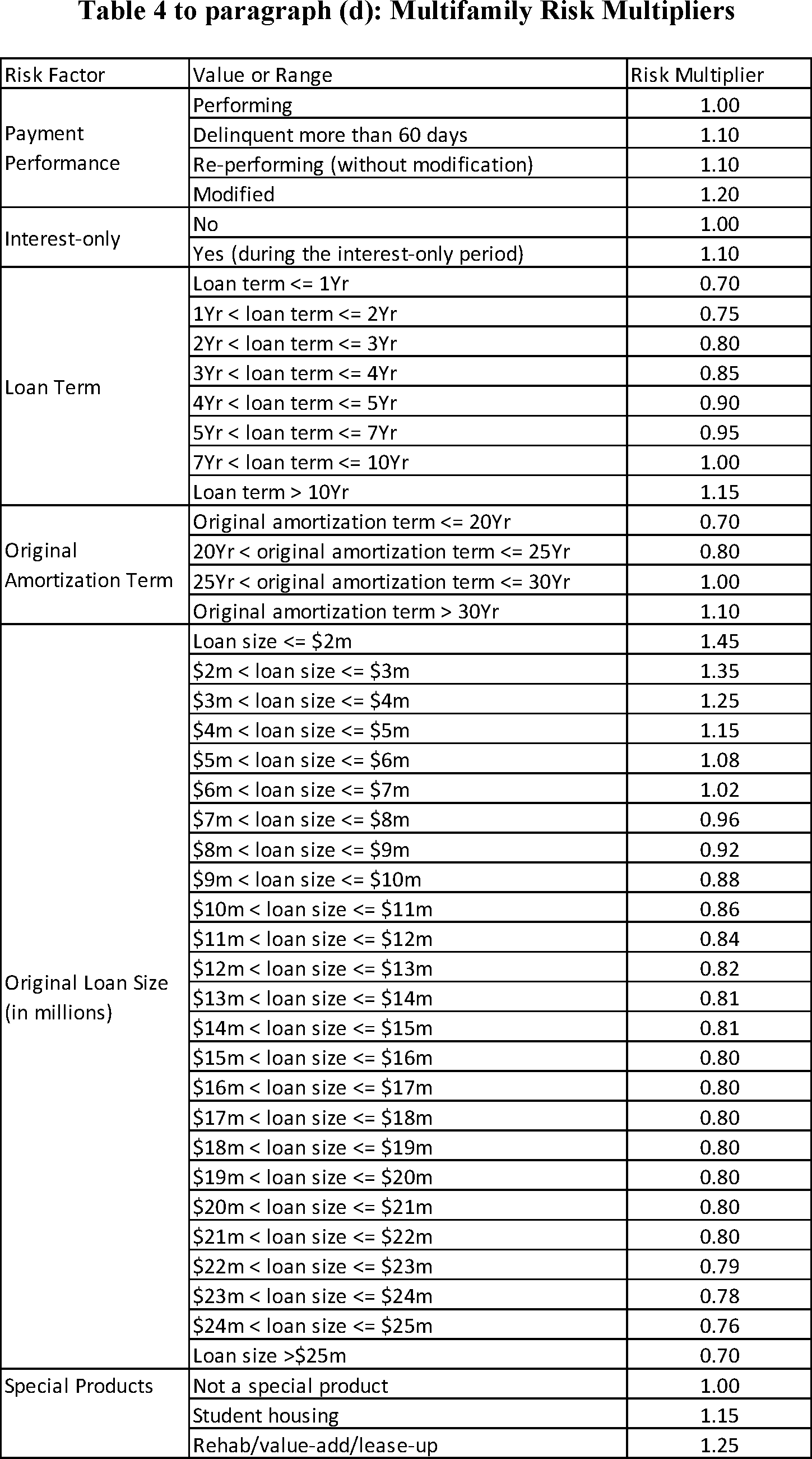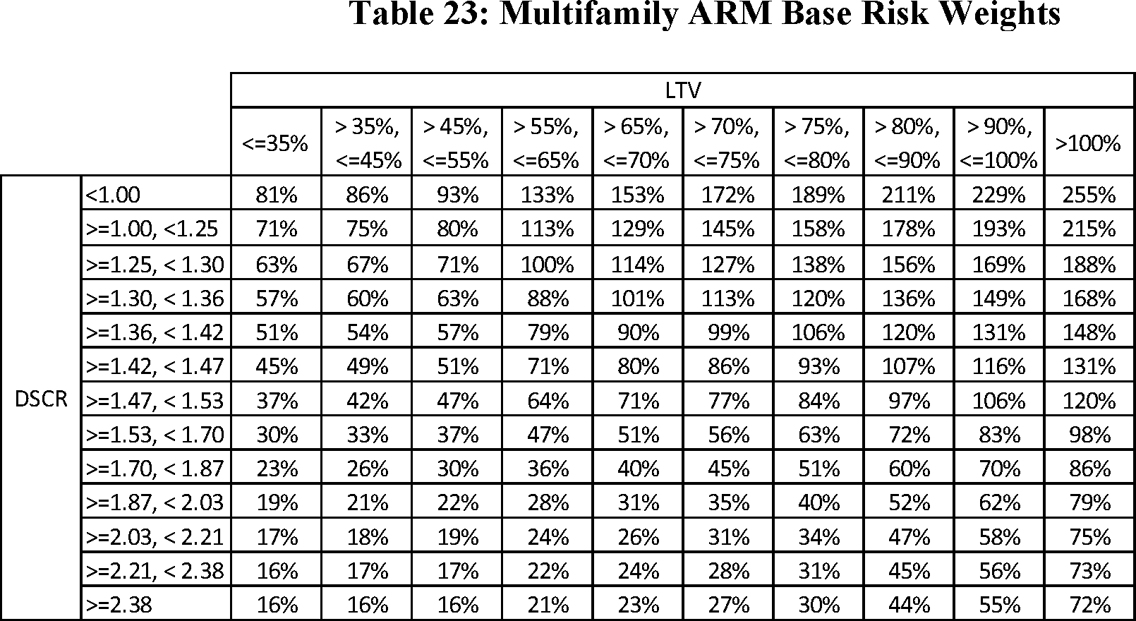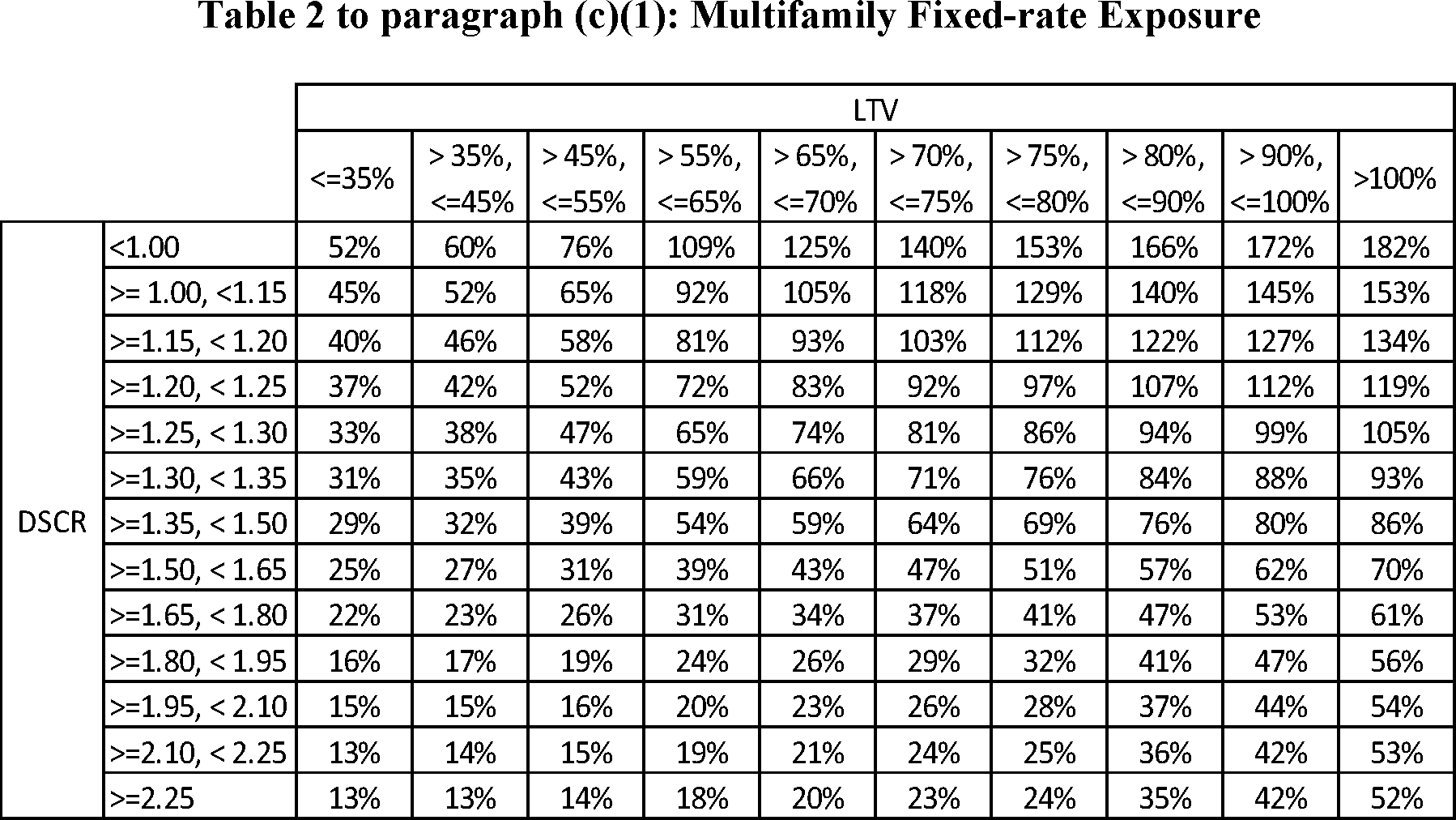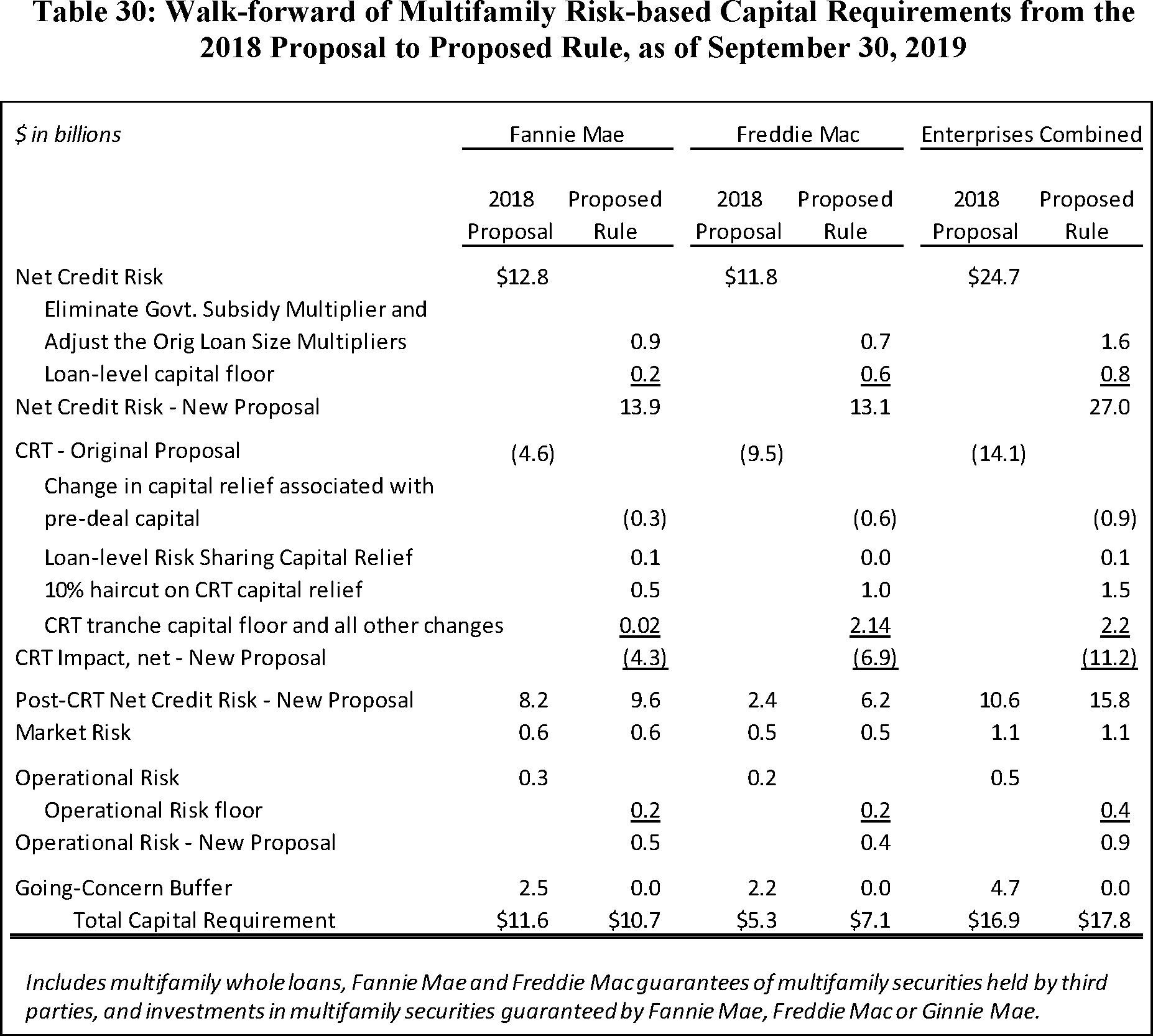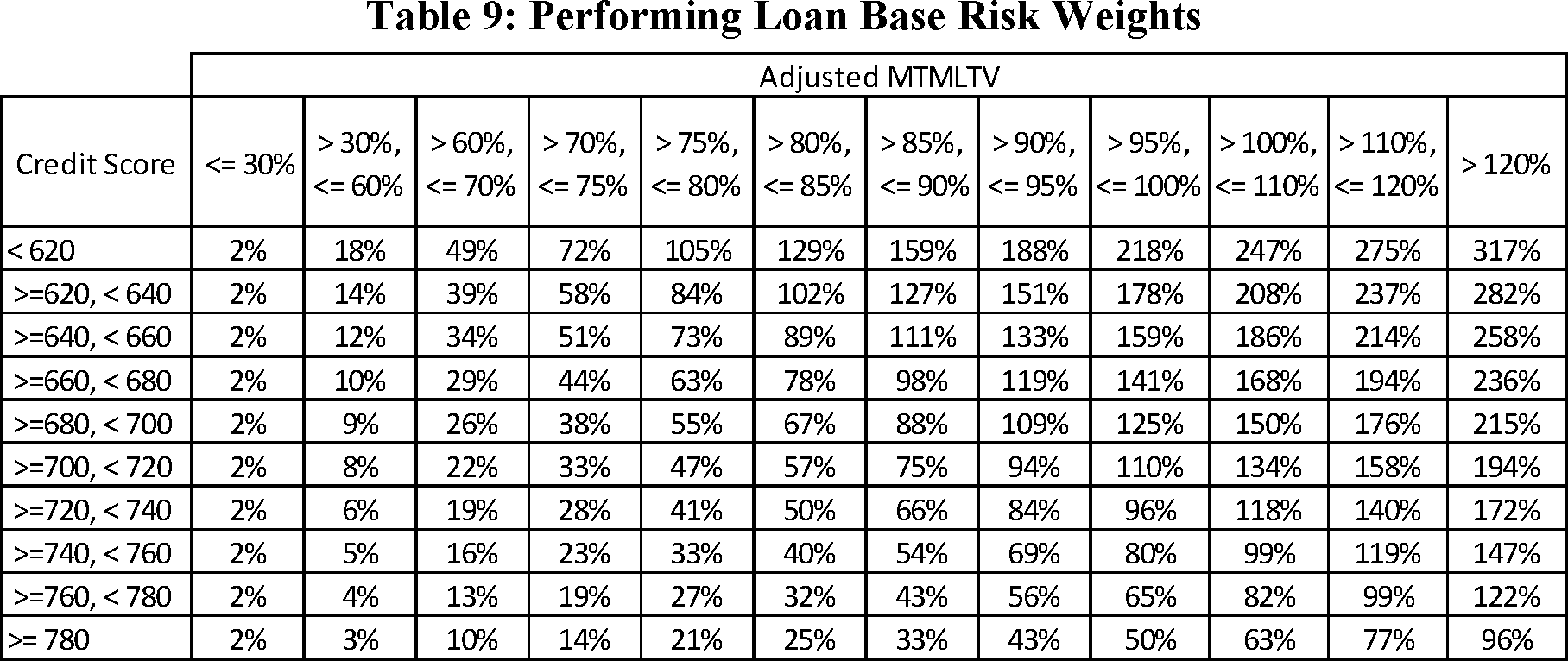 In consideration that the U.S. banking framework utilizes OLTVs, a comparison of the credit risk capital requirements for newly acquired multifamily mortgage exposures under the 2018 proposal and the proposed rule provides the most direct comparison of credit risk capital requirements for new originations. Under the proposed rule, gross credit risk capital (prior to adjustments for CRT) on newly acquired multifamily mortgage exposures as of September 30, 2019, with an average MTMLTV of approximately 67 percent, would have been approximately 5.3 percent of unpaid principal balance, implying an average risk weight of 67 percent. This compares to the 100 percent default risk weight generally applicable under the U.S. banking framework. These risk weights would then decline to the extent multifamily property prices appreciate or increase to the extent multifamily property prices depreciate.