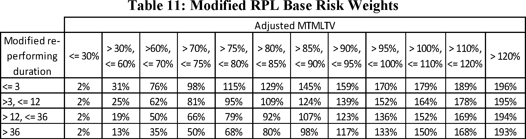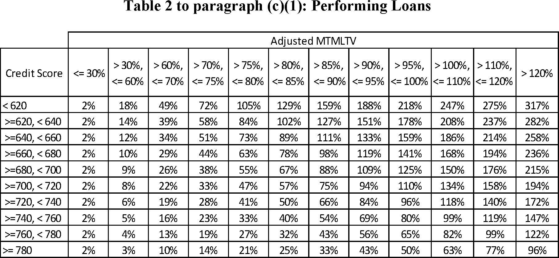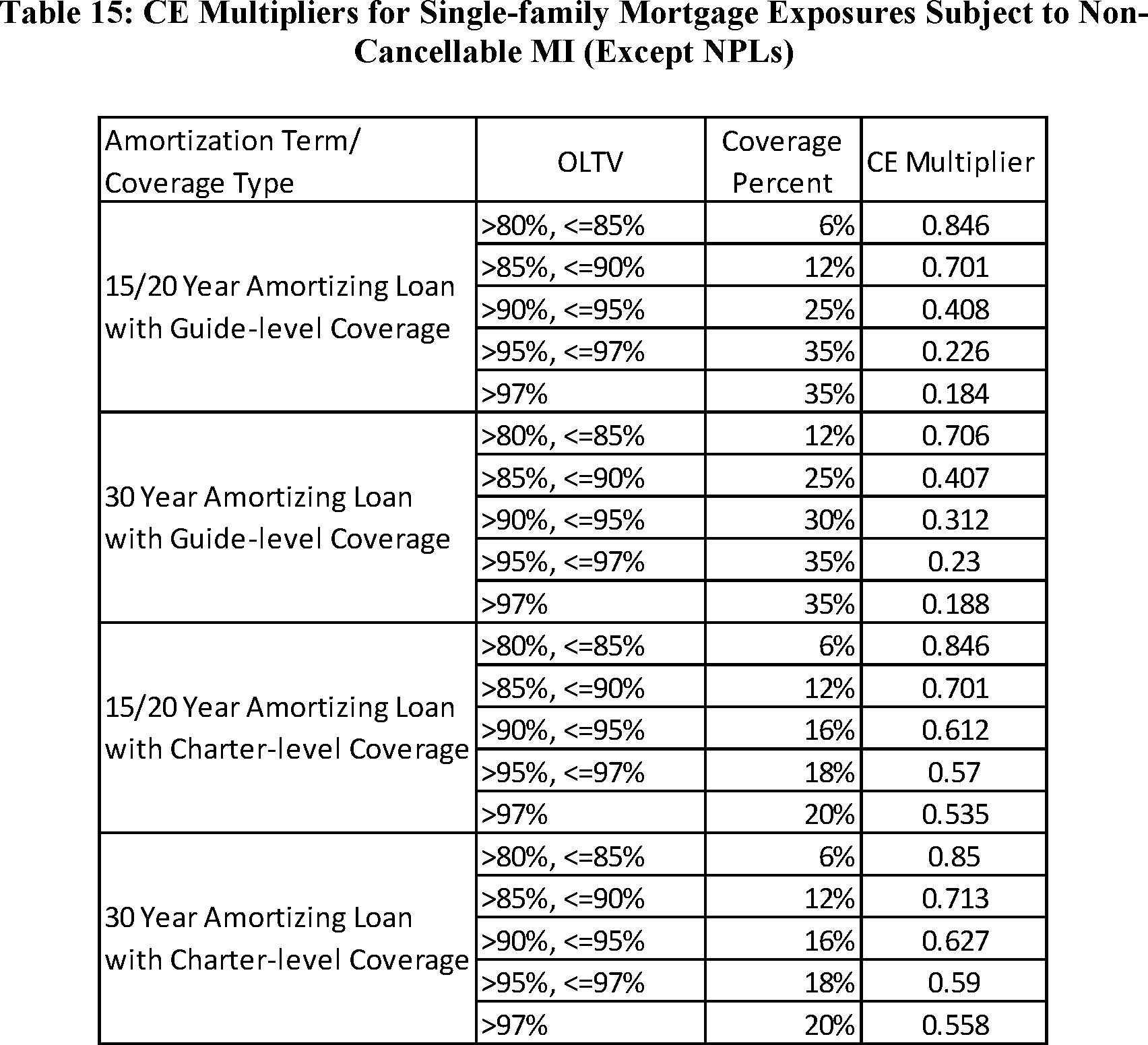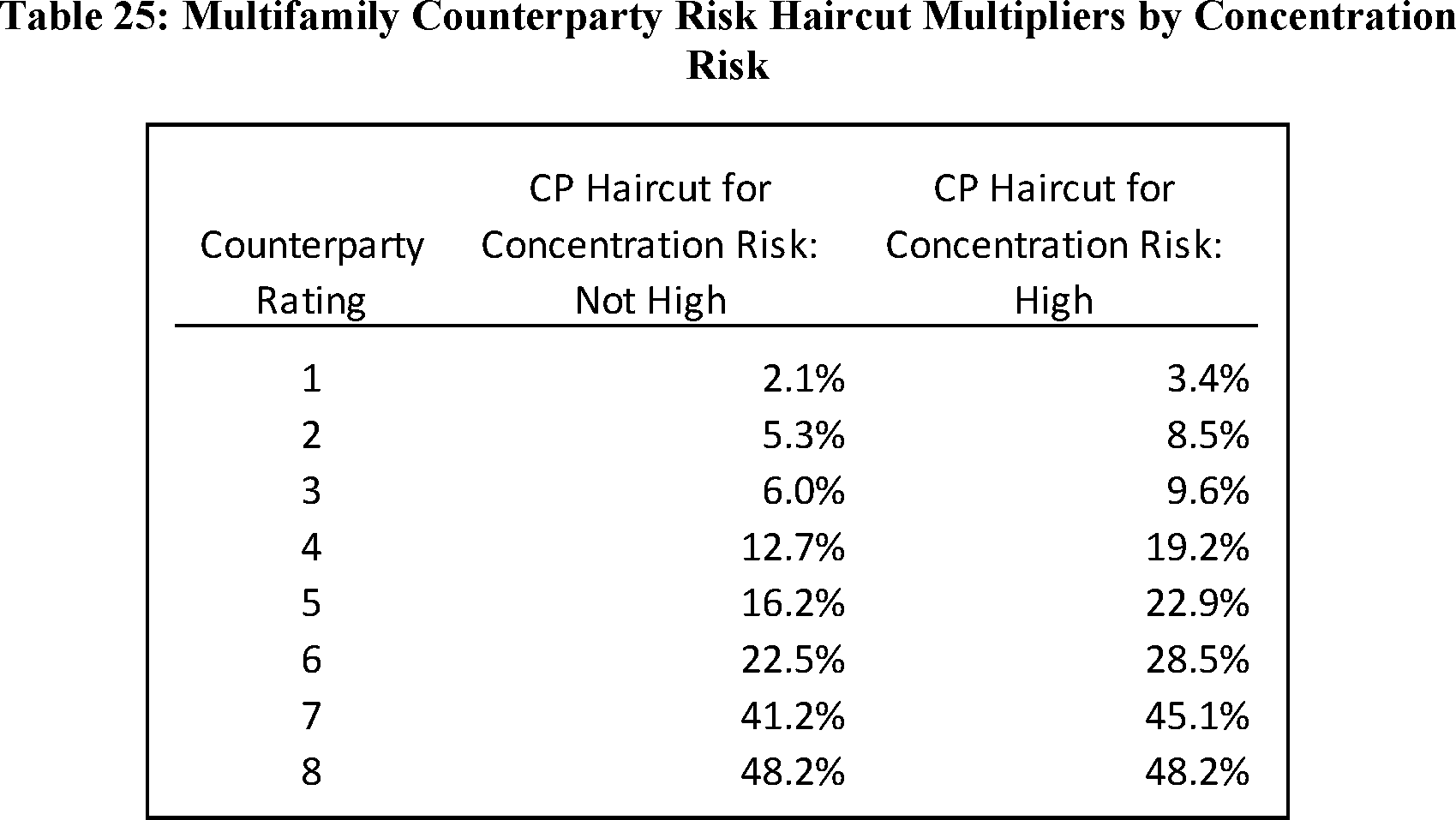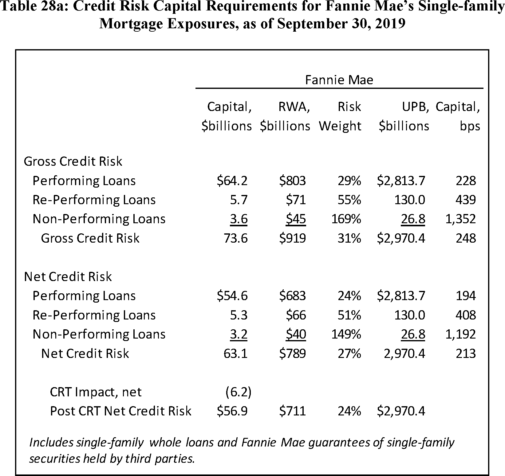 In consideration that the U.S. banking framework utilizes OLTVs, a comparison of the credit risk capital requirements for newly acquired multifamily mortgage exposures under the 2018 proposal and the proposed rule provides the most direct comparison of credit risk capital requirements for new originations. Under the proposed rule, gross credit risk capital (prior to adjustments for CRT) on newly acquired multifamily mortgage exposures as of September 30, 2019, with an average MTMLTV of approximately 67 percent, would have been approximately 5.3 percent of unpaid principal balance, implying an average risk weight of 67 percent. This compares to the 100 percent default risk weight generally applicable under the U.S. banking framework. These risk weights would then decline to the extent multifamily property prices appreciate or increase to the extent multifamily property prices depreciate.