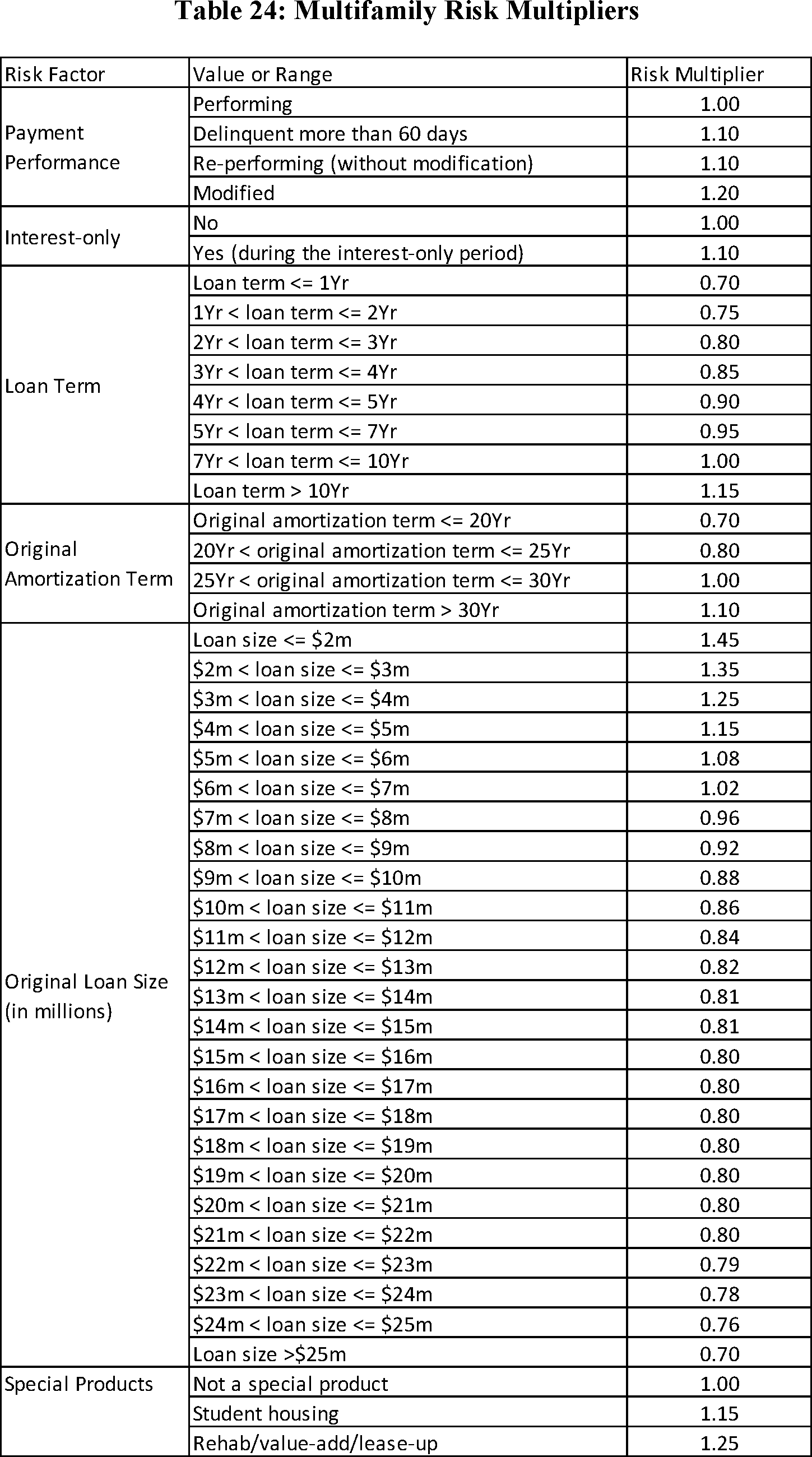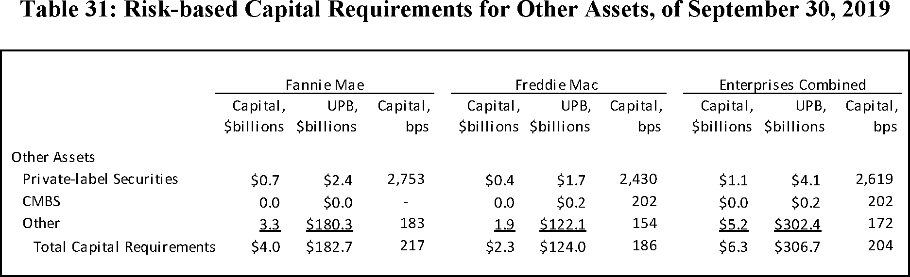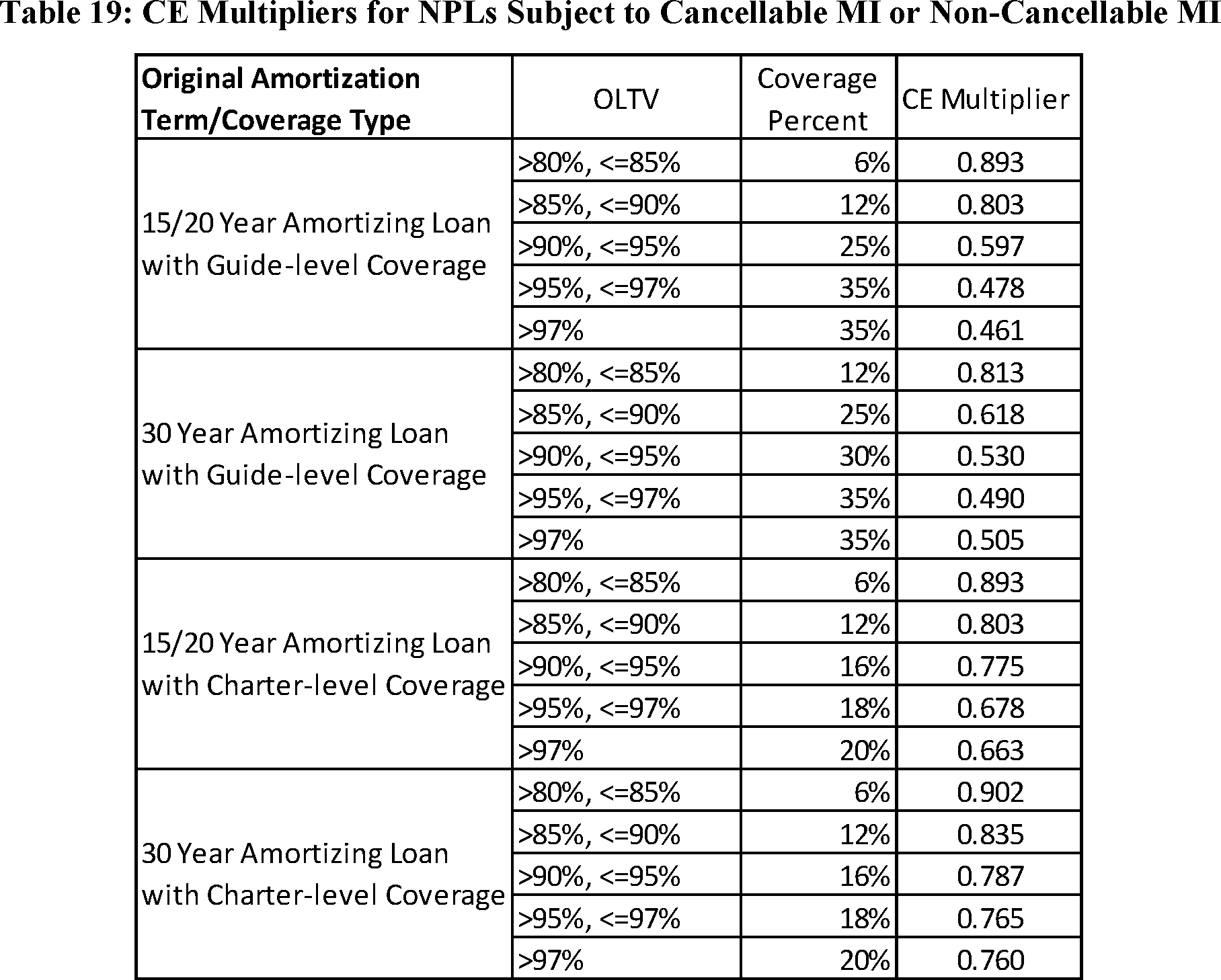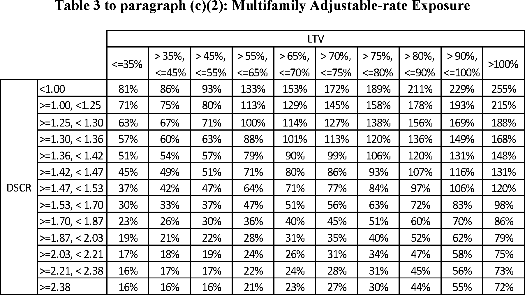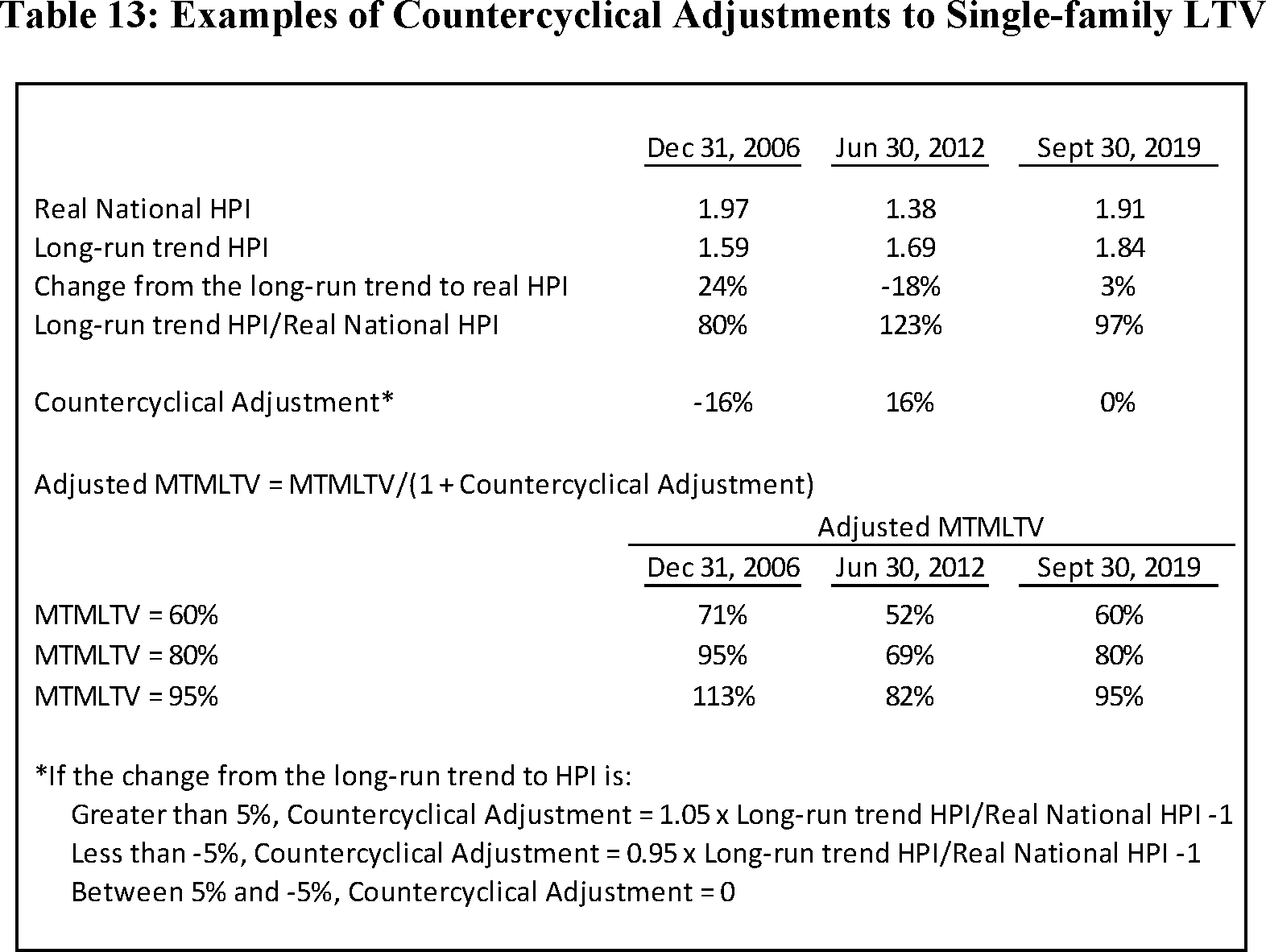 In consideration that the U.S. banking framework utilizes OLTVs, a comparison of the credit risk capital requirements for newly acquired multifamily mortgage exposures under the 2018 proposal and the proposed rule provides the most direct comparison of credit risk capital requirements for new originations. Under the proposed rule, gross credit risk capital (prior to adjustments for CRT) on newly acquired multifamily mortgage exposures as of September 30, 2019, with an average MTMLTV of approximately 67 percent, would have been approximately 5.3 percent of unpaid principal balance, implying an average risk weight of 67 percent. This compares to the 100 percent default risk weight generally applicable under the U.S. banking framework. These risk weights would then decline to the extent multifamily property prices appreciate or increase to the extent multifamily property prices depreciate.