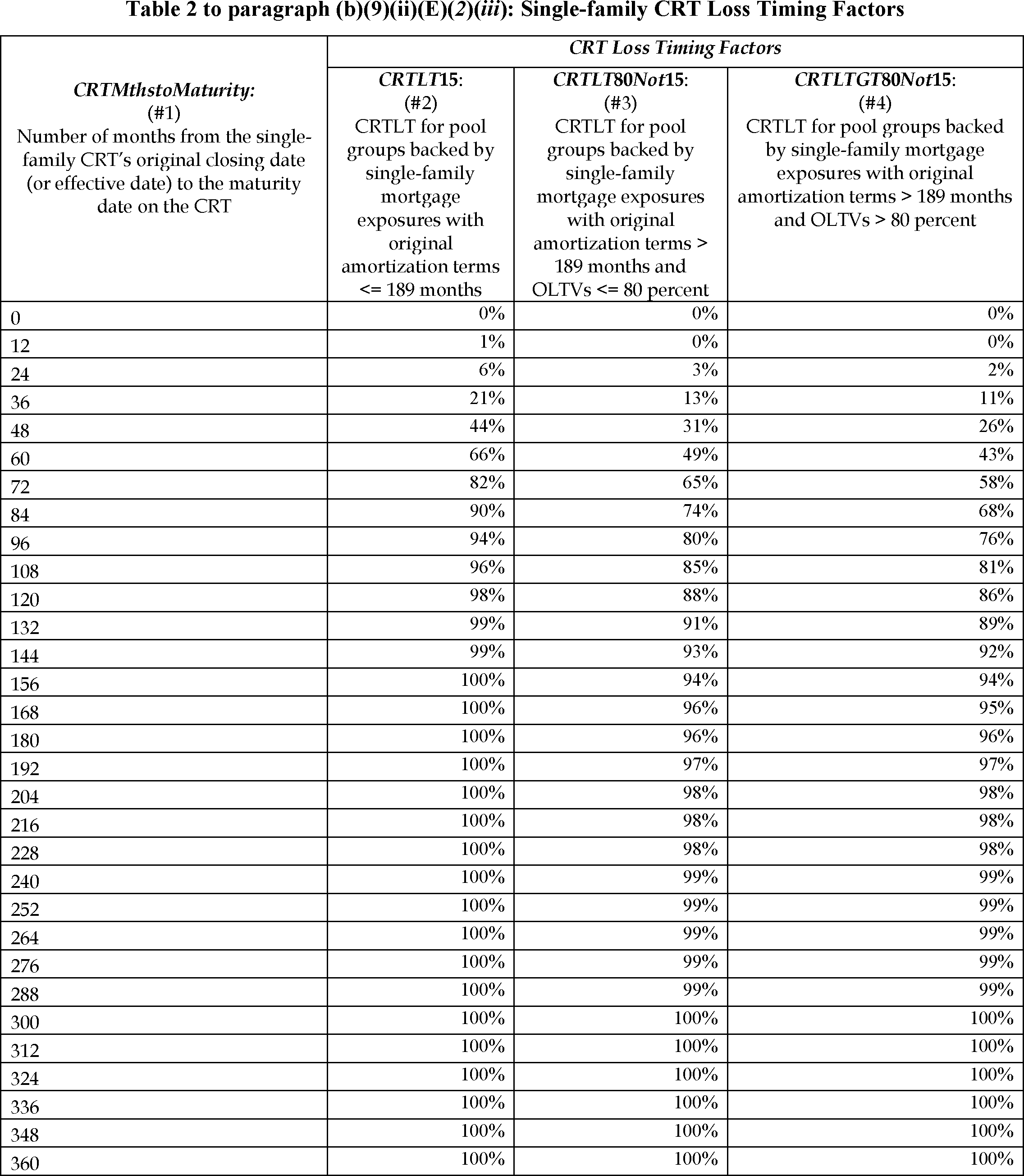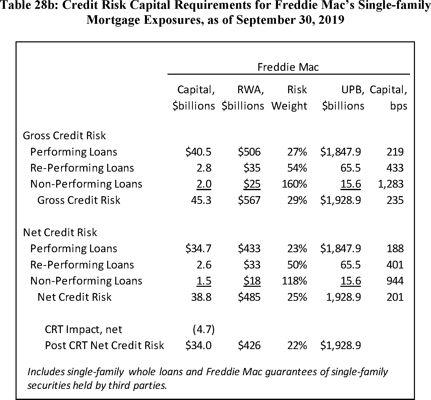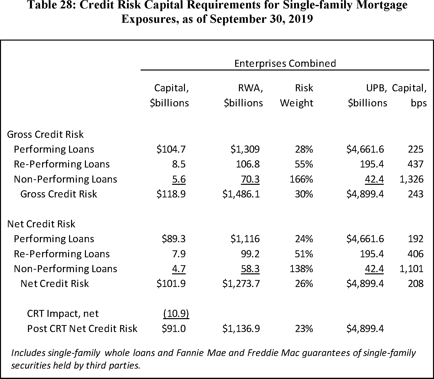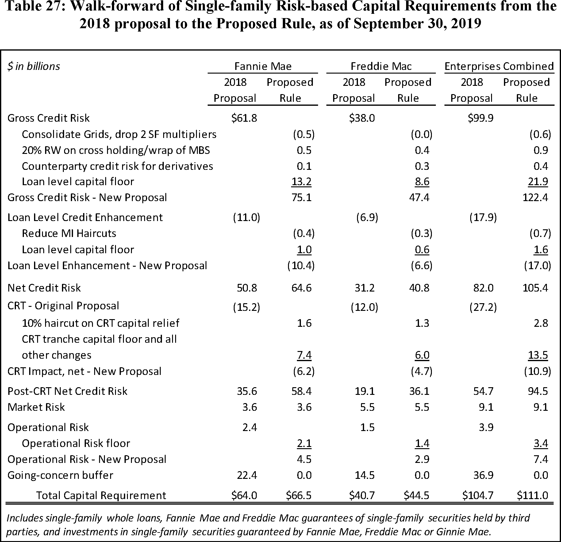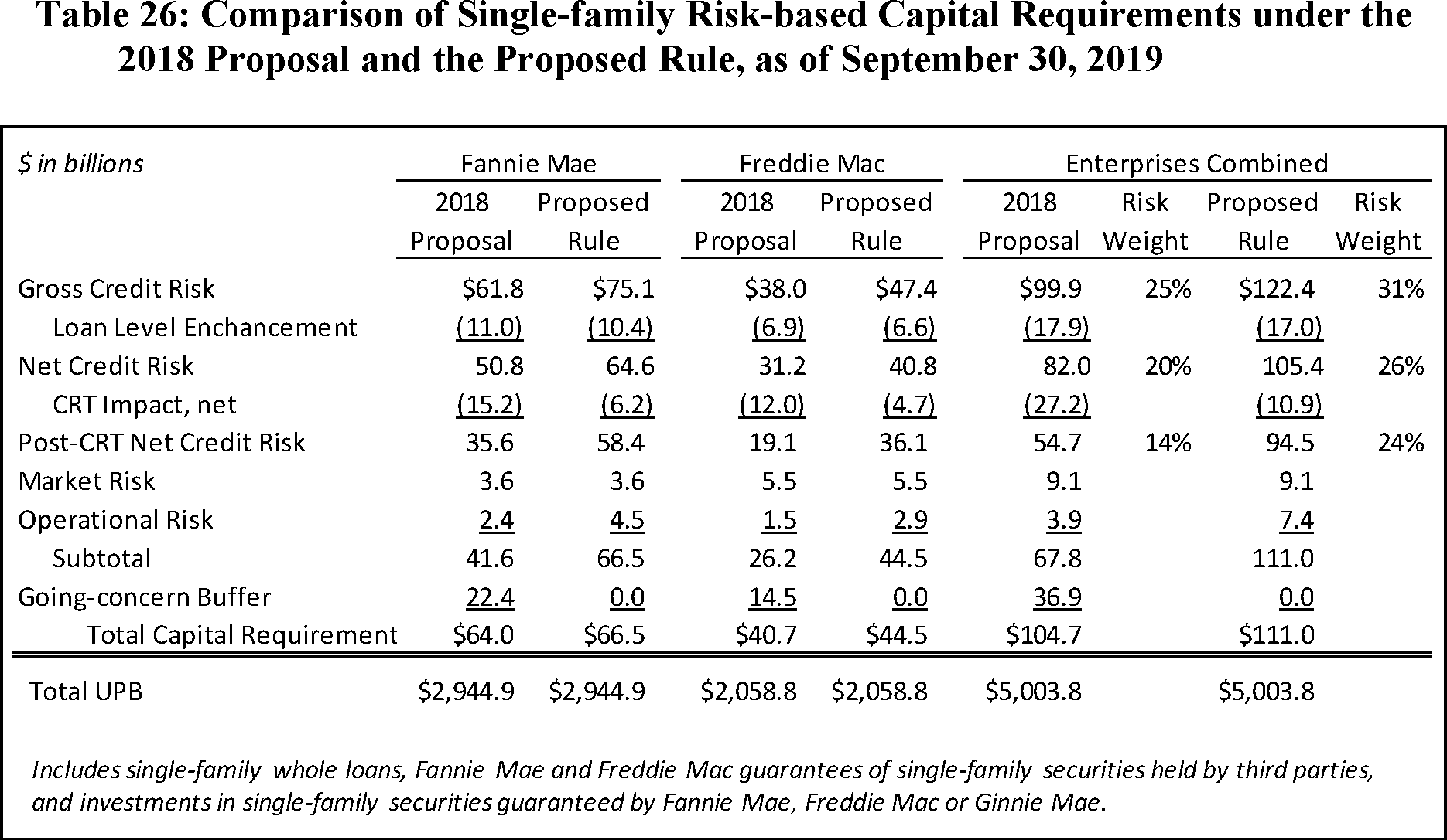 In consideration that the U.S. banking and Basel frameworks utilize OLTVs, a comparison of the credit risk capital requirements for newly acquired single-family mortgage exposures under the 2018 proposal and the proposed rule provides the most direct comparison of credit risk capital requirements for new originations. Under the proposed rule, gross credit risk capital (prior to adjustments for credit enhancements and CRT) on newly originated (*i.e.,* loan age less than six months) single-family mortgage exposures as of September 30, 2019, with an average OLTV of 77 percent, would have been 3.8 percent of unpaid principal balance, implying an average risk weight of 47 percent. This compares to the 50 percent risk weight under the U.S. banking framework and 30 percent under the newest BCBS framework for loans with OLTV of 60 to 80 percent. After consideration of charter-required credit enhancements, the average net credit risk capital requirement on the Enterprises' newly originated single-family mortgage exposures as of September 30, 2019 would have been 2.8 percent of unpaid principal balance, implying an average risk weight of 36 percent. These risk weights would then decline to the extent house prices appreciate or increase to the extent house prices depreciate.