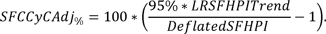 The parameters of the long-run trend are estimated using linear regression on the natural logarithm of real HPI from the Q3 1975 trough to the Q2 2012 trough. Figure 1 shows the fitted values from the estimated long-run trend from Q1 1975 to Q3 2019. FHFA might need to revisit the calibration of the parameters in the event of future troughs.
