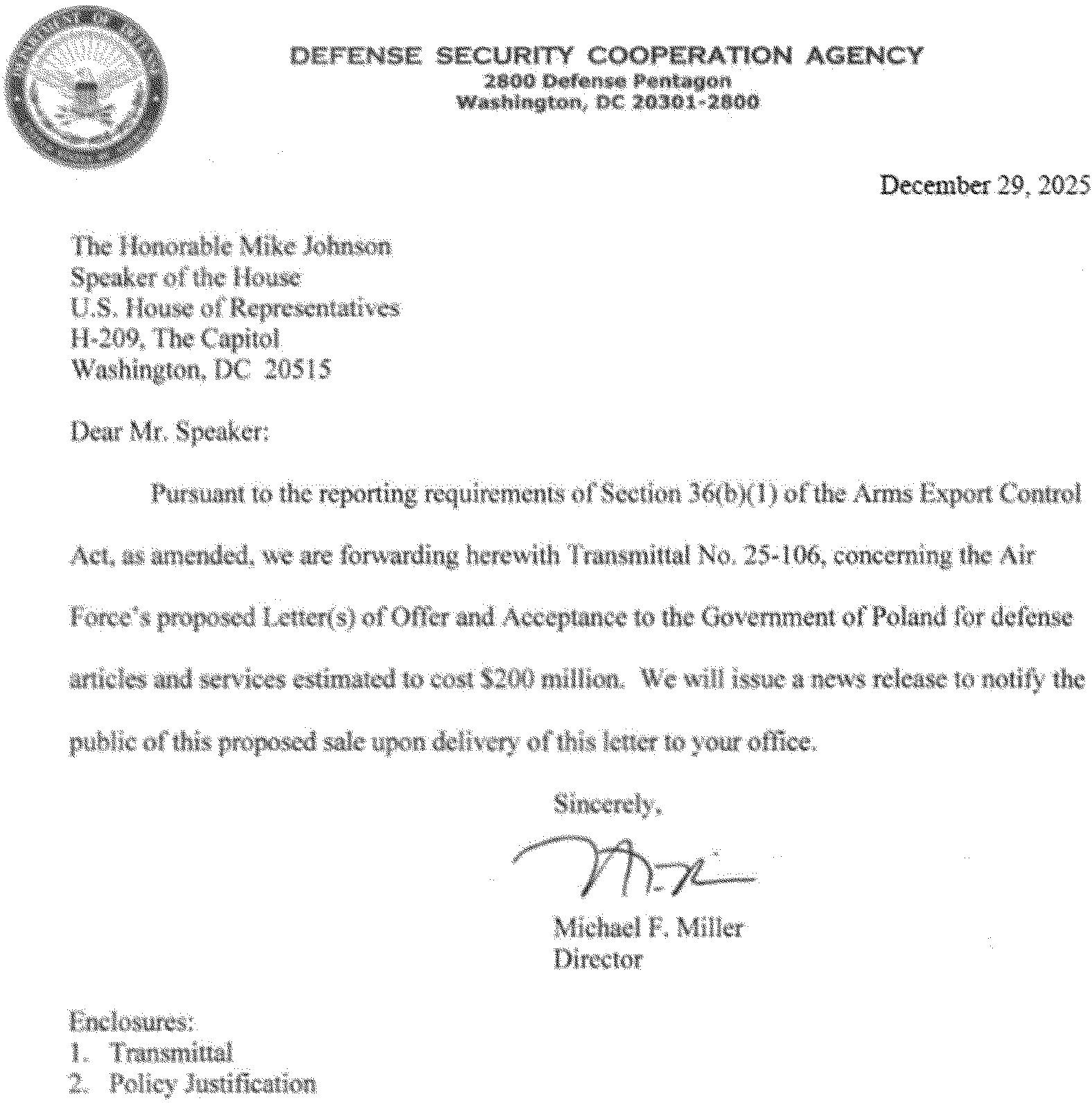 The Department of Defense has published a notice concerning a proposed arms sale to Poland, identified as Transmittal No. 25-106. This notification, published in the Federal Register on March 10, 2026, pertains to a blanket order for training and is issued under Section 36(b)(1) of the Arms Export Control Act.