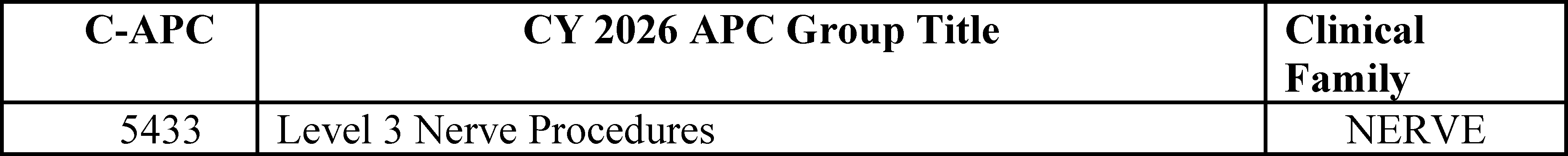 - On page 53474, in the table titled “TABLE 4: FINAL CY 2026 C-APCs”, after the entry “5432, Level 2 Nerve Procedures, NERVE” (row 10), add a new row to read as: