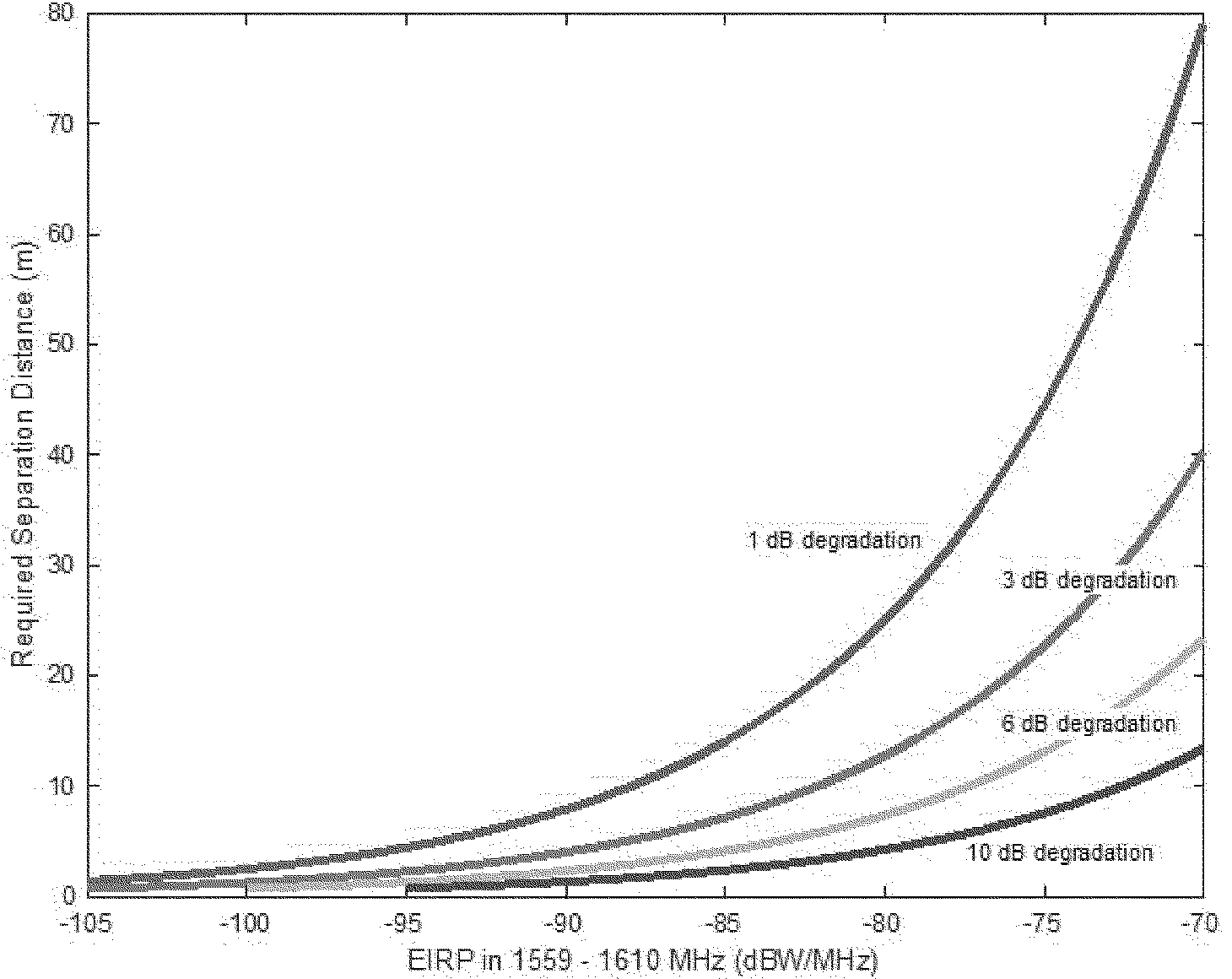 This received interference power density occurs at a distance, d, of 79.1 m using free space propagation loss for the GNSS
