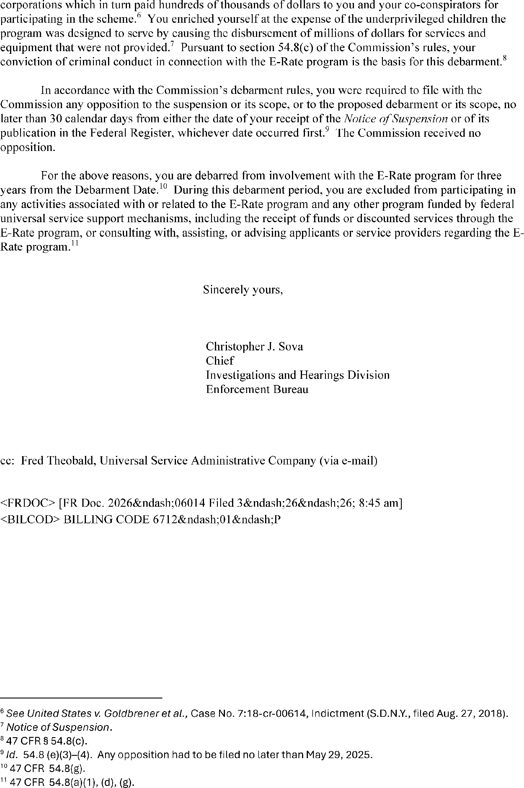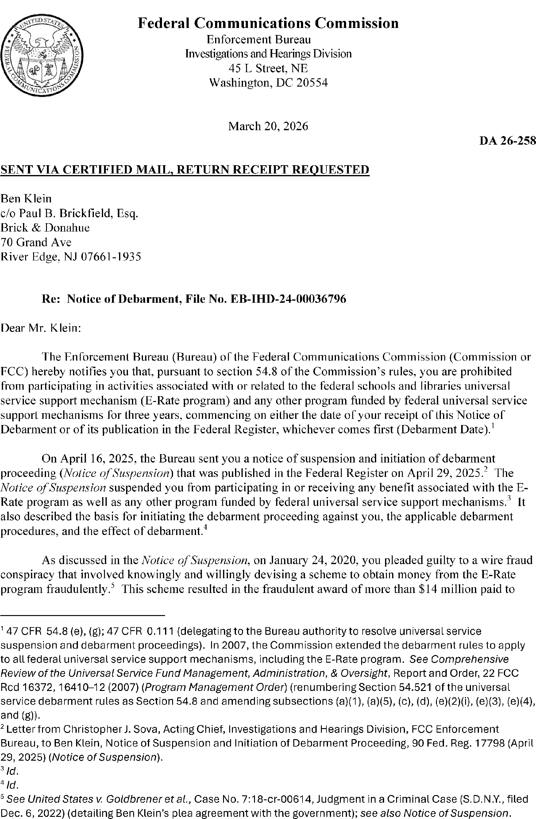 to 47 CFR 54.8. Attached is the debarment letter, DA 26-258, which was mailed to Mr. Klein and released on March 27, 2026.