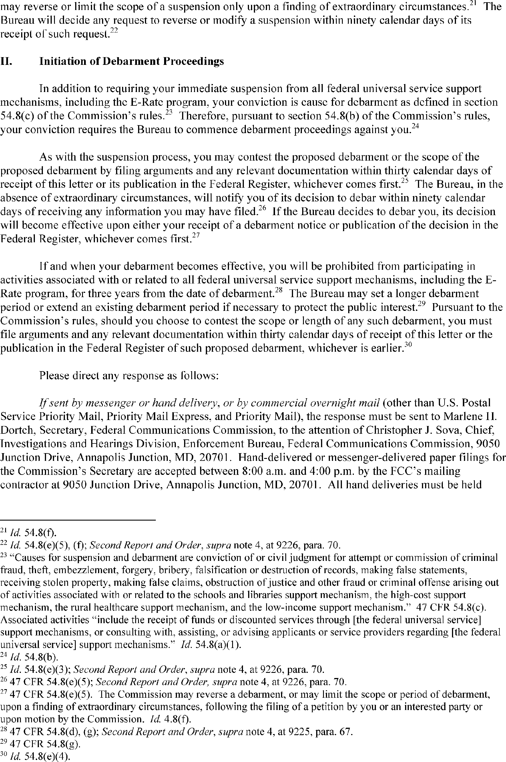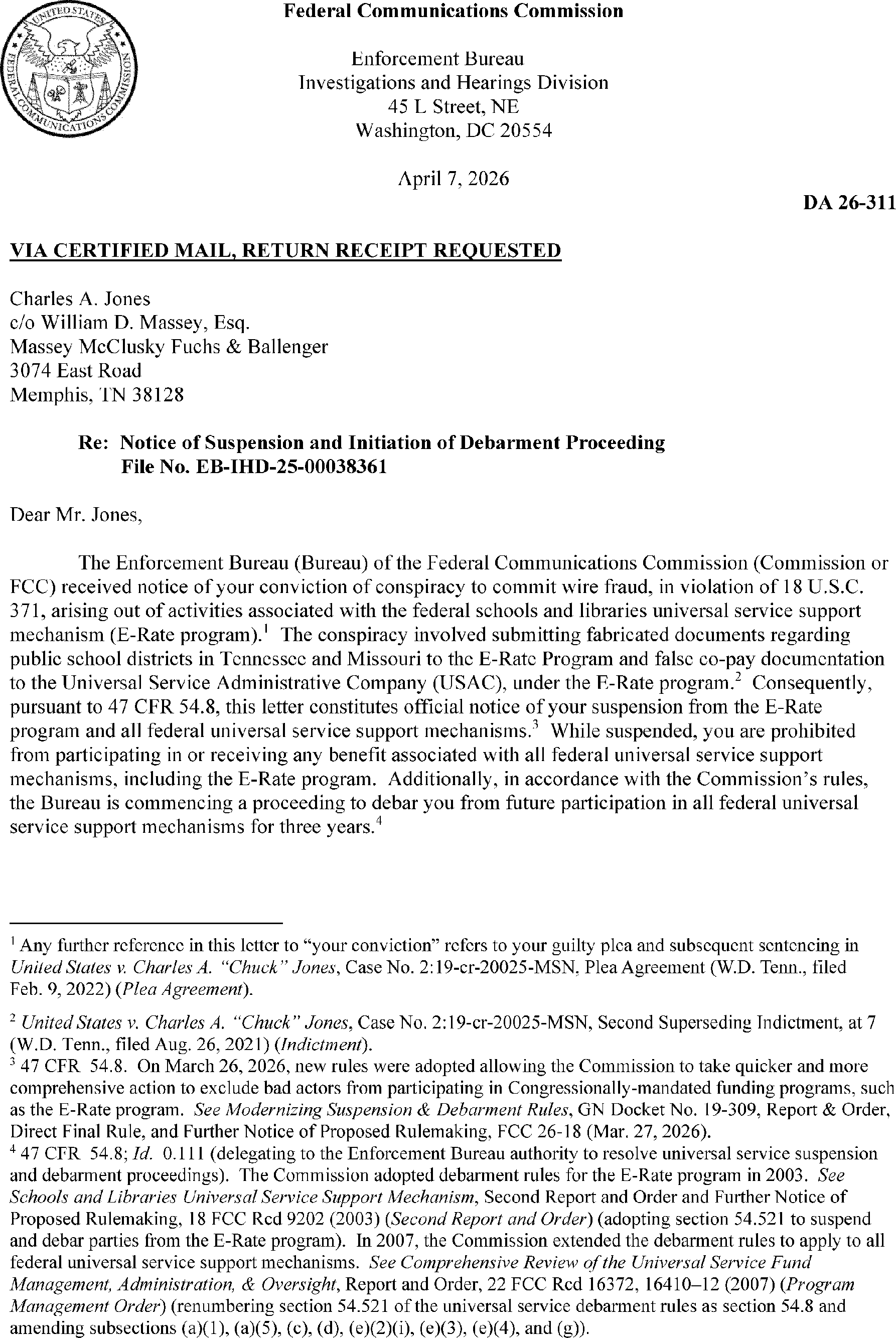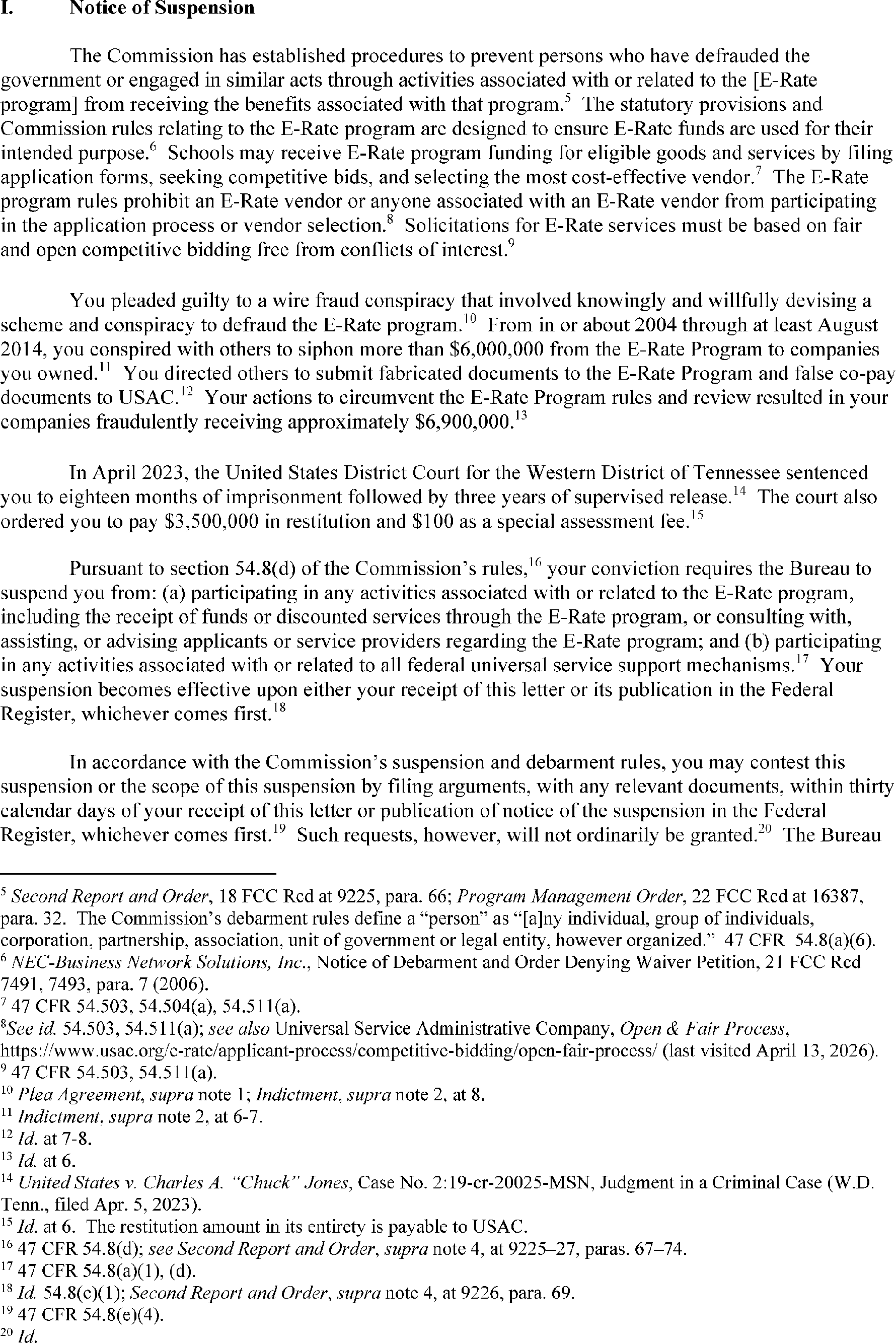 The Bureau has suspension and debarment authority pursuant to 47 CFR 54.8 and 47 CFR 0.111(a)(14). Suspensions ensure that suspended parties cannot continue to benefit from the schools and libraries mechanism pending resolution of the debarment process. Attached is the suspension letter, DA 26-311, which was mailed to Mr. Jones, and released on April 16, 2026. The complete text of the notice of suspension and initiation of debarment proceedings is available on the FCC's website at https://docs.fcc.gov/public/attachments/DA-26-311A1.pdf.