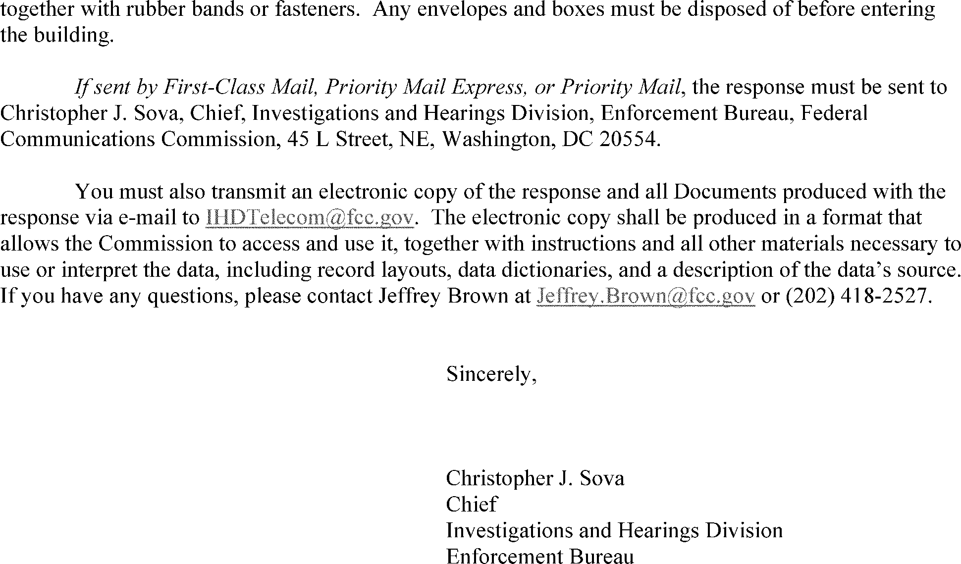 Christopher Sova, Federal Communications Commission, Enforcement Bureau, Investigations and Hearings Division, 45 L Street NE, Washington, DC 20554. Christopher Sova may be contacted by phone at (202) 418-1868 or by email at Christopher.Sova@fcc.gov.