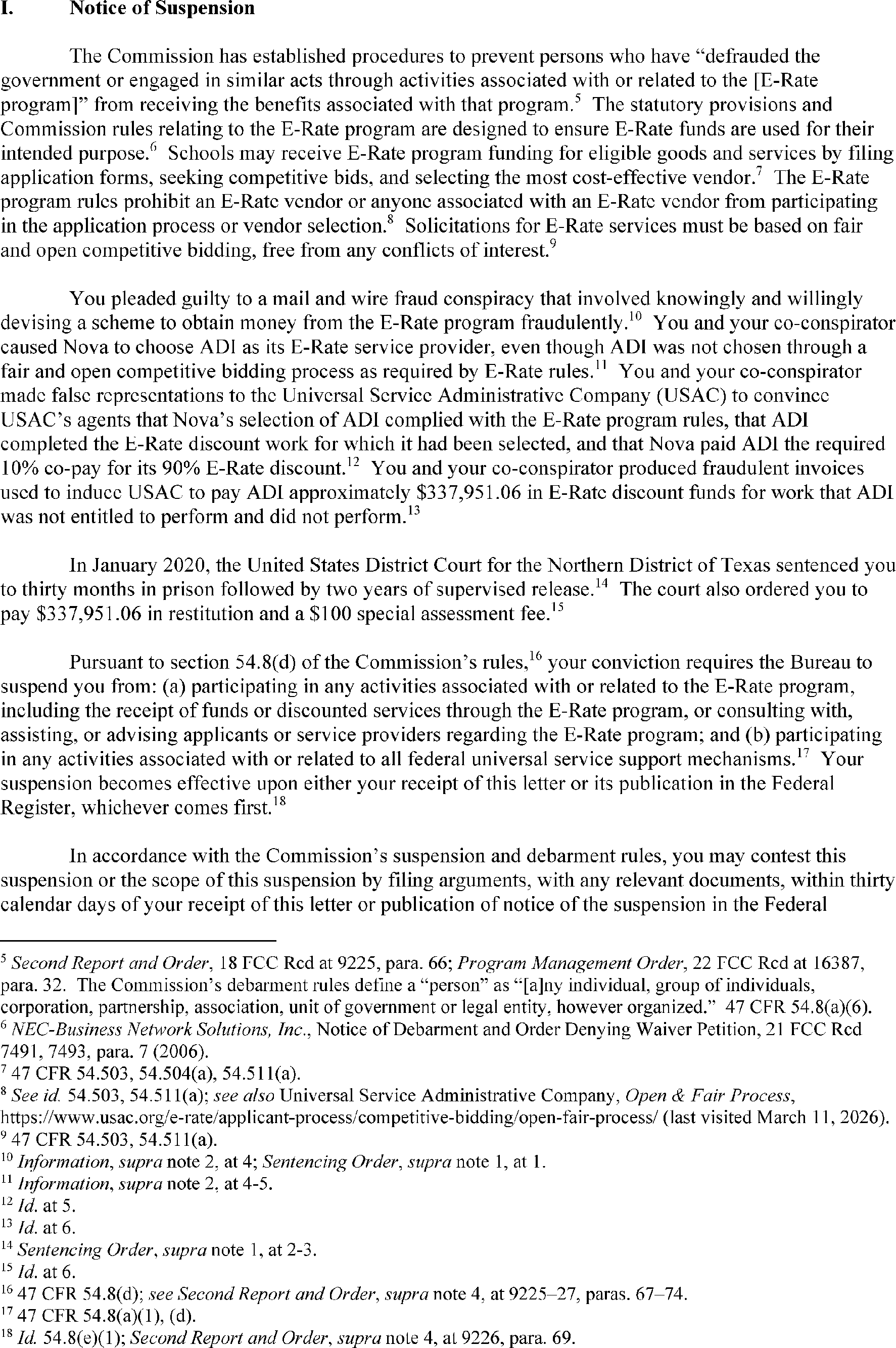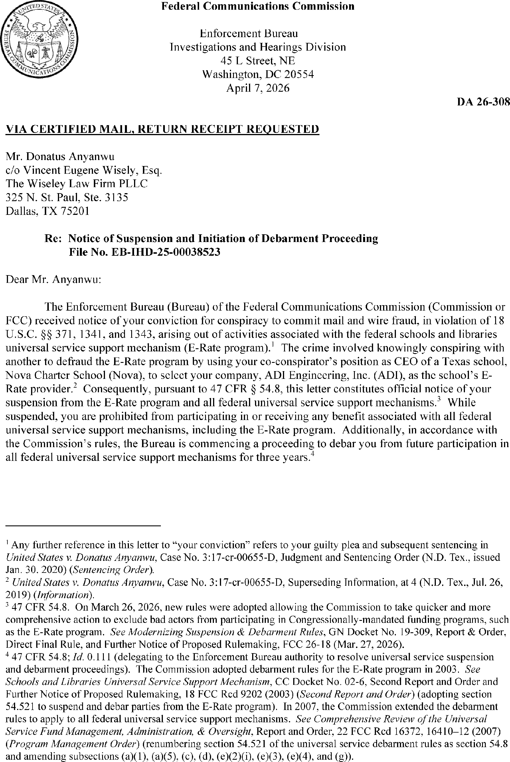The Bureau has suspension and debarment authority pursuant to 47 CFR 54.8 and 47 CFR 0.111(a)(14). Suspensions ensure that suspended parties cannot continue to benefit from the schools and libraries mechanism pending resolution of the debarment process. Attached is the suspension letter, DA 26-308, which was mailed to Mr. Anyanwu, and released on April 13, 2026. The complete text of the notice of suspension and initiation of debarment proceedings is available on the FCC's website at https://docs.fcc.gov/public/attachments/DA-26-308A1.pdf.
