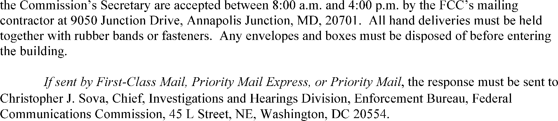 Federal Communications Commission, Enforcement Bureau, Investigations and Hearings Division, 45 L Street NE, Washington, DC 20554.