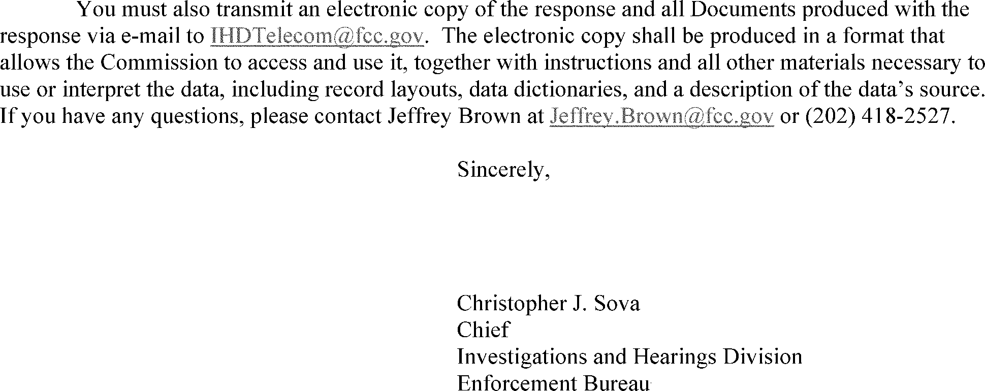 Christopher Sova, Federal Communications Commission, Enforcement Bureau, Investigations and Hearings Division, 45 L Street NE, Washington, DC 20554. Christopher Sova may be contacted by phone at (202) 418-1868 or by email at Christopher.Sova@fcc.gov.