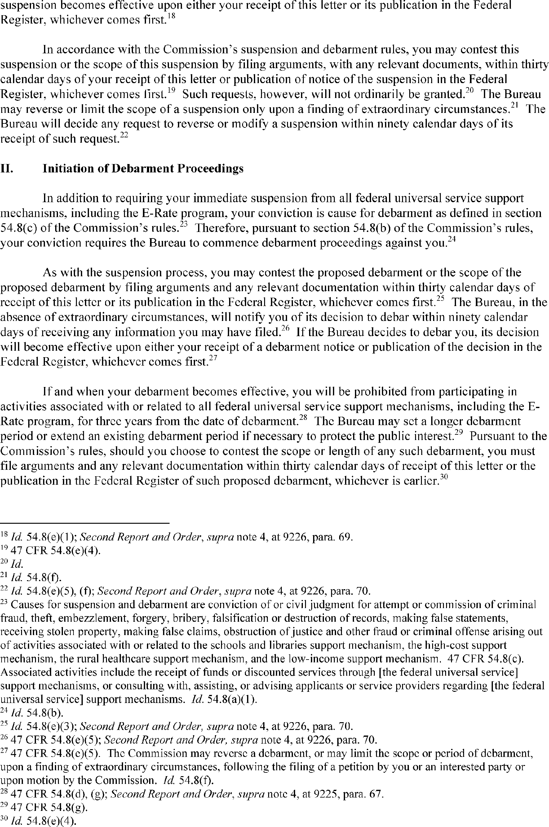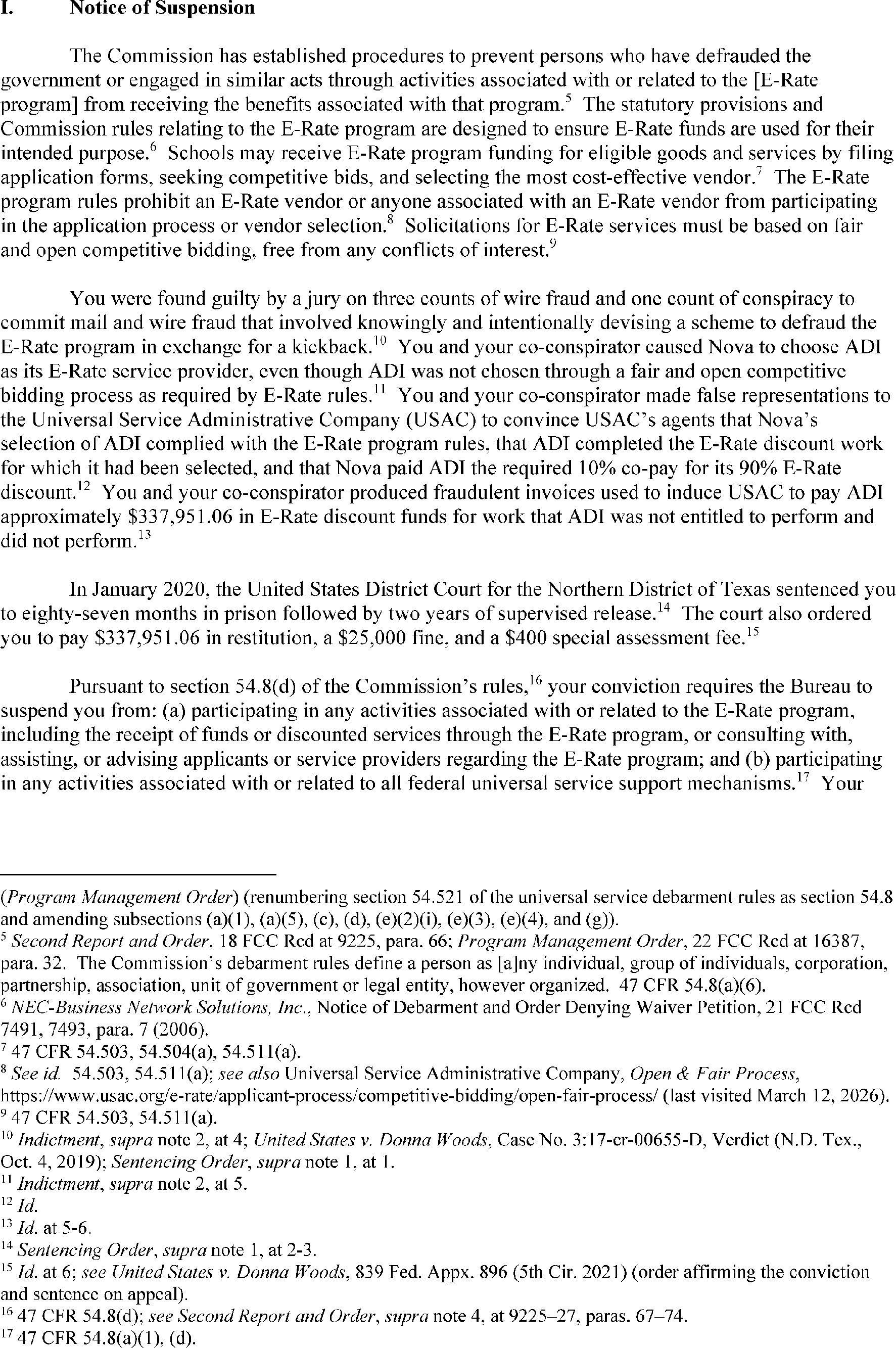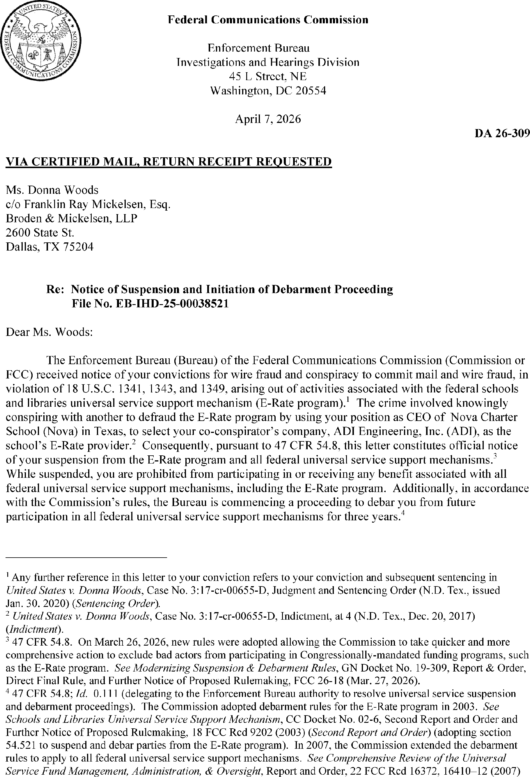 The Bureau has suspension and debarment authority pursuant to 47 CFR 54.8 and 47 CFR 0.111(a)(14). Suspensions ensure that suspended parties cannot continue to benefit from the schools and libraries mechanism pending resolution of the debarment process. Attached is the suspension letter, DA 26-309, which was mailed to Ms. Woods, and released on April 16, 2026. The complete text of the notice of suspension and initiation of debarment proceedings is available on the FCC's website at https://docs.fcc.gov/public/attachments/DA-26-309A1.pdf.