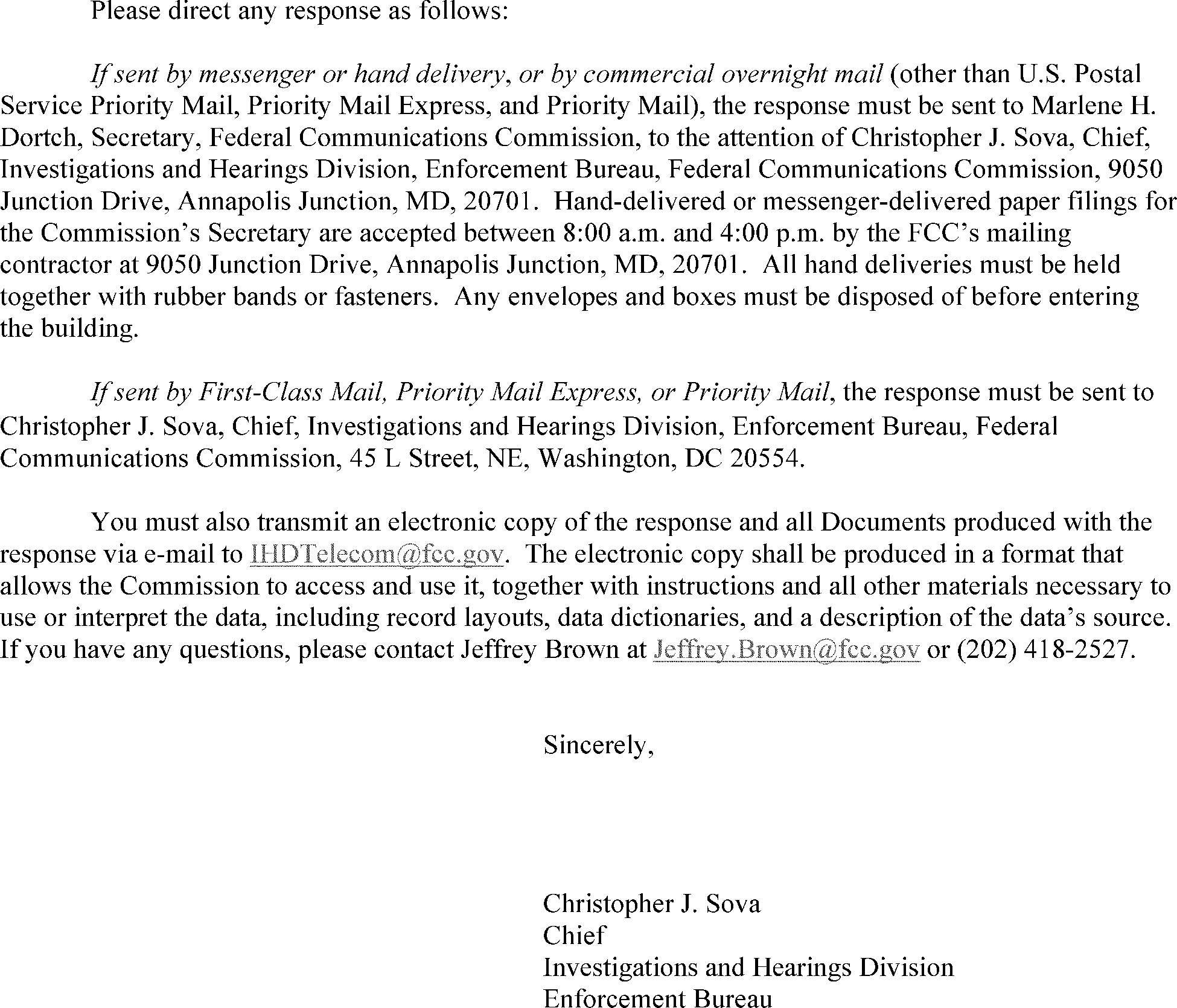Christopher Sova, Federal Communications Commission, Enforcement Bureau, Investigations and Hearings Division, 45 L Street NE, Washington, DC 20554. Christopher Sova may be contacted by phone at (202) 418-1868 or by email at Christopher.Sova@fcc.gov.
