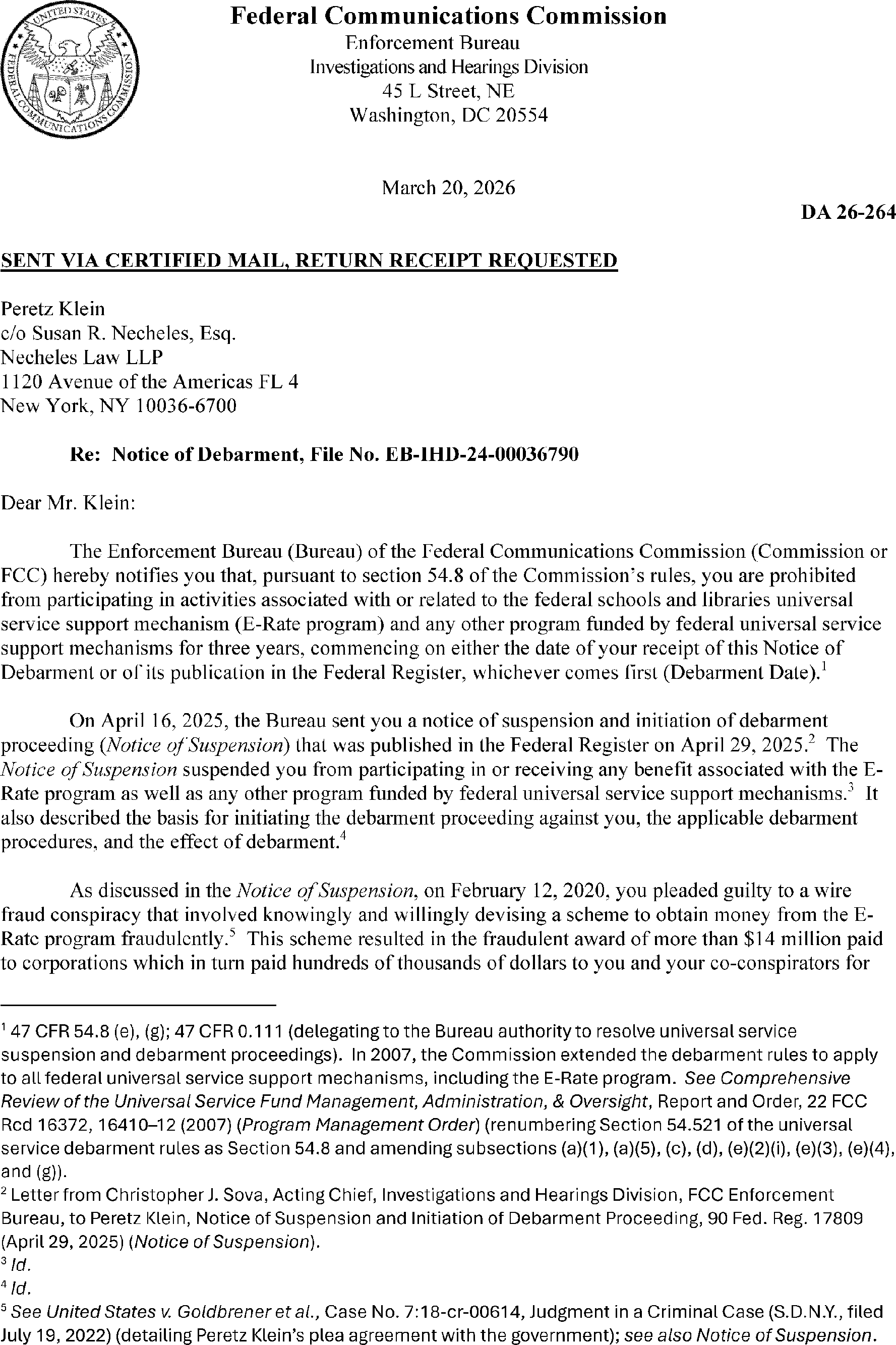 The Bureau debars Mr. Klein from the E-Rate program and all federal universal service support mechanisms for three years pursuant to 47 CFR 54.8. Attached is the debarment letter, DA 26-264, which was mailed to Mr. Klein and released on April 3, 2026. The complete text of the notice of debarment is available on the FCC's website at https://docs.fcc.gov/public/attachments/DA-26-264A1.pdf.