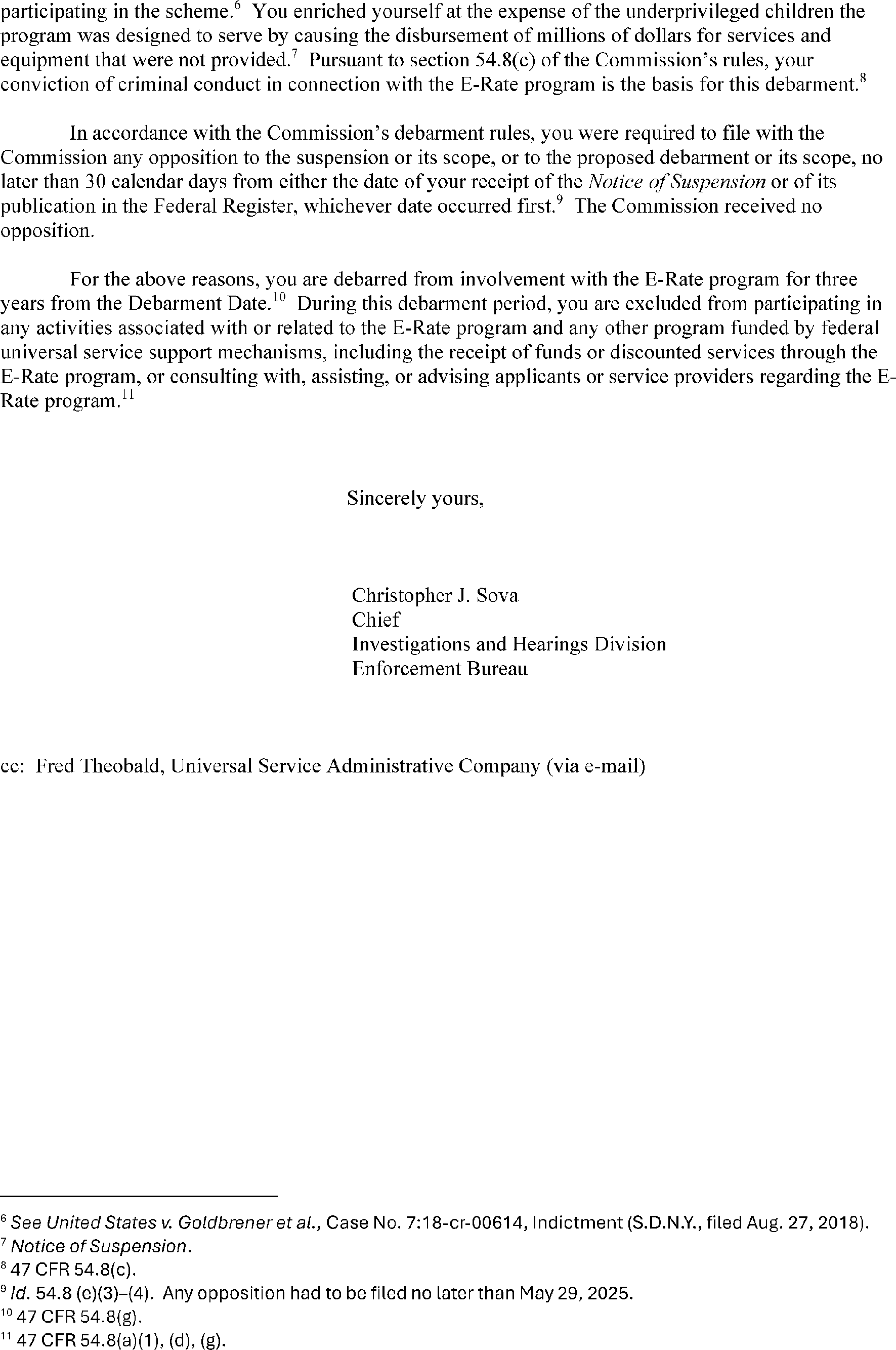 The FCC Enforcement Bureau has debarred Peretz Klein from the E-Rate program and all federal universal service support mechanisms for three years. The debarment takes effect April 3, 2026 or upon receipt of the debarment letter, whichever is first, pursuant to 47 CFR 54.8. This enforcement action prohibits Klein from participating in these programs through approximately April 2029.
