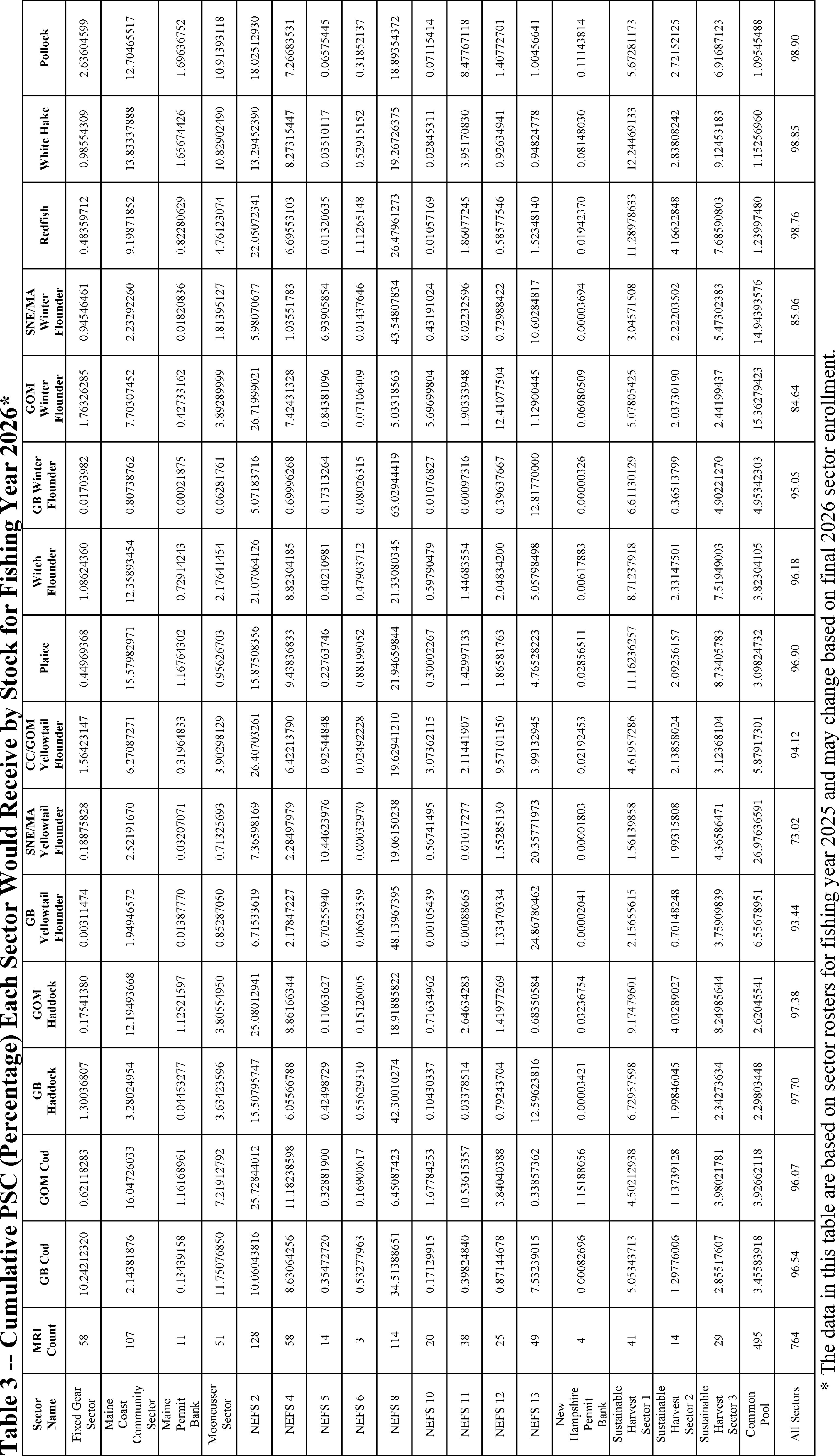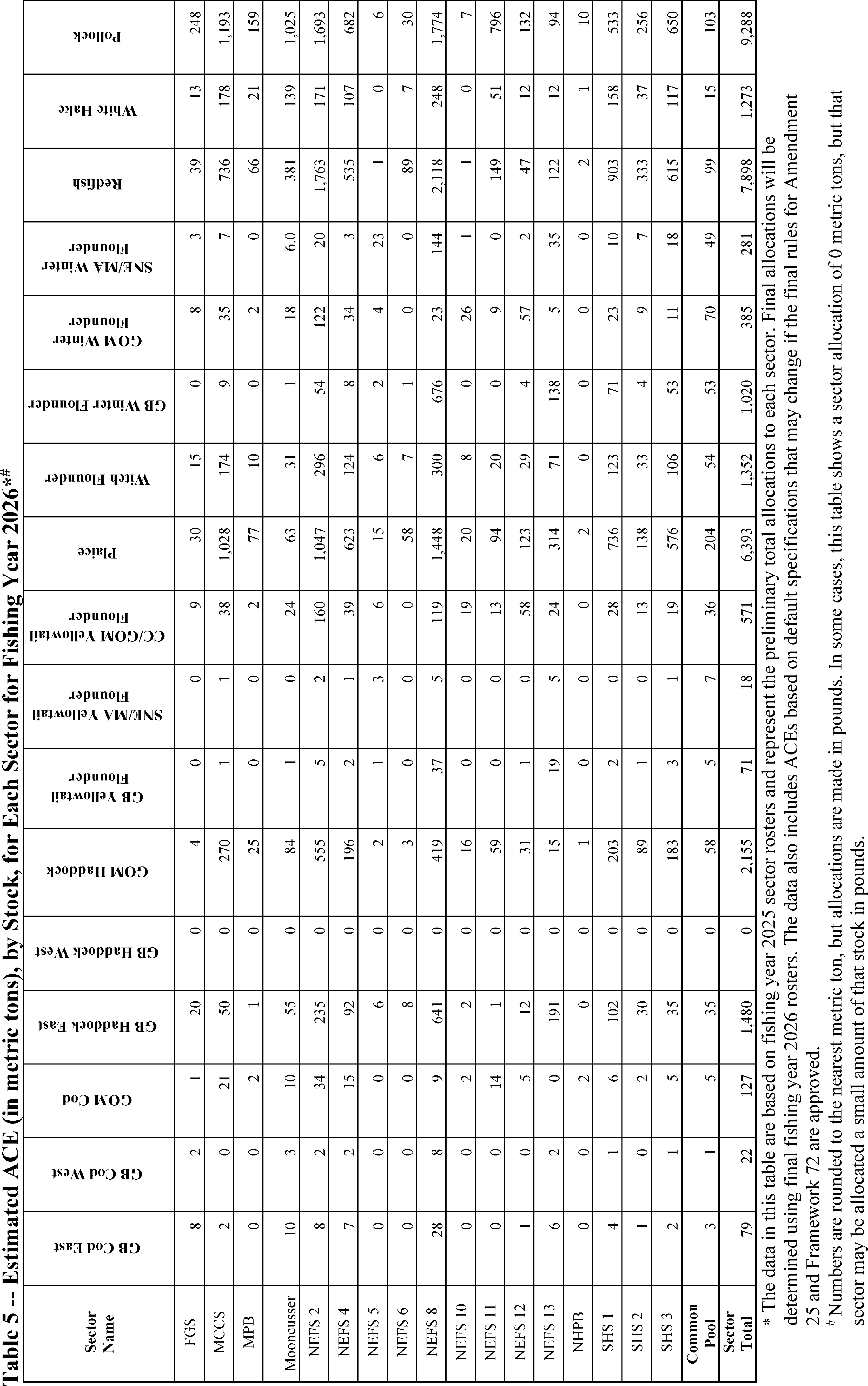 NMFS calculates the sector's allocation for each stock by summing its members' potential sector contributions (PSC) for a stock and then multiplying that total percentage by the available commercial sub-ACL for that stock. Table 3 shows the preliminary projected total PSC for each sector, by stock, for fishing year 2026 based on fishing year 2025 sector rosters. Tables 4 and 5 show estimates of the preliminary allocations that each sector will be allocated, in pounds and metric tons, respectively, for fishing year 2026, based on their fishing year 2025 rosters and the 2026 catch limits established in Framework 69 or default specifications.