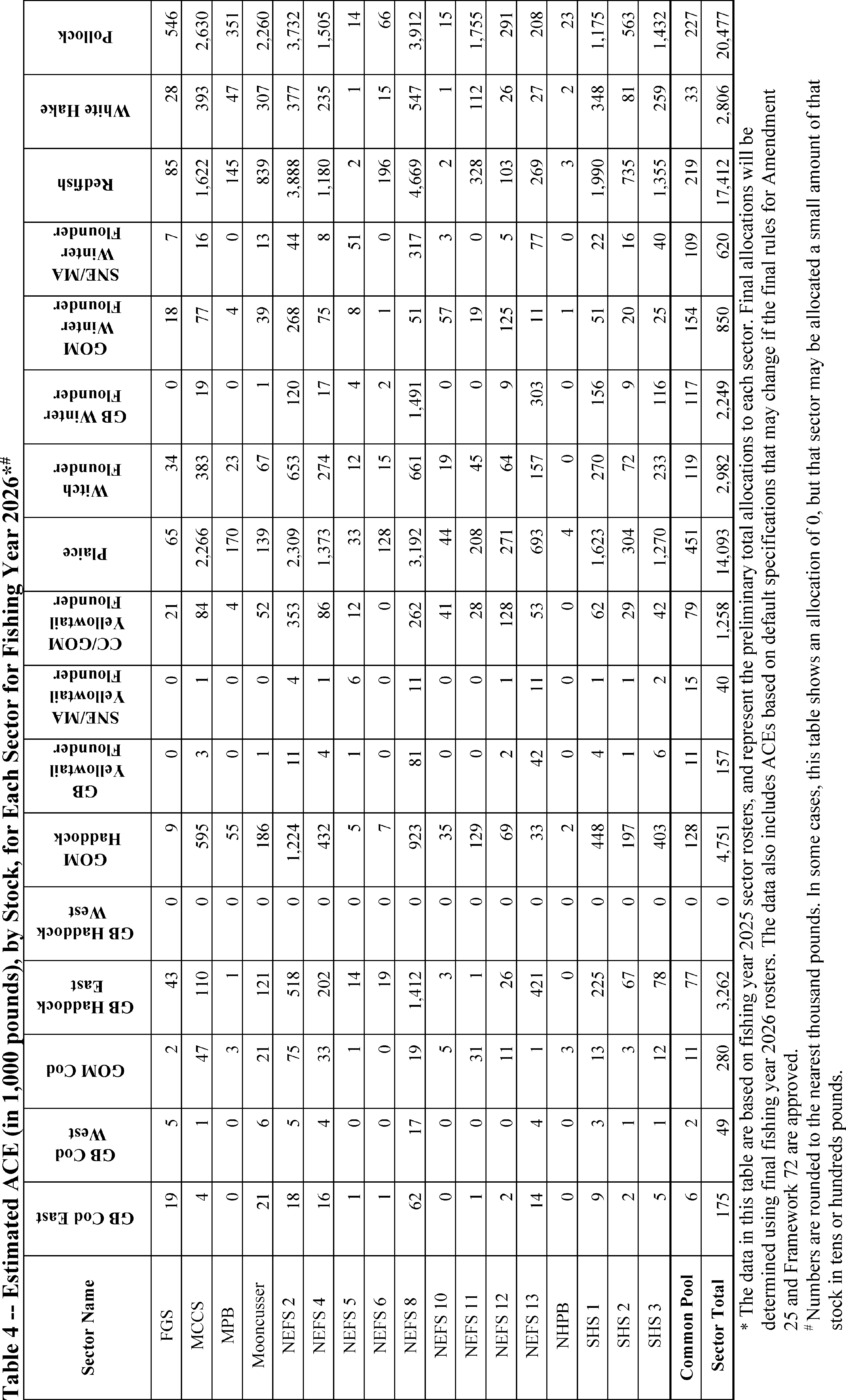 This rule allocates ACE to sectors and permit banks based on the fishing year 2025 sector rosters and the 2026 catch limits established in Framework 69 or default specifications. Preliminary fishing year 2026 sector rosters had not been submitted to NMFS at the time this rule was prepared. All permit holders who join a sector for fishing year 2026 have until April 30, 2026, to withdraw and instead elect to fish in the common pool, although sectors may specify a more restrictive withdrawal date for their members. As a result, the total permits enrolled in sectors for fishing year 2026 could change from the current fishing year 2025 rosters, although such changes are expected to be minimal based on past fishing years.