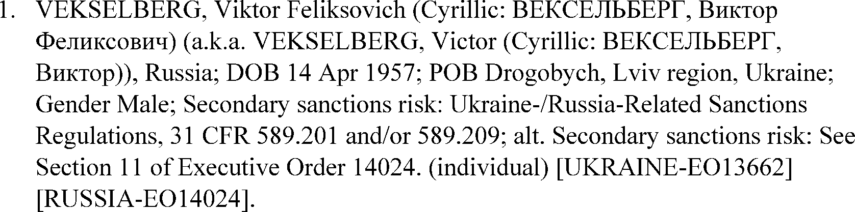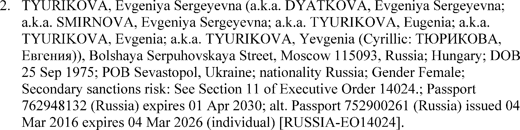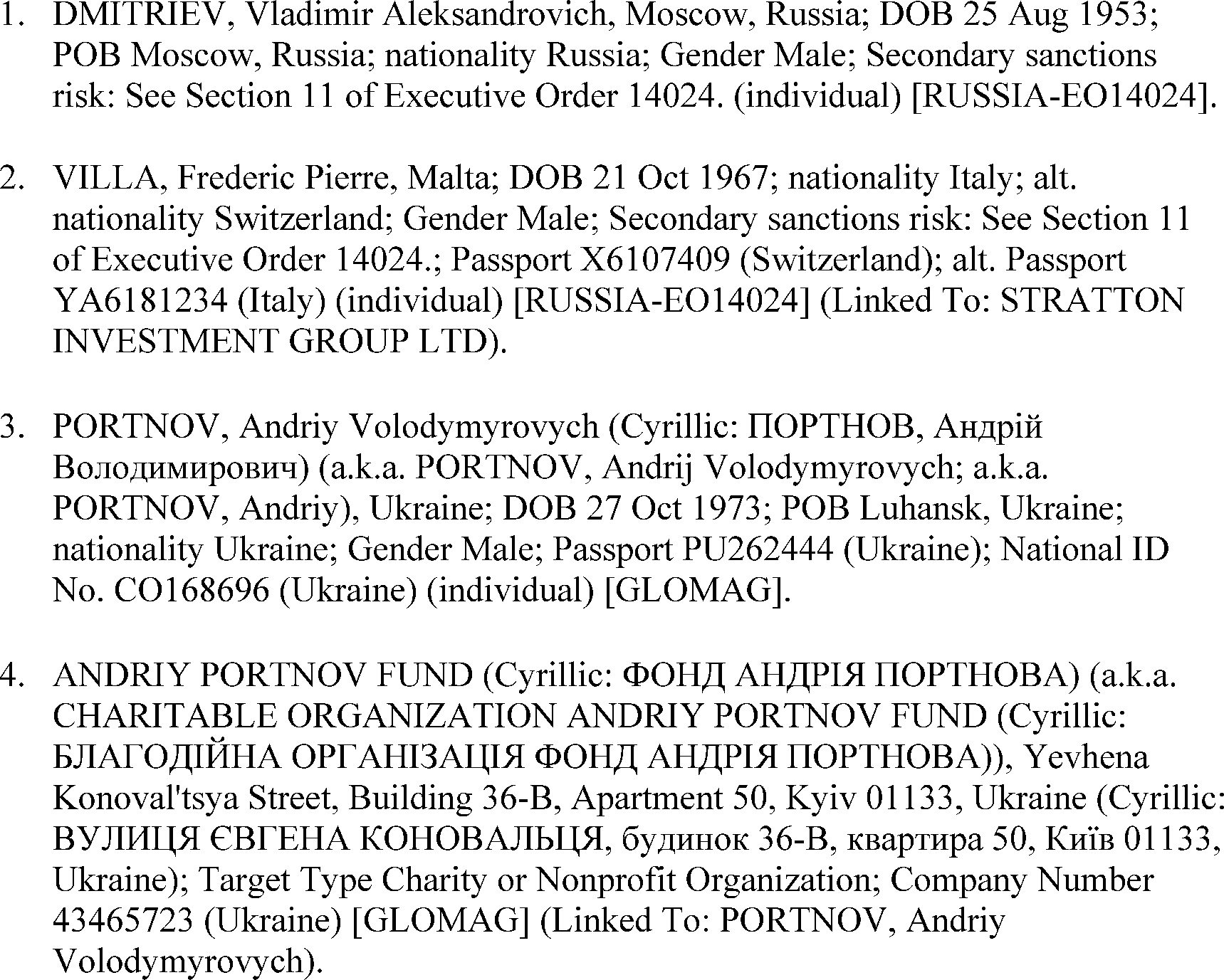I. As of March 31, 2026, OFAC is correcting the following previously published information regarding the designation of the following person. OFAC previously noted that the person was designated pursuant to sections 1(a)(i) and 1(a)(vii) of E.O. 14024 for operating or having operated in the financial services sector of the Russian Federation economy and for being owned or controlled by, or having acted or purported to act for or behalf of, directly or indirectly, the Government of the Russian Federation. OFAC is correcting this information to reflect that this person was designated pursuant to sections 1(a)(i) and 1(a)(vii) of E.O. 14024 for operating or having operated in the technology sector of the Russian Federation economy and for being owned or controlled by, or having acted or purported to act for or behalf of, directly or indirectly, the Government of the Russian Federation.