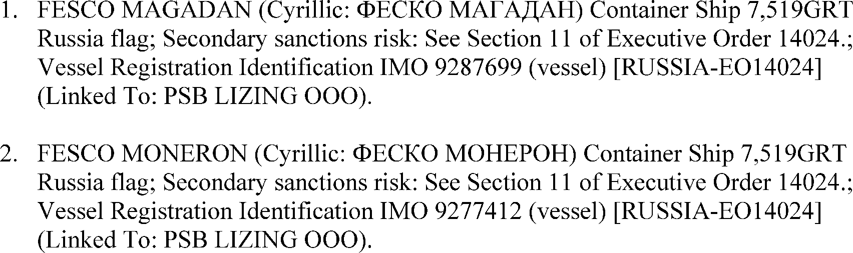 SV NIKOLAY (UBTU6) General Cargo 5,897GRT Russia flag; Secondary sanctions risk: See Section 11 of Executive Order 14024.; Vessel Registration Identification IMO 9482926; MMSI 273215770 (vessel) RUSSIA-EO14024.
