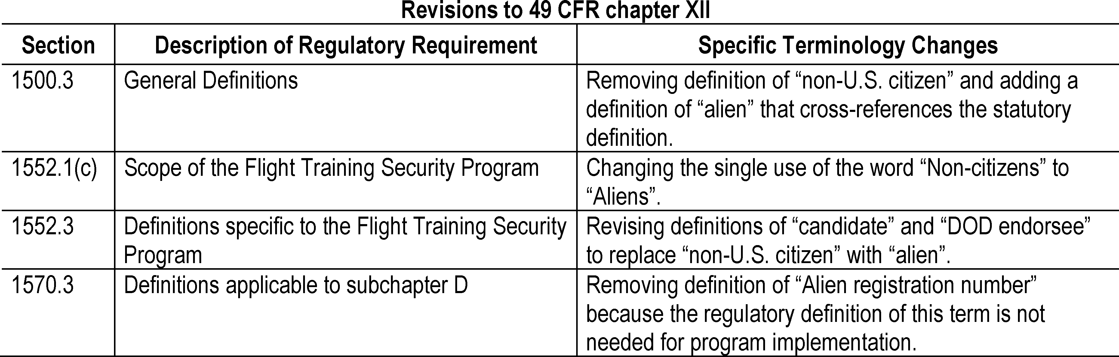 This final rule makes technical amendments to certain sections of the CFR to align TSA's regulatory language with statutory terms and definitions in the Immigration and Nationality Act, such as “alien” rather than “non-citizen”. In general, the technical amendments are limited to replacing the term “non-U.S. citizen” with the term “alien” wherever the term appears in TSA regulations. In one instance, TSA is removing a definition that includes the word “non-U.S. citizen” because the definition is no longer needed in the regulation. The following table identifies the context for each change in 49 CFR chapter XII.