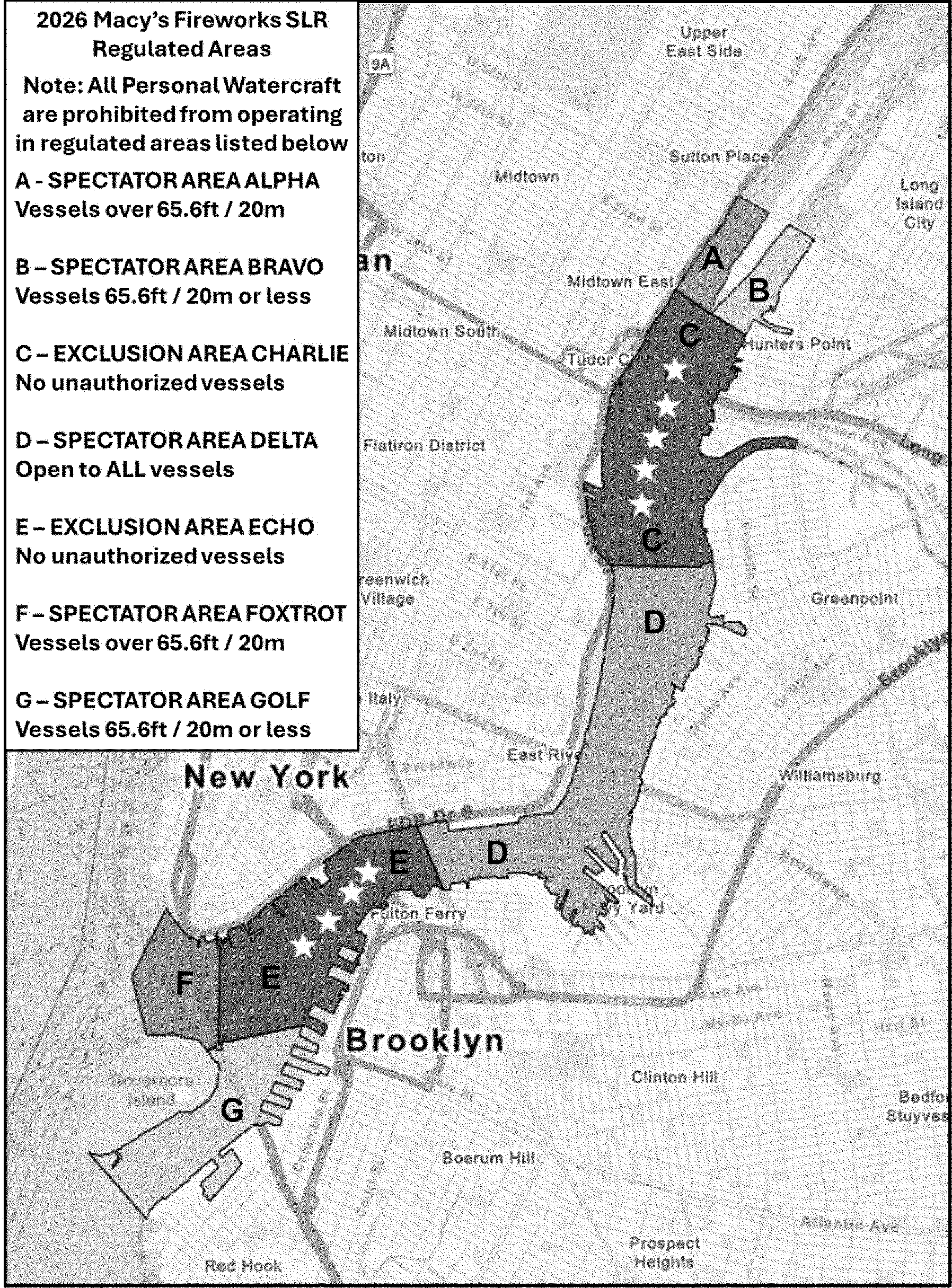 The Coast Guard is proposing a temporary Special Local Regulation (SLR) for Macy's 2026 4th of July fireworks display in the East River and Upper New York Bay. The regulation would establish vessel movement controls, protection zones around fireworks barges, exclusion zones near launch sites, and spectator zones. Public comments are due May 6, 2026.