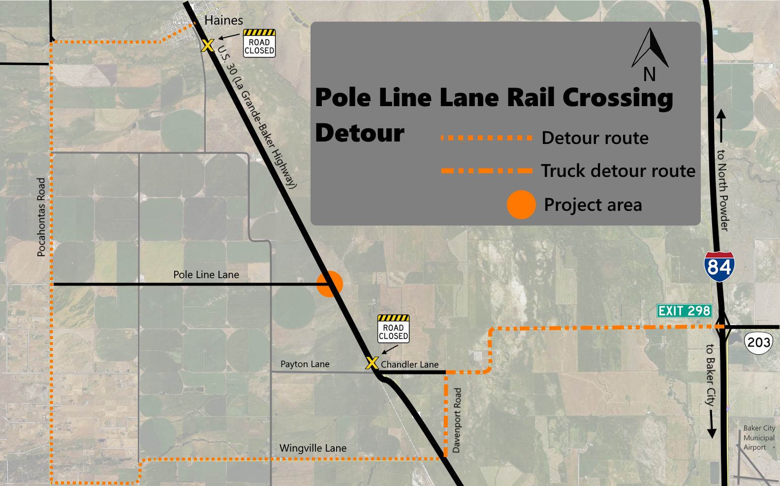 HAINES – Travelers on Pole Line Lane and U.S. 30 between Haines and Baker City should expect road closures beginning April 17 as crews begin railroad crossing improvement work on Pole Line Lane. Signed detours will be in place.