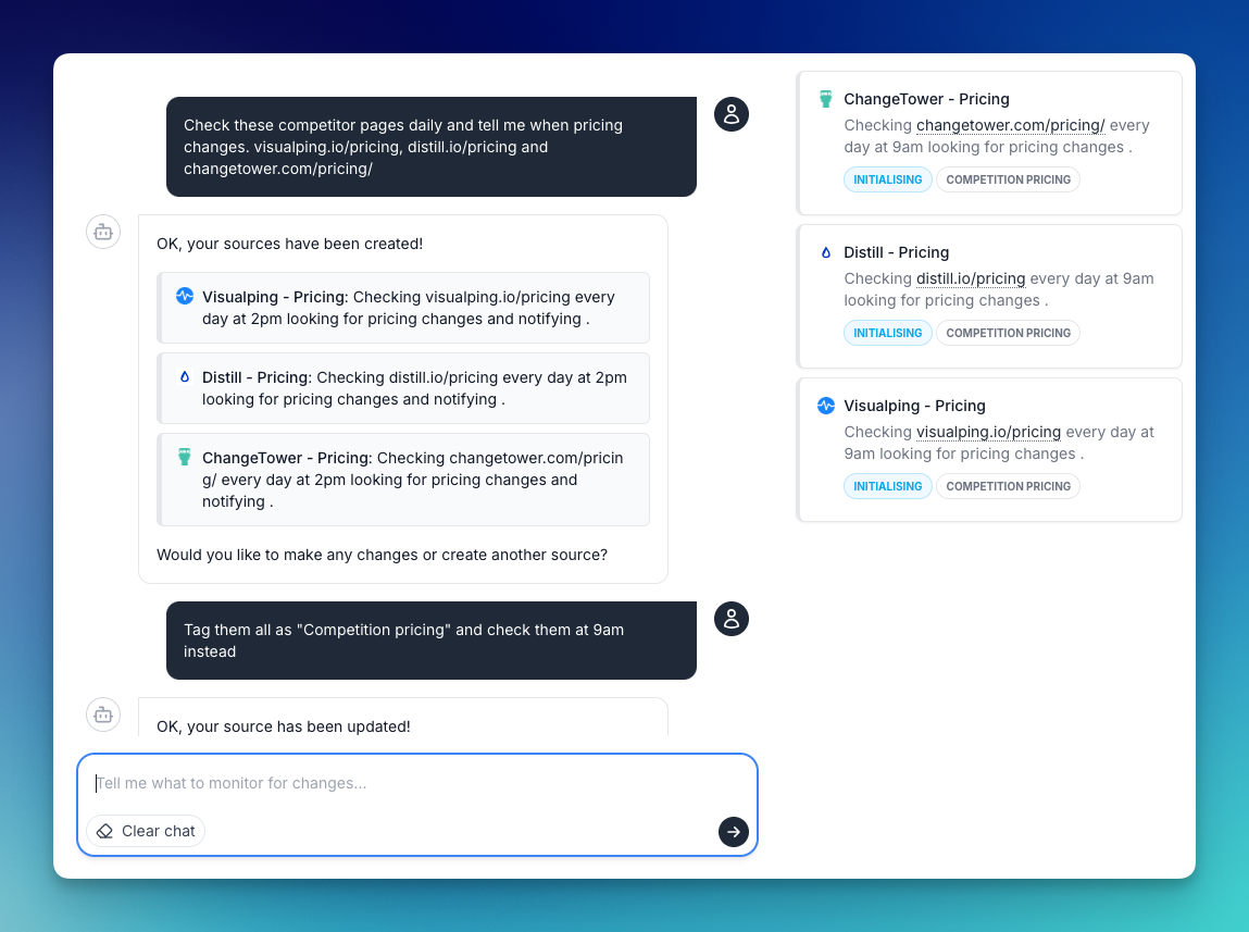 - Describe what you want to track including the URL or URLs of the pages to track, details of what changes you care about and how often you want to check for changes. You can also tell the chatbot what to name your source, and ask it to add tags and notification addresses too. Notification addresses are email addresses that will be sent the change notifications. See some example prompts below