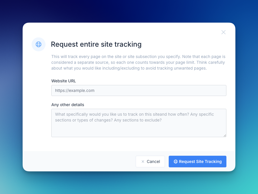 Example: If you're tracking a competitor's blog and they publish a new post, you'll get notified about the new page immediately, not just when you manually add it.
