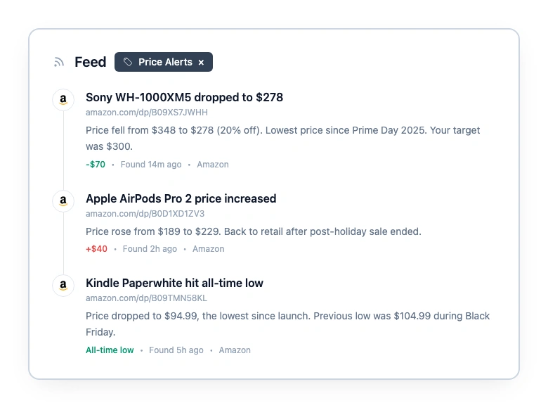 Changeflow monitors any webpage for changes. Add a pricing page URL, tell the AI what you care about, and get alerts with plain-English summaries when something changes. It's not an Amazon-specific tool. It's for tracking price changes everywhere else.