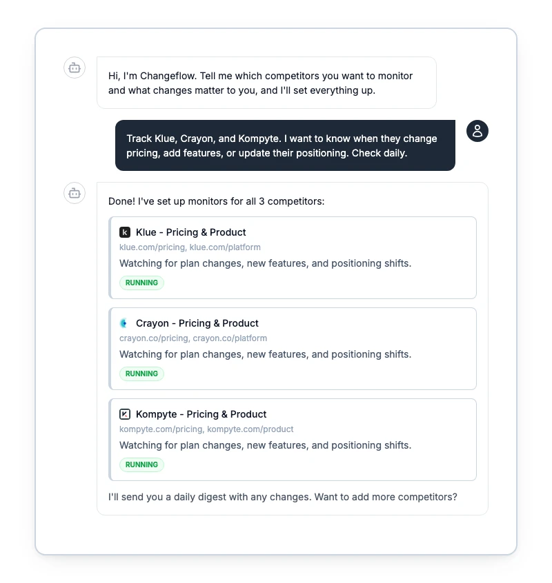 Changeflow handles the website monitoring piece. Add a competitor URL, tell the AI what you care about, get alerts when things change. Used by teams at Pfizer, Microsoft, and DLA Piper.