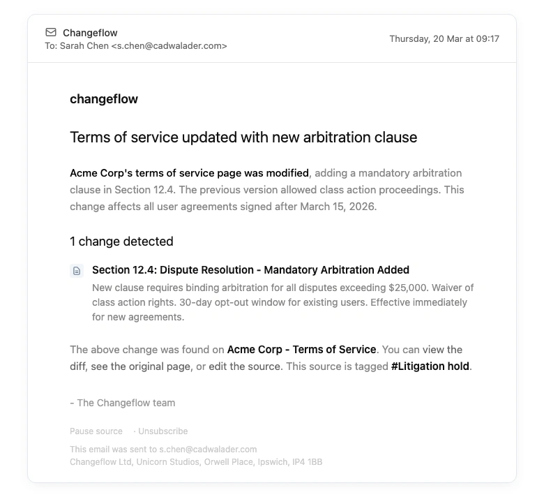 Changeflow captures web pages with timestamps and metadata. Build a defensible evidence trail without manual screenshots.