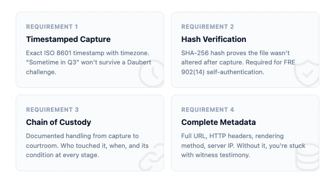 Screenshots fail on all four counts. They strip metadata. They lack hash values. They show only what the person chose to capture. And there's no chain of custody connecting the screenshot file to the original webpage.