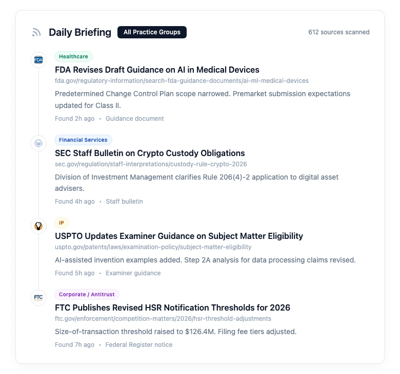This is what the Slaw article from the Canadian Bar identifies as the core gap in library current awareness: monitoring agency web content is largely invisible to the existing stack. An SEC staff bulletin on crypto custody. An FDA draft guidance on AI in medical devices. An OCC update to its examination handbook. A CFPB blog post signaling enforcement priorities. These are the changes that affect day-to-day practice, and they live on agency websites, not in any database.
