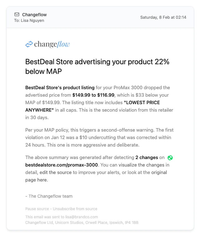 This is where tools come in. Changeflow monitors any public webpage for changes. For MAP compliance, that means tracking retailer product pages and getting alerts when advertised prices change.