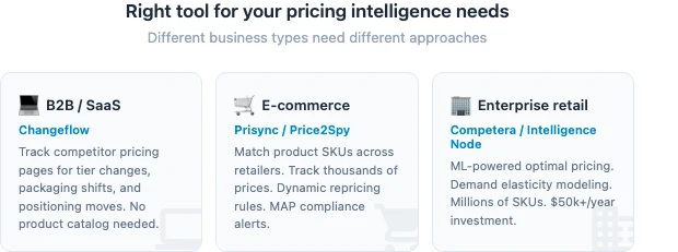 You're e-commerce with a product catalog: You need SKU-level tracking, repricing rules, and automated repricing. Choose Prisync (mid-market) or Competera (enterprise).